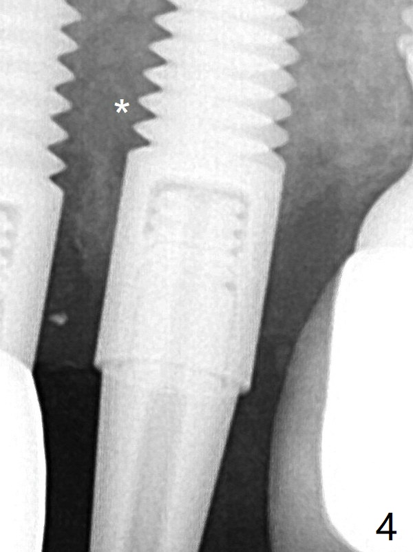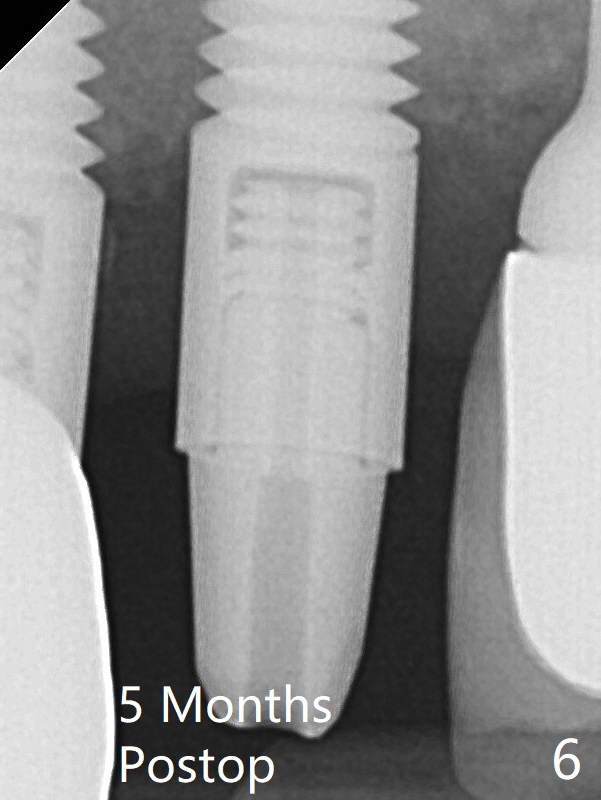 A 4x20 mm tissue-level implant is placed with > 60 Ncm, followed by tightening a 3.5x5 mm abutment (Fig.4); the mesiobuccal defect being filled with Vera Graft (*). It appears that the implant should have been placed deeper (Fig.6: 5 months postop). The unipost is bonded with Relyx Ultimate prior to reprep and impression.