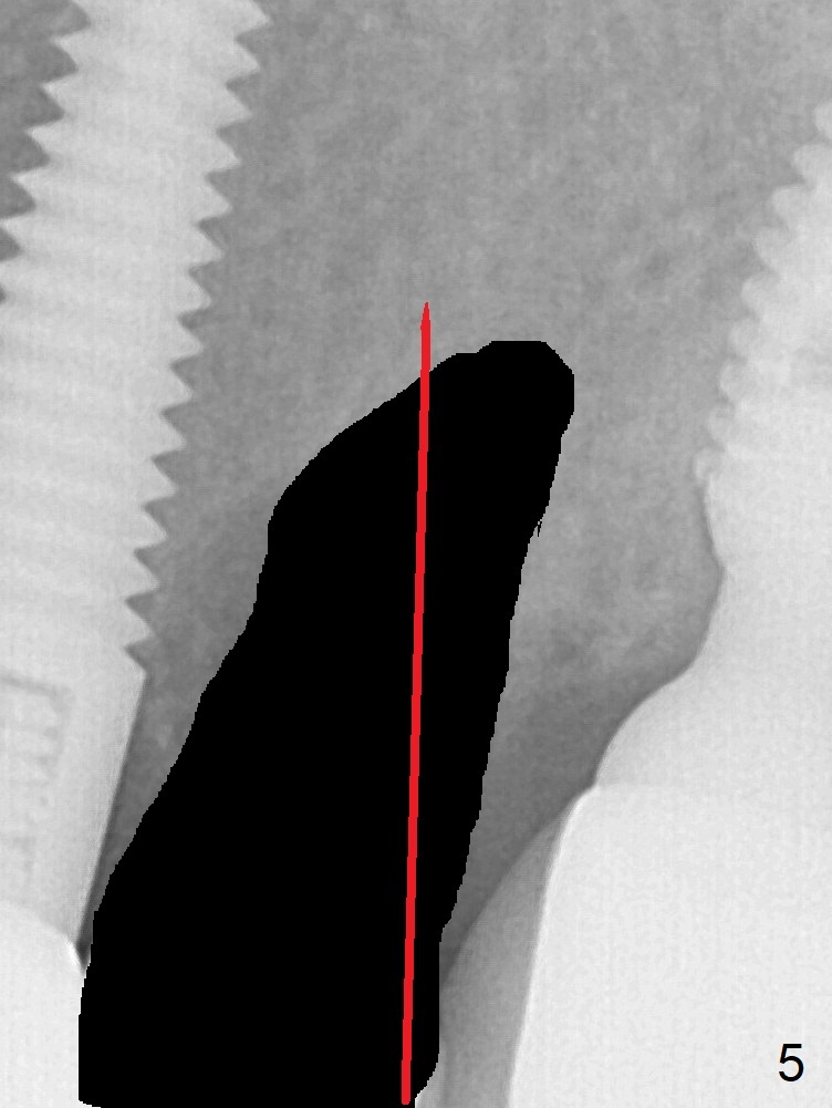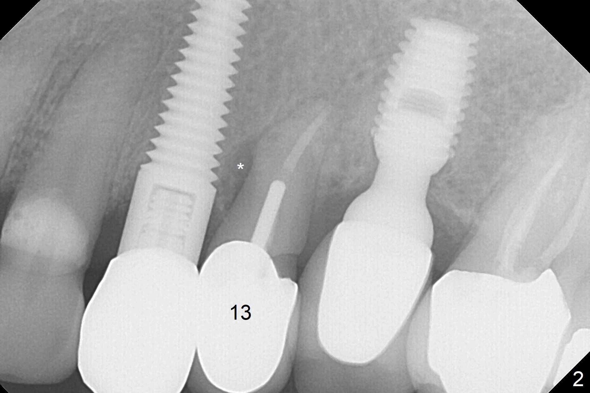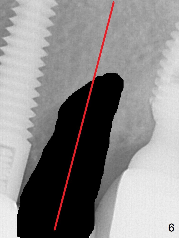 A 59-year-old woman has mild discomfort in the upper left quadrant, which is alleviated by salt water rinse. The buccal gingiva recedes at #13 with mesiobuccal swelling and deep pocket (Fig.1,3), corresponding to the mesial radiolucency (Fig.2 *). The tooth appears to have vertical fractured root, as related to the retention post. Since the root tip curves distal, the initial osteotomy (Fig.5 red) should be established in the mesioapical slope after extraction (black). Following initial entrance, the trajectory will be changed to the long axis of the space (Fig.6) with PA to be taken. Measure the depth of the buccal crest against the buccal, proximal and palatal gingival margins. Place an implant, the same as #12 (4.5x20 mm) unless the mesiobuccal defect is extremely large (UF).