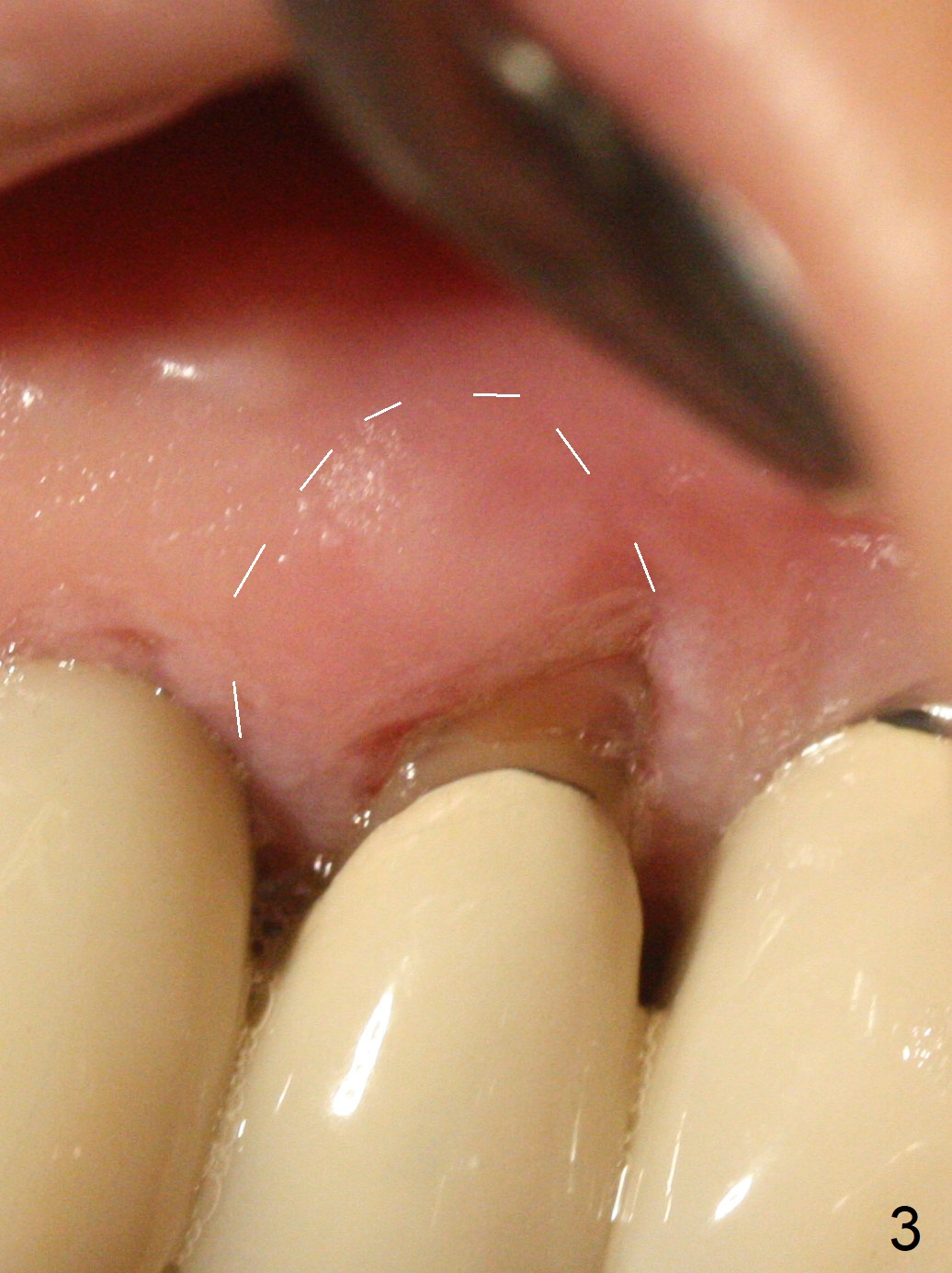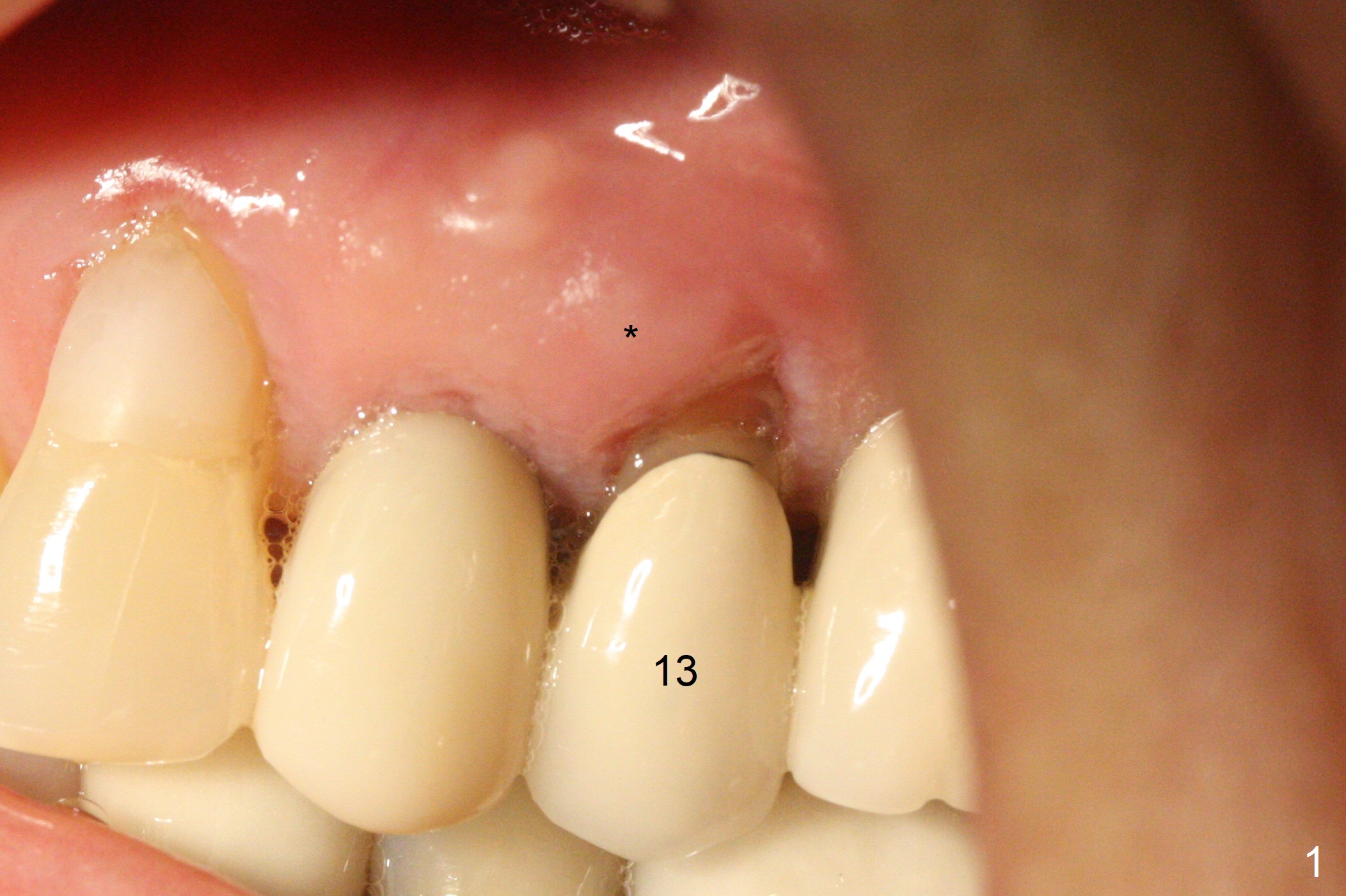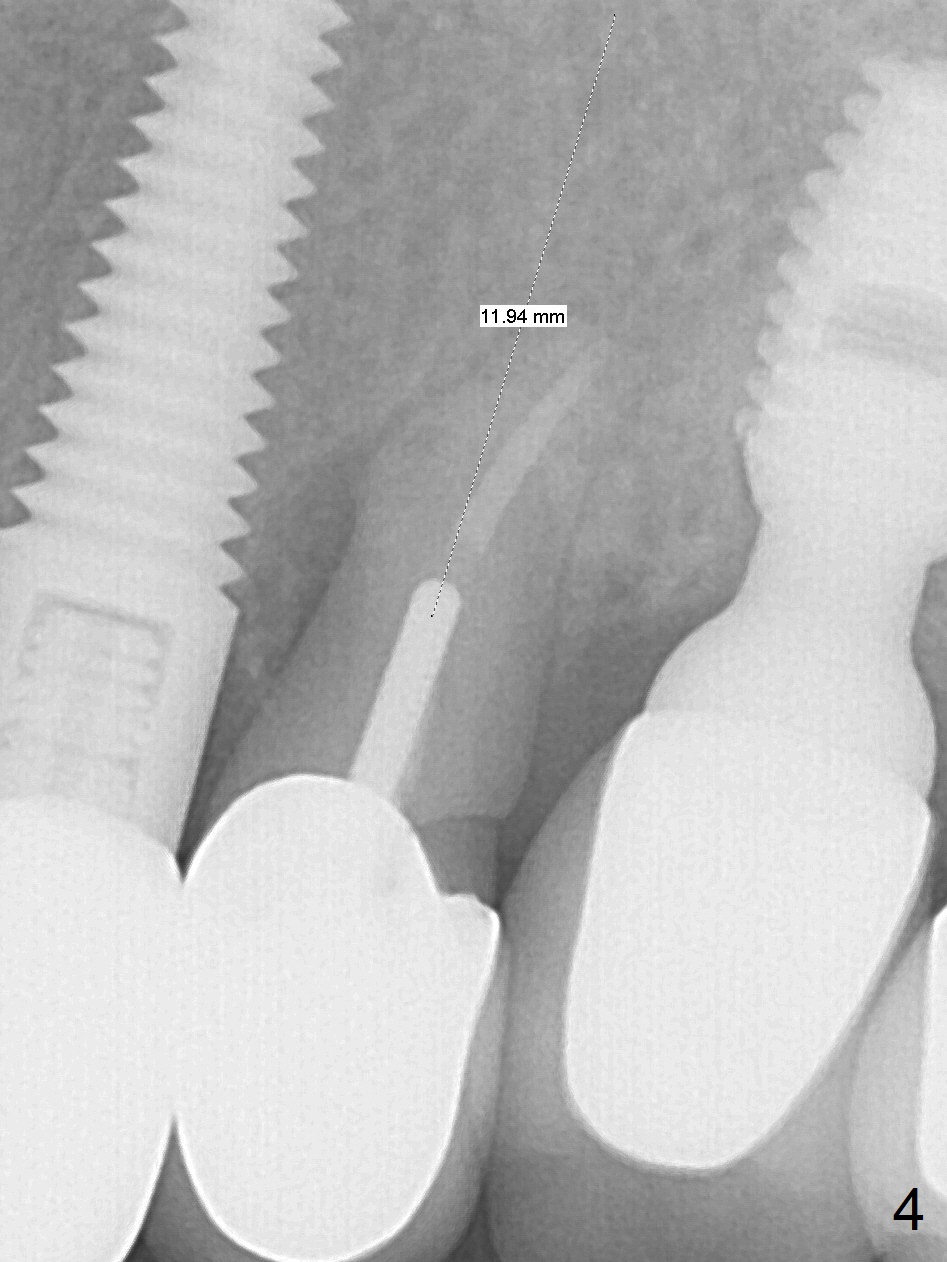 A 59-year-old woman has mild discomfort in the upper left quadrant, which is alleviated by salt water rinse. The buccal gingiva recedes at #13 with mesiobuccal swelling and deep pocket (Fig.1,3), corresponding to the mesial radiolucency (Fig.2 *). The tooth appears to have vertical fractured root, as related to the retention post. Since the root tip curves distal, the initial osteotomy (Fig.5 red) should be established in the mesioapical slope after extraction (black). Following initial entrance, the trajectory will be changed to the long axis of the space (Fig.6) with PA to be taken. Measure the depth of the buccal crest against the buccal, proximal and palatal gingival margins. Place an implant, the same as #12 (4.5x20 mm) unless the mesiobuccal defect is extremely large (UF).