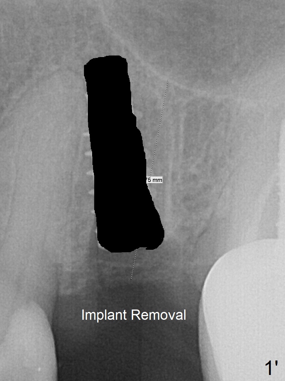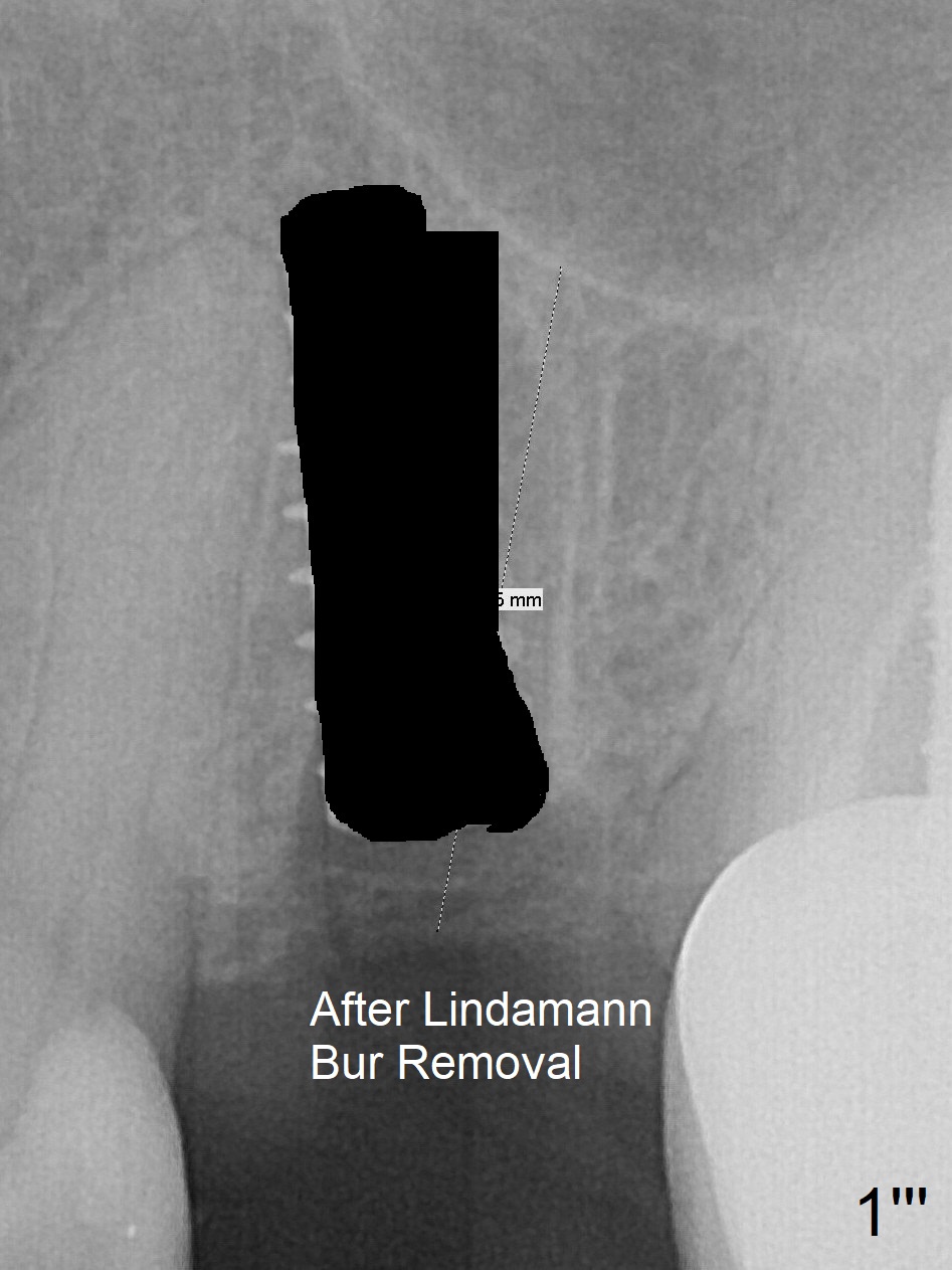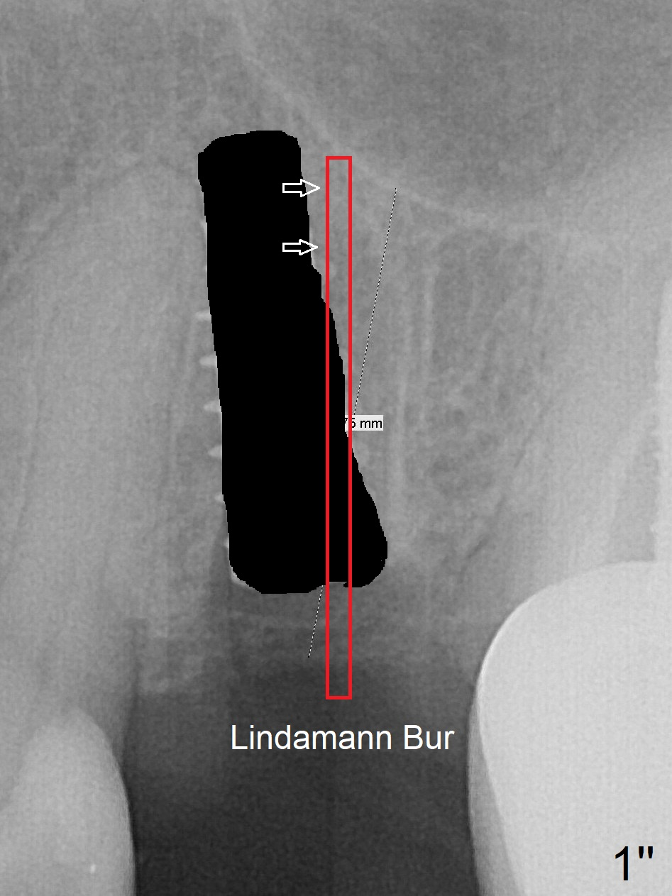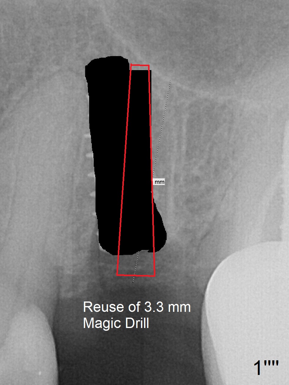 First, the implant is removed (Fig1'). Move the osteotomy distal by using Lindamann bur (Fig.1''). Remove the Lindamann bur (Fig.1'''). Reuse 3.3 m Magic Drill (Fig.1''''). After using Lindamann bur to move the osteotomy distal and reusing 3.3 mm drill, the trajectory of a 4.5x11 mm IBS dummy implant improves (Fig.2 with low stability).