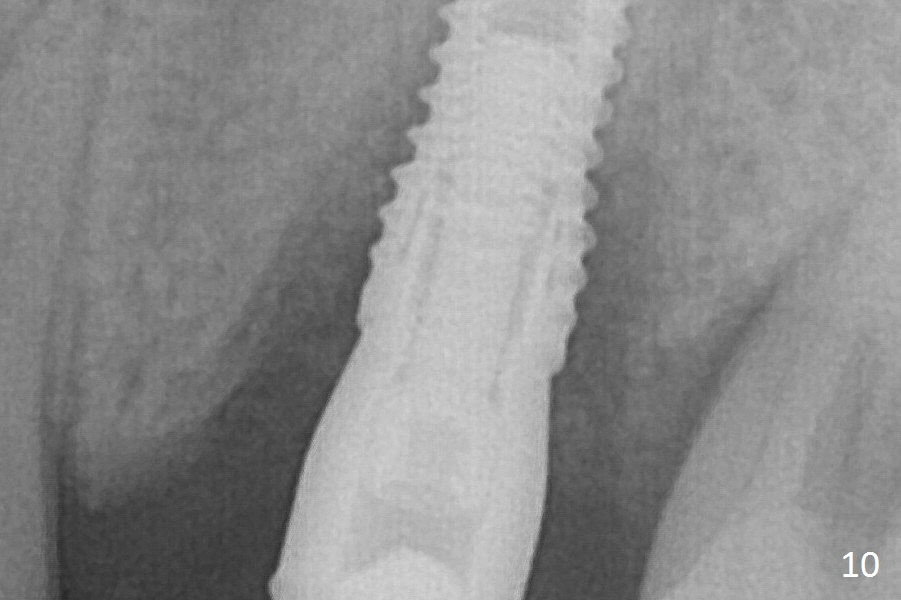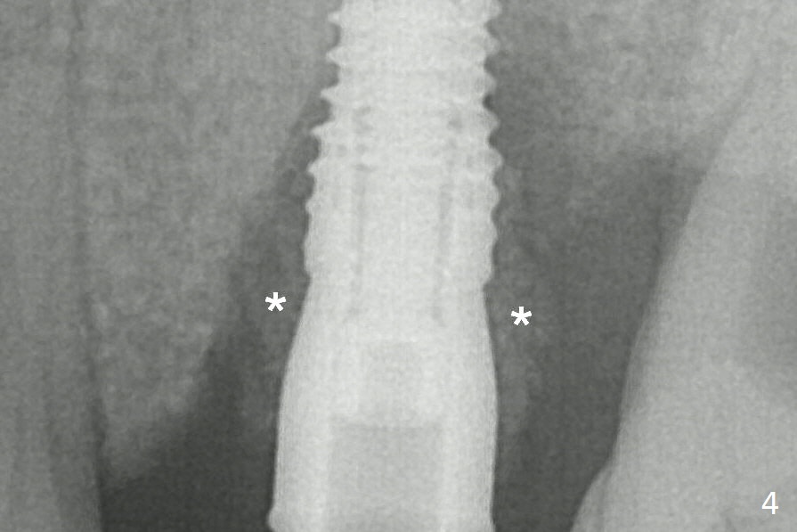 Bone Graft (Fig.4 *) is shown around the implant and a longer abutment (4.5x5.5(5) mm) after trimming. The graft cannot be pushed to the mesial surface of the tooth #14, probably due to the presence of the interdental papilla.