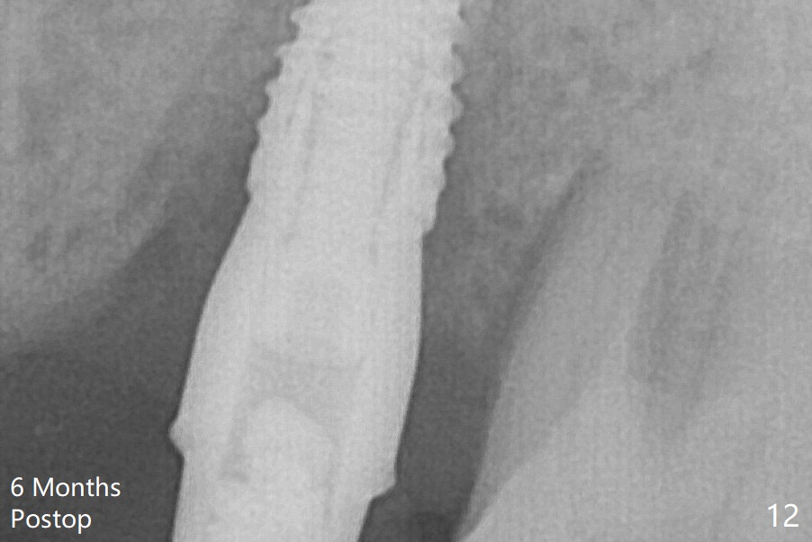 Bone density between #13 and 14 appears to increase 3 months postop (Fig.10). There seems to be more bone growth (i.e., decreasing gap) 6 months postop (Fig.12).
