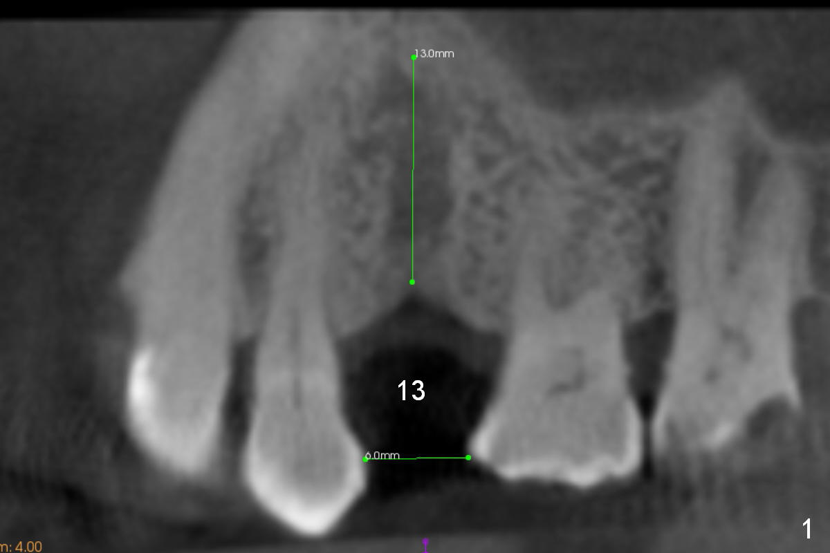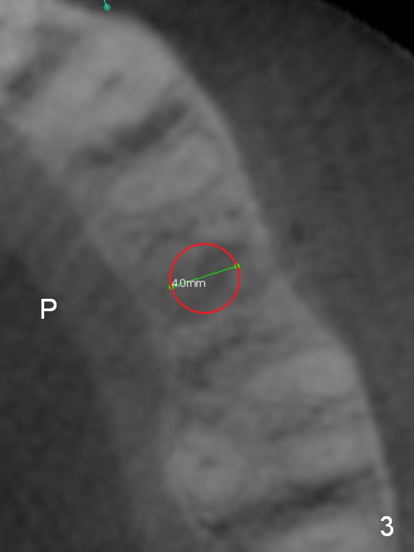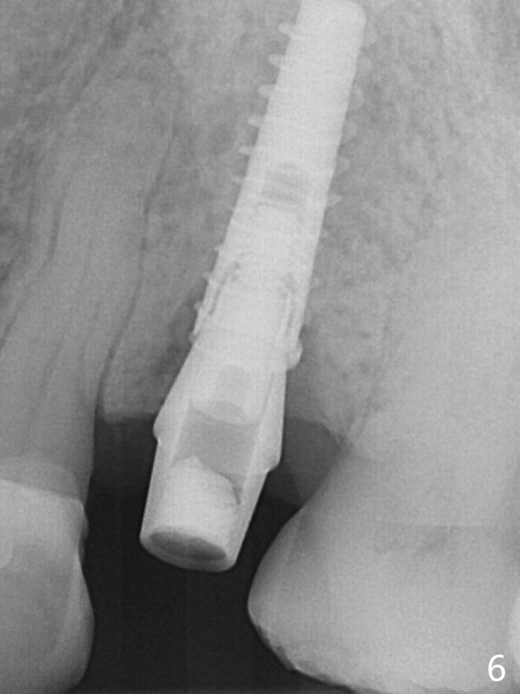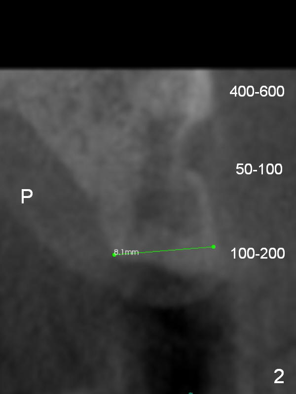 A 74-year-old man has diabetes. Implant osteointegration appears to be slow at #4, while the implant at #28 failed once. He requests implant at #13 (Fig.1). It seems that the bone is wide enough (8 mm, Fig.2 (CT coronal section) (P: palatal)) to hold a 4 mm implant (Fig.3 (axial section)). Since bone density is low at the coronal (100-200 units) and middle (50-100 units) segments (Fig.2), bone condensation will be beneficial. To facilitate wound healing, flapless approach is adopted using 1.6 mm pilot drill (Fig.4), followed by 1.4/2.6 mm bone expander. In fact there is resistance to expansion in the zone 1. Magic expander (3.0 mm) is also tried with difficulty. It appears that bone density is higher than expected. The second portion of Magic Surgical Kit is then used: 3.3 mm Magic Drill for 15 mm (gingival level, followed by Final Drill). A 4x13 mm IBS implant is seated incompletely. The osteotomy is further enlarged by 3.8 mm Magic Drill for 11 mm and deepened with 3 mm drill until 18 mm. Finally the implant is placed at a satisfactory level with insertion torque > 50 Ncm (Fig.5). A 4.5x4(3) mm abutment is placed and periodontal dressing is applied. The patient chooses to return for impression 6 months postop (Fig.6). The abutment changes to a 4x4(4) mm one. The crown is recemented nearly 2 years post cementation, which is related to distal and deep placement of the implant and bruxism (Fig.7).