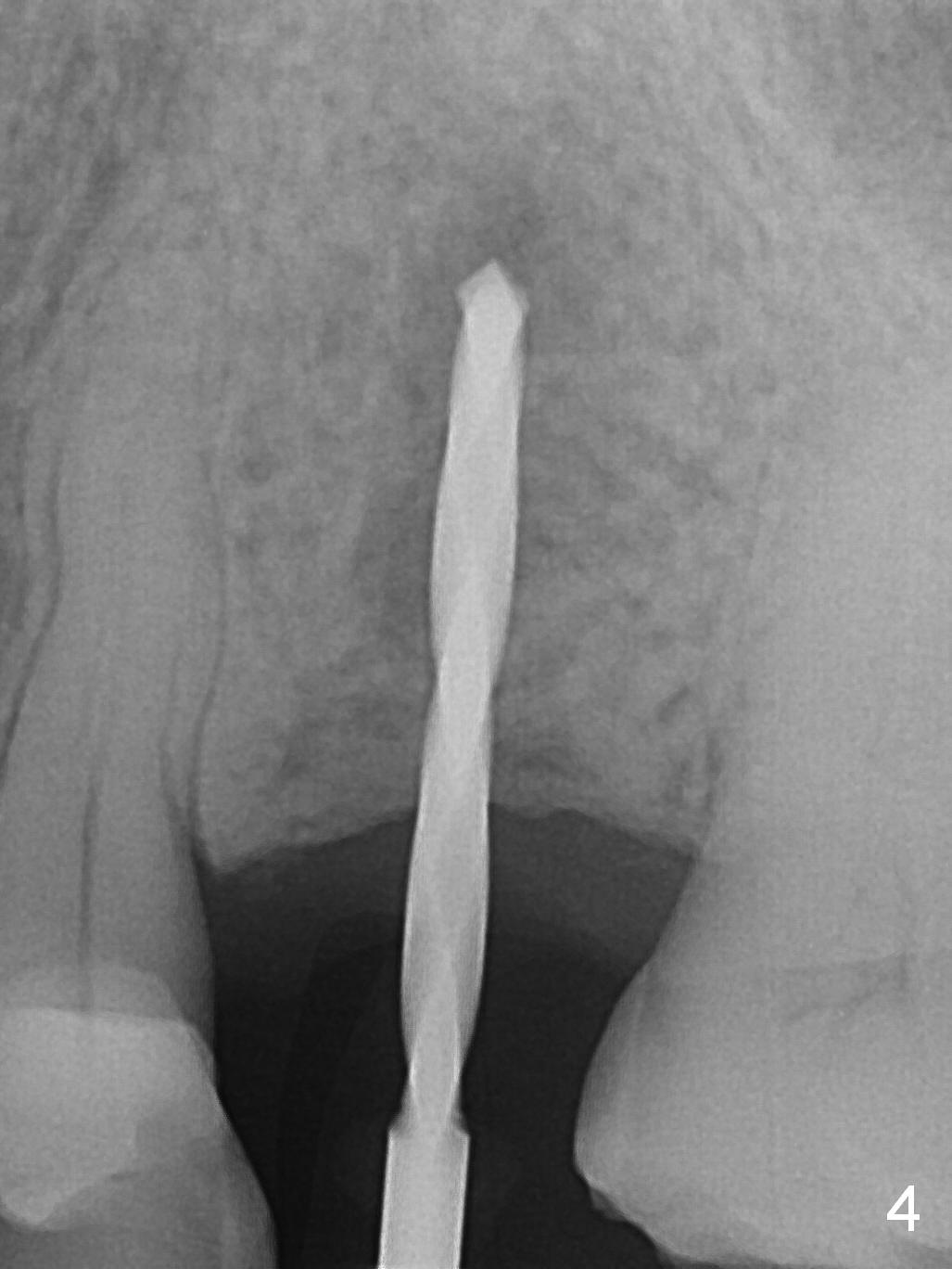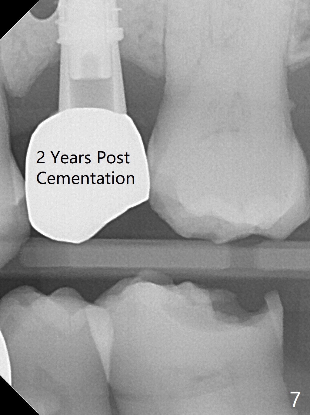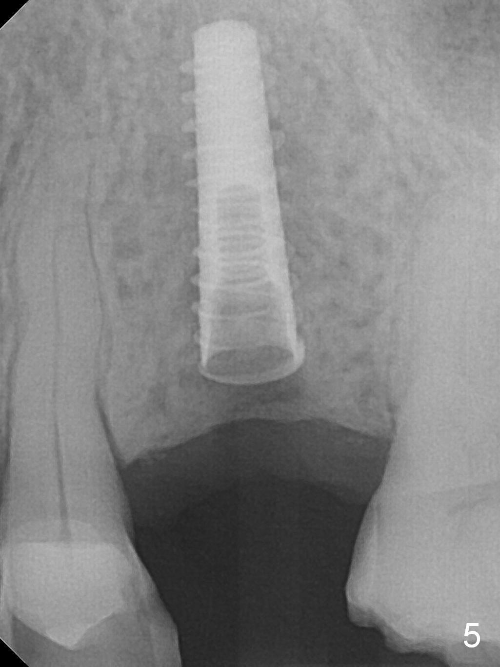 A 74-year-old man has diabetes. Implant osteointegration appears to be slow at #4, while the implant at #28 failed once. He requests implant at #13 (Fig.1). It seems that the bone is wide enough (8 mm, Fig.2 (CT coronal section) (P: palatal)) to hold a 4 mm implant (Fig.3 (axial section)). Since bone density is low at the coronal (100-200 units) and middle (50-100 units) segments (Fig.2), bone condensation will be beneficial. To facilitate wound healing, flapless approach is adopted using 1.6 mm pilot drill (Fig.4), followed by 1.4/2.6 mm bone expander. In fact there is resistance to expansion in the zone 1. Magic expander (3.0 mm) is also tried with difficulty. It appears that bone density is higher than expected. The second portion of Magic Surgical Kit is then used: 3.3 mm Magic Drill for 15 mm (gingival level, followed by Final Drill). A 4x13 mm IBS implant is seated incompletely. The osteotomy is further enlarged by 3.8 mm Magic Drill for 11 mm and deepened with 3 mm drill until 18 mm. Finally the implant is placed at a satisfactory level with insertion torque > 50 Ncm (Fig.5). A 4.5x4(3) mm abutment is placed and periodontal dressing is applied. The patient chooses to return for impression 6 months postop (Fig.6). The abutment changes to a 4x4(4) mm one. The crown is recemented nearly 2 years post cementation, which is related to distal and deep placement of the implant and bruxism (Fig.7).