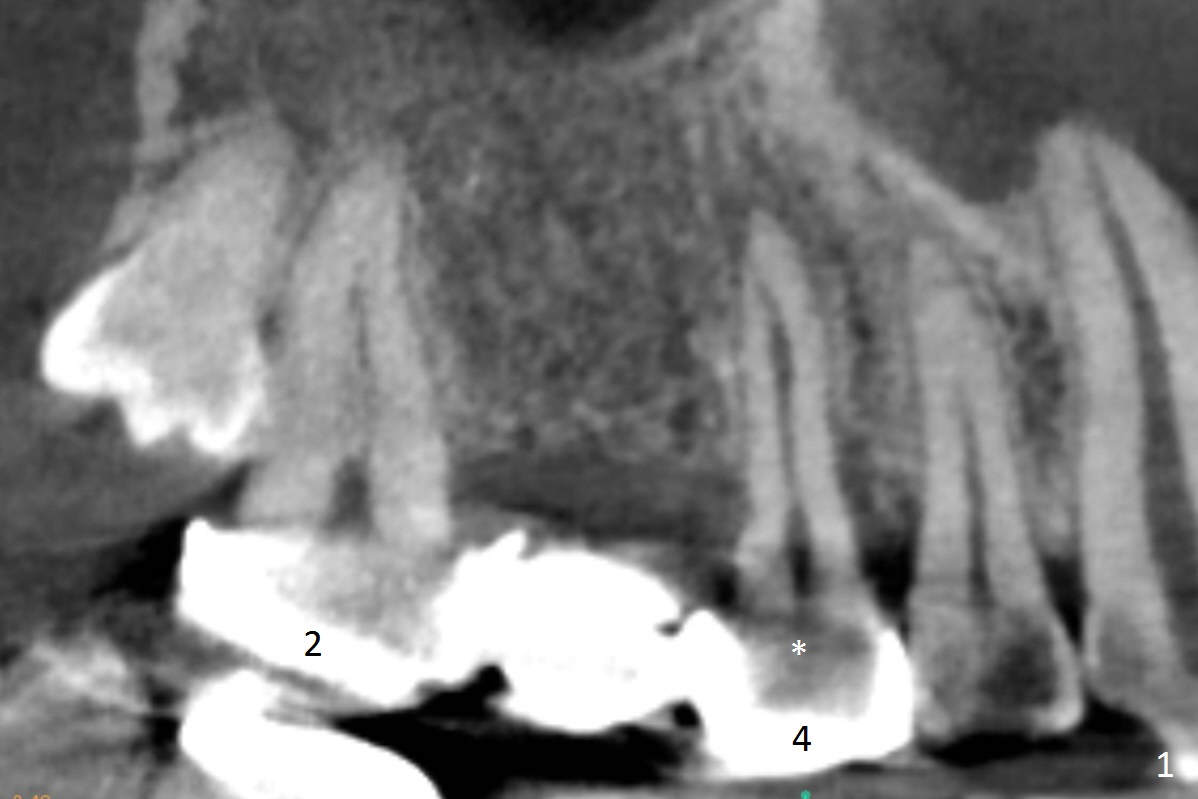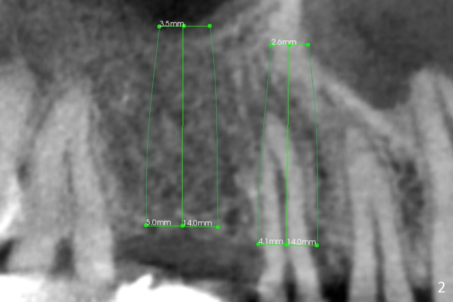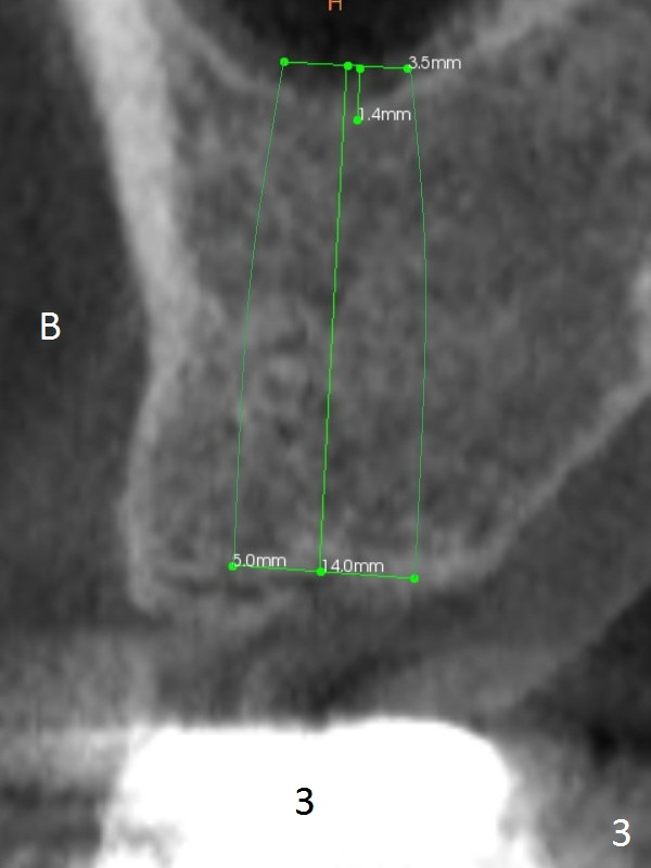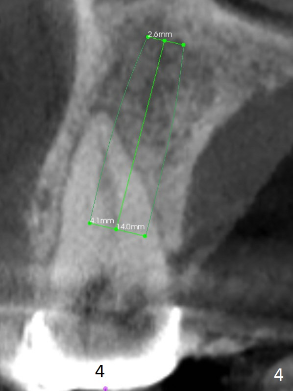 After implant at #19 and RCT at #14, the 36-year-old woman has discomfort in the upper right quadrant due to caries at #4 (Fig.1 *). After sectioning the bridge between #2 and 3, the retainer at #4 should be separated from the abutment by itself because of severe caries. Also examine the salvageability of #2. If the tooth #4 is nonsalvageable (Clindamycin), two implants will be placed at #3 and 4 (Fig.2-4). Since the ridge at #3 is wide (Fig.3, coronal section (B; buccal)), use Magic Split to start osteotomy, followed by Magic Expanders. The initial depth at #3 will be 12 mm and gradually increase to 14 mm. On the other hand, the bone density is higher at #4, drills will be used for osteotomy. Speed will be reduced at 50 RPM when the drills are more than 3.8 mm. Take intraop PAs as early as possible for trajectory confirmation.