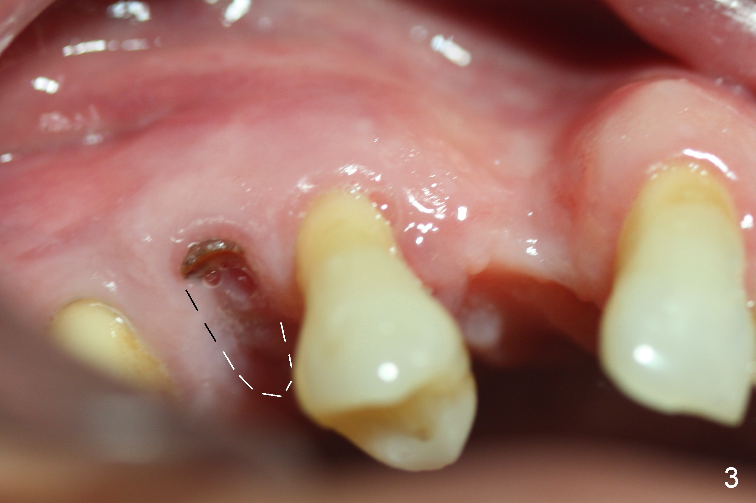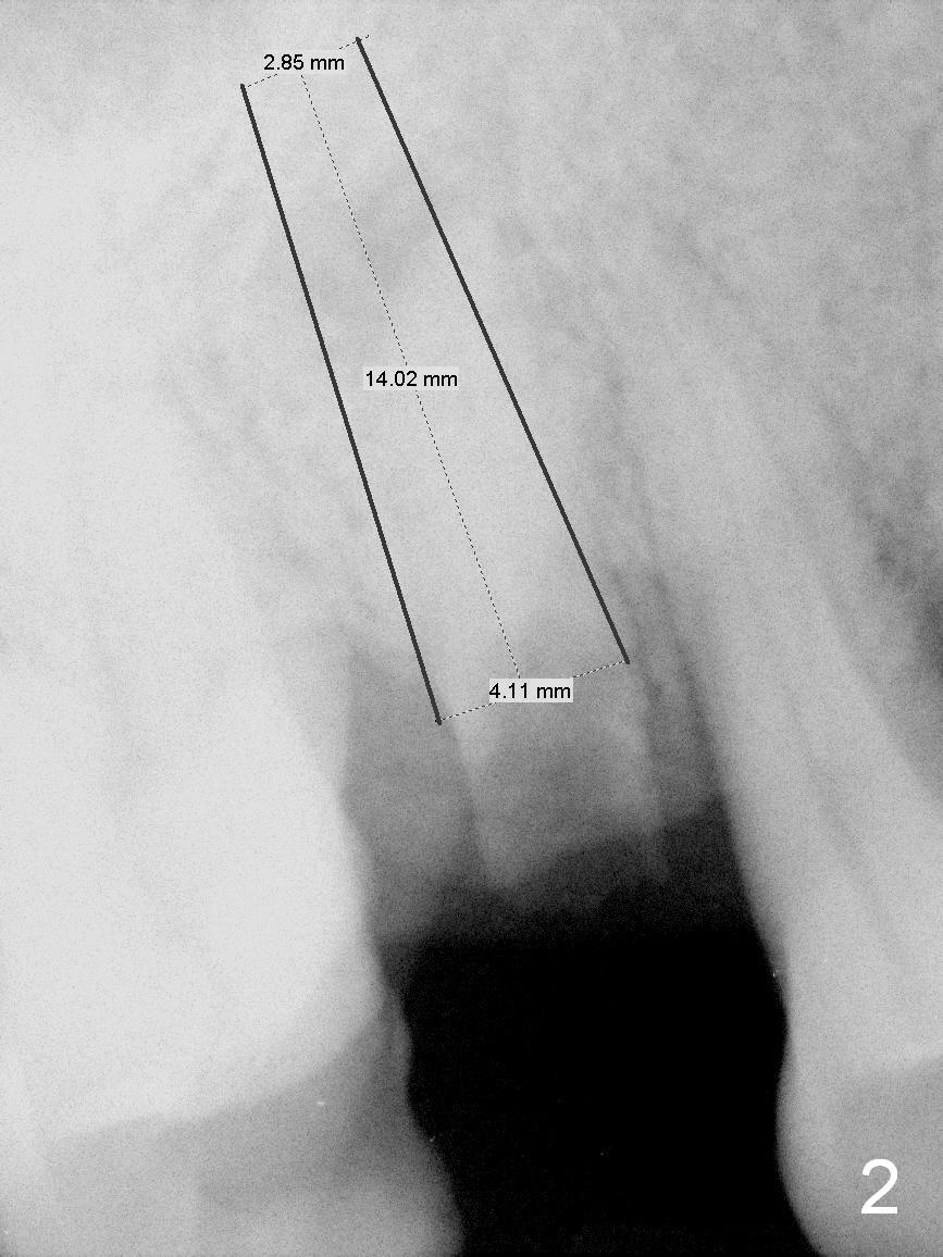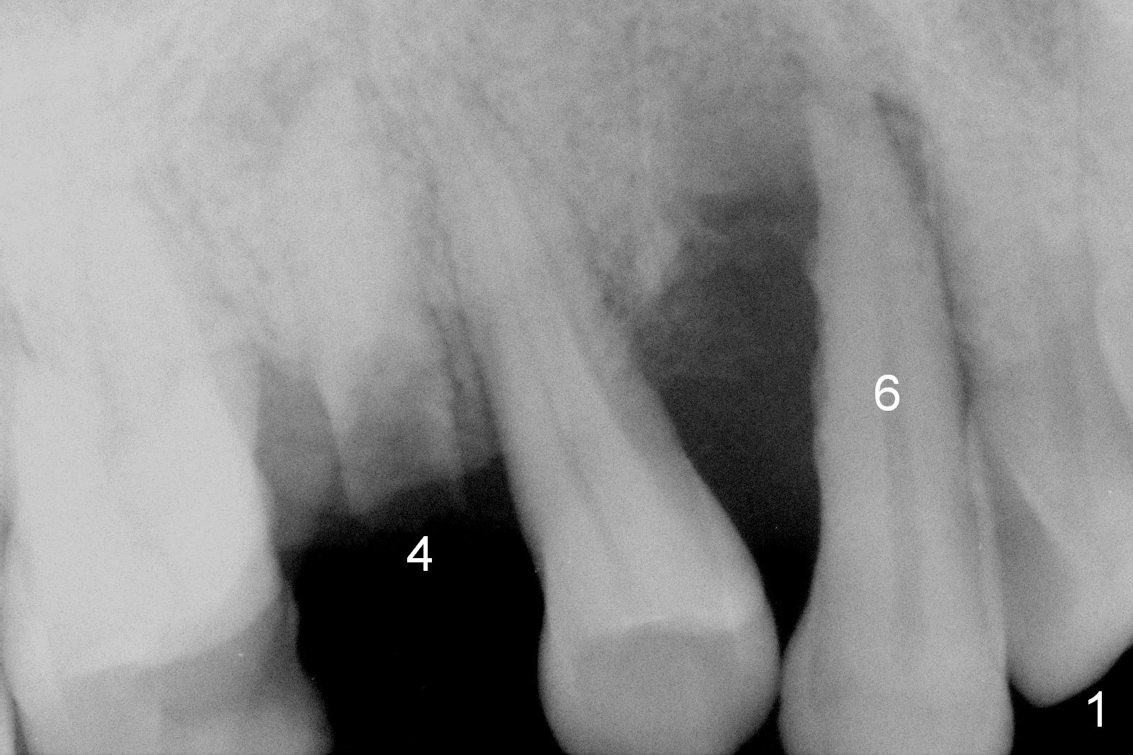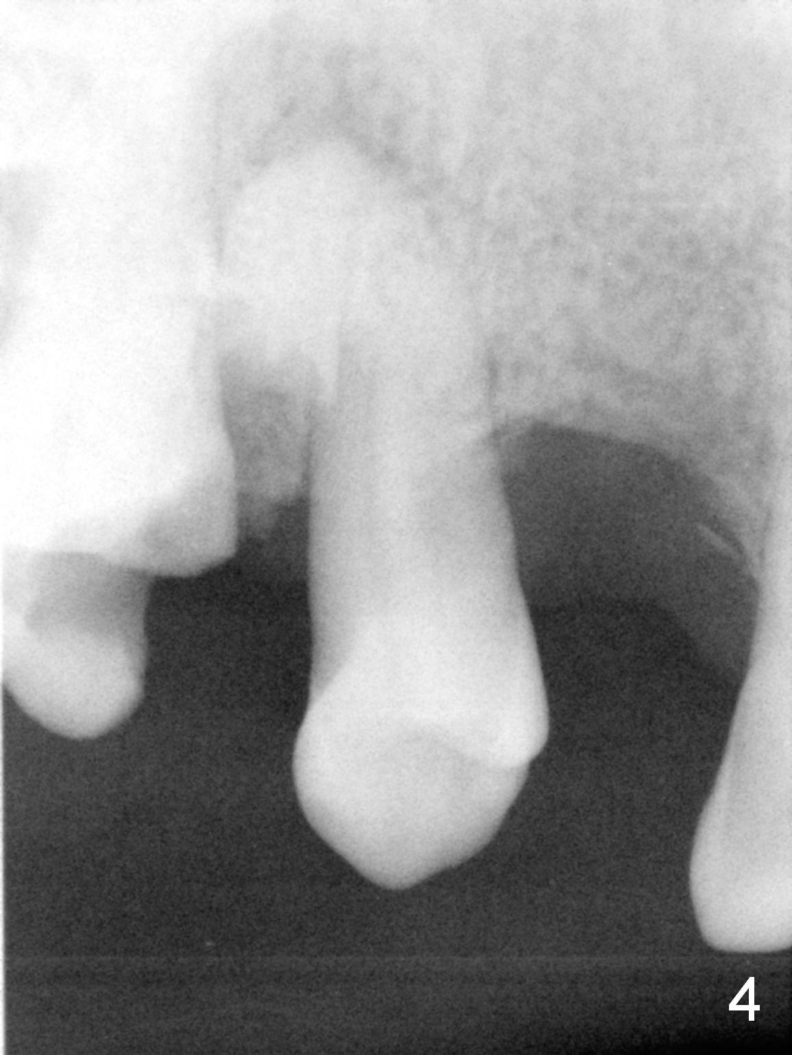 A 62-year-old man (CZ) has had chronic periodontitis. A month ago, five immediate implants were placed in the lower anterior region. Fig. 1 shows a PA taken 4 years ago: #4 residual root and #6 severe bone loss. A 4.1x14 mm bone-level implant is planned immediately after extraction (Fig.2). Clinically, the residual root is oval in shape (Fig.3 dashed line). The implant is placed as palatal as possible after socket treatment with 2% Xylocaine/1:50,000 Epinephrine (Fig.4). In addition, the osteotomy may have to be established in the distal wall, since the root tip tilts mesially (Fig.1). Take the 1st intraop PA after 2 mm pilot drill.