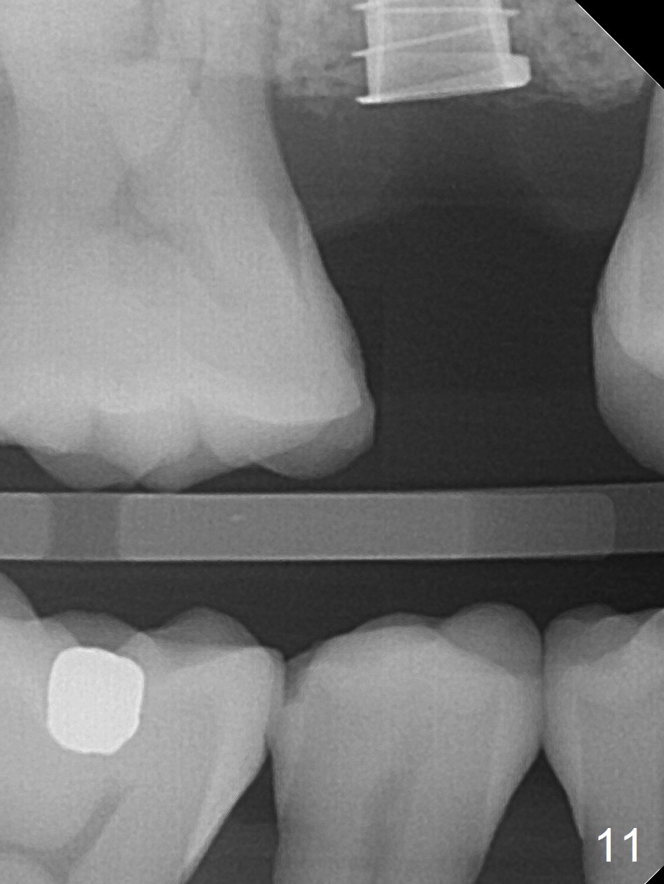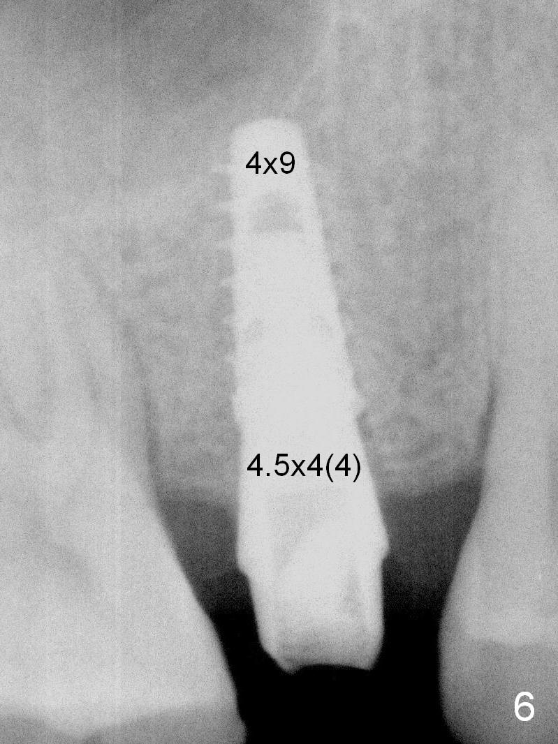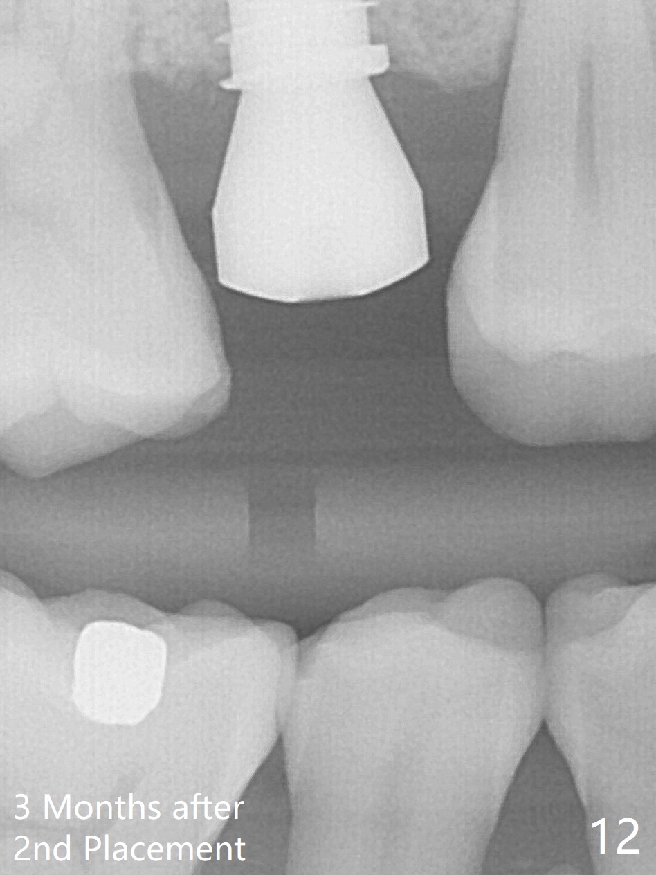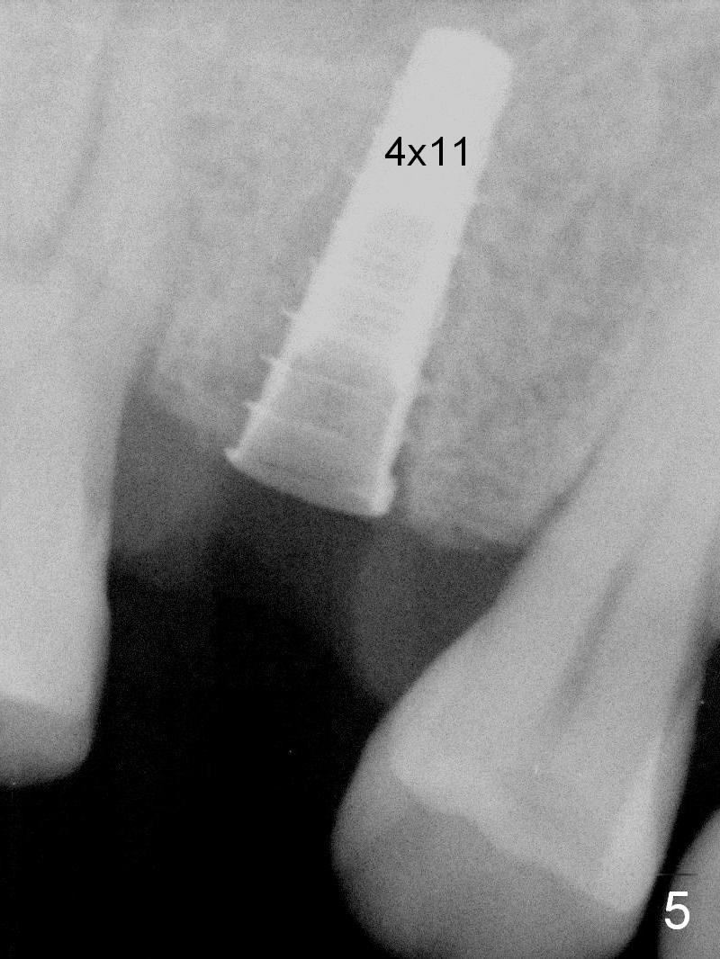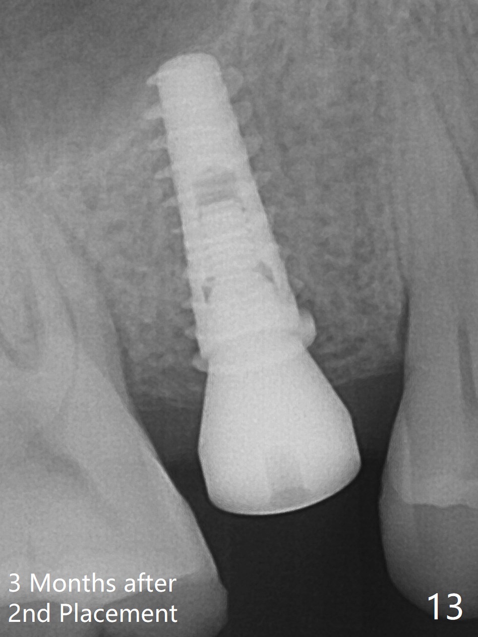 A 47-year-old man returns emergently with subgingival fracture of the lingual (L) cusp of the tooth #4 (Fig.1-3). After extraction (no bony defect) without drilling, a 4x11 mm dummy implant is placed as a tap drill with satisfactory stability (Fig.4,5). To get subcrestal placement, a shorter (4x9 mm) implant is inserted with insertion torque of < 35 Ncm. In retrospect, a larger implant (4.5 mm) would be better in term of primary stability. After allograft placement into the buccal and lingual gaps, a 4.5x4(4) mm abutment is placed for an immediate provisional. There is a peri-implant gap 7 months postop (Fig.7<, as compared to the implant at #2 (6 months postop)) . When the loose abutment is being retightened, the patient feels pain, although the gingiva appears healthy (Fig.8). A larger implant should have been used; the abutment should have been removed. The implant dislodges while the abutment is untightened 8 months postop. The osteotomy is found intact. A 4.5x11 mm dummy implant is placed 2 mm subgingival with 20 Ncm (Fig.9). When a 4.5x11 mm definitive implant is placed 3 mm subgingival (Fig.10,11), torque reaches 50 Ncm. A 5.5x3 mm healing abutment is placed. Three months postop, the implant is stable (Fig.12,13) and impression is taken.