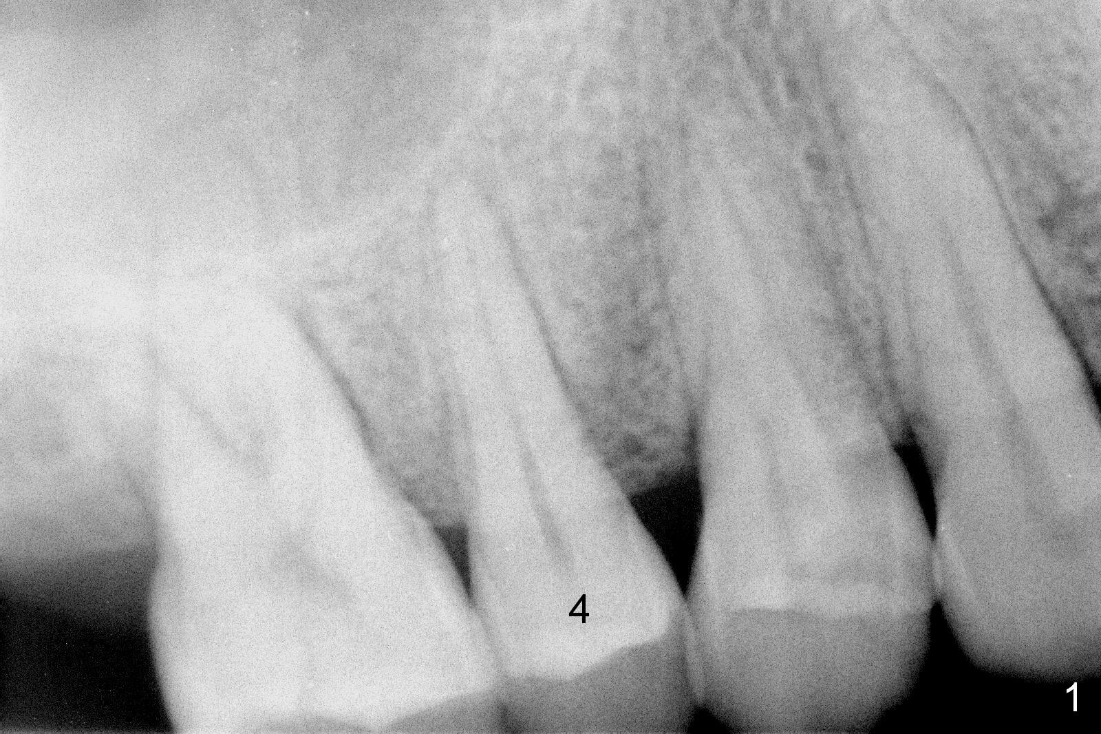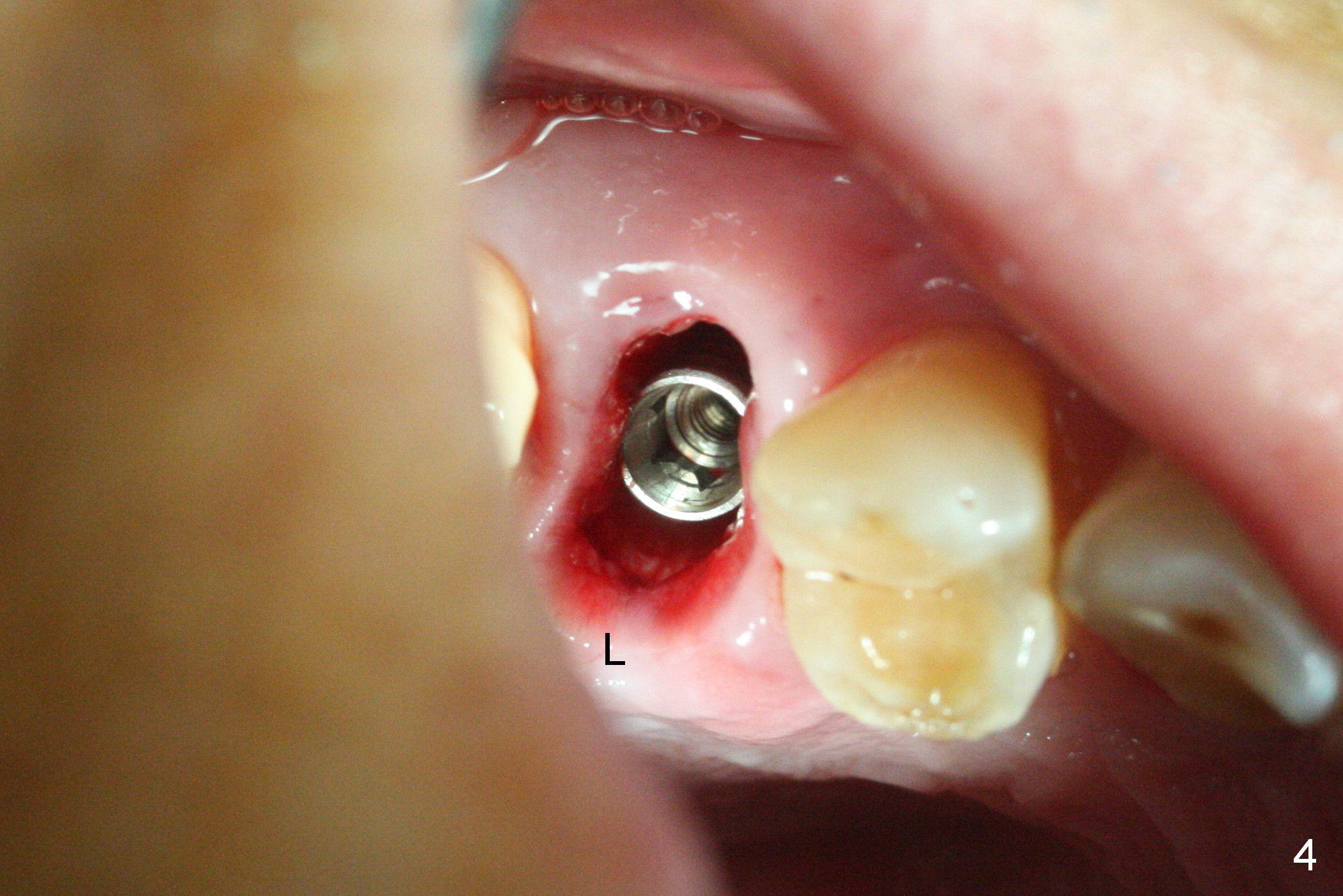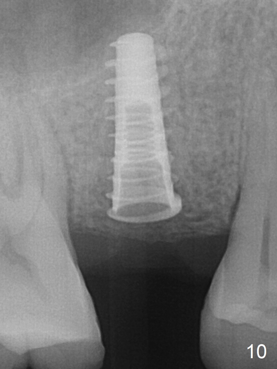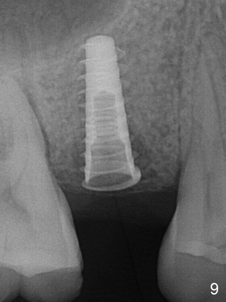 A 47-year-old man returns emergently with subgingival fracture of the lingual (L) cusp of the tooth #4 (Fig.1-3). After extraction (no bony defect) without drilling, a 4x11 mm dummy implant is placed as a tap drill with satisfactory stability (Fig.4,5). To get subcrestal placement, a shorter (4x9 mm) implant is inserted with insertion torque of < 35 Ncm. In retrospect, a larger implant (4.5 mm) would be better in term of primary stability. After allograft placement into the buccal and lingual gaps, a 4.5x4(4) mm abutment is placed for an immediate provisional. There is a peri-implant gap 7 months postop (Fig.7<, as compared to the implant at #2 (6 months postop)) . When the loose abutment is being retightened, the patient feels pain, although the gingiva appears healthy (Fig.8). A larger implant should have been used; the abutment should have been removed. The implant dislodges while the abutment is untightened 8 months postop. The osteotomy is found intact. A 4.5x11 mm dummy implant is placed 2 mm subgingival with 20 Ncm (Fig.9). When a 4.5x11 mm definitive implant is placed 3 mm subgingival (Fig.10,11), torque reaches 50 Ncm. A 5.5x3 mm healing abutment is placed. Three months postop, the implant is stable (Fig.12,13) and impression is taken.
