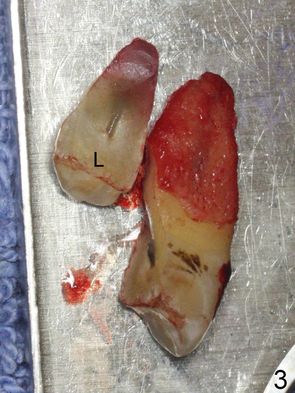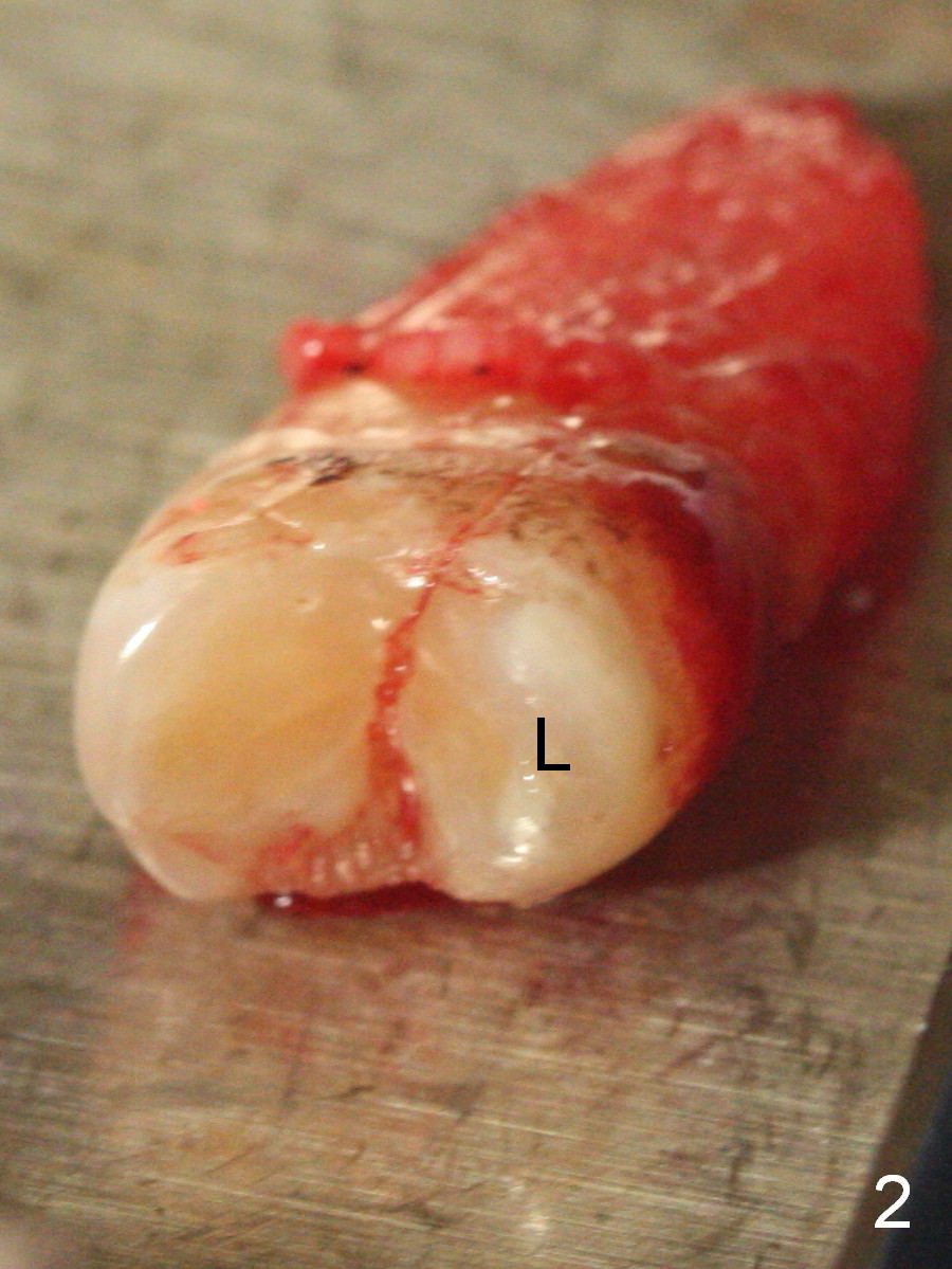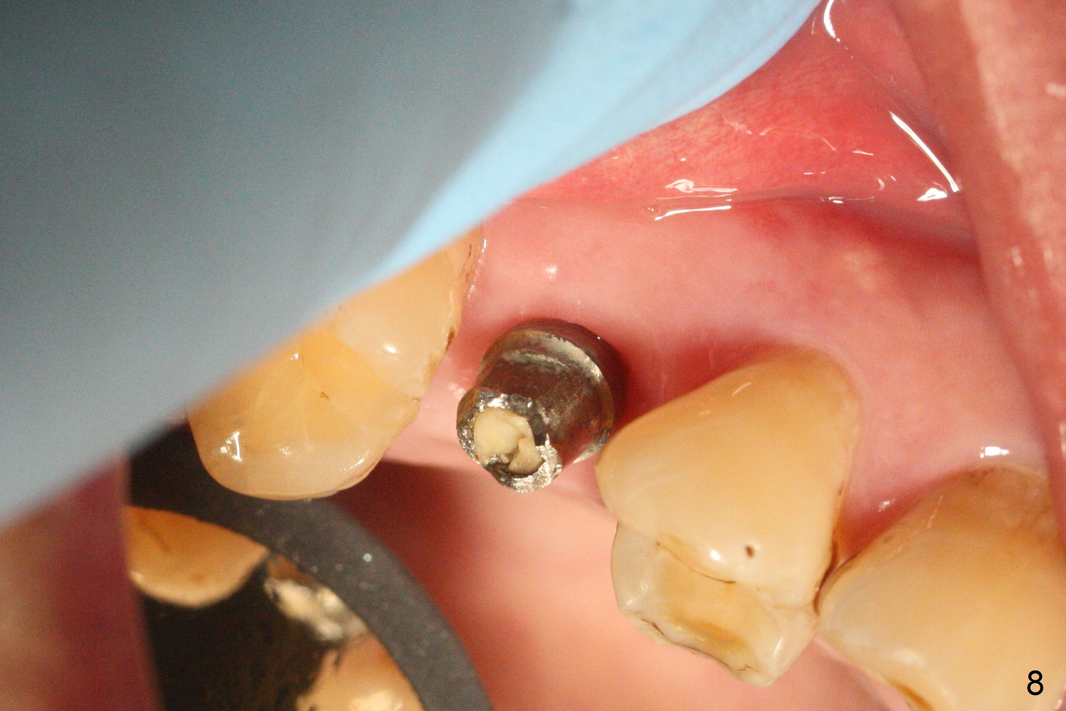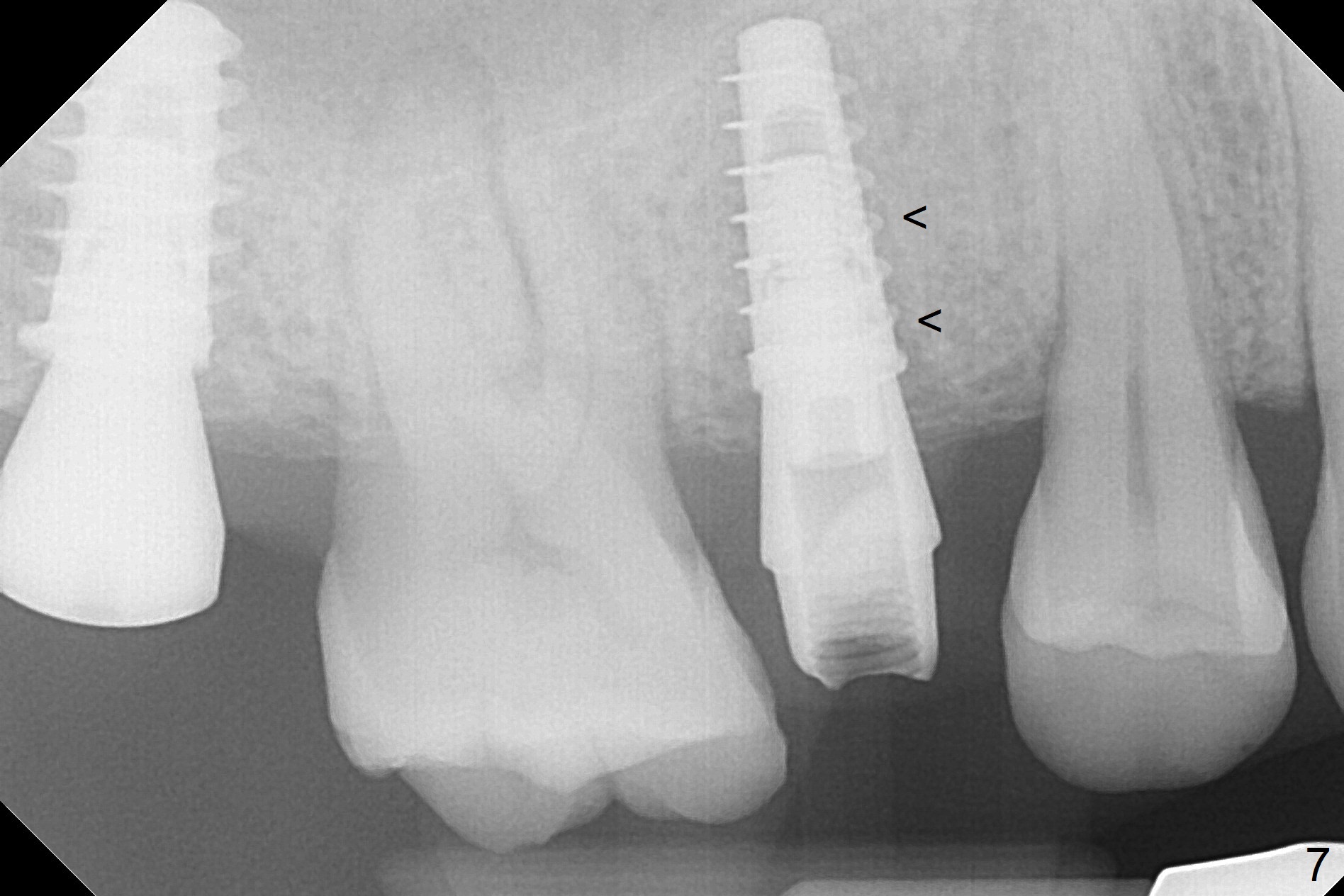 A 47-year-old man returns emergently with subgingival fracture of the lingual (L) cusp of the tooth #4 (Fig.1-3). After extraction (no bony defect) without drilling, a 4x11 mm dummy implant is placed as a tap drill with satisfactory stability (Fig.4,5). To get subcrestal placement, a shorter (4x9 mm) implant is inserted with insertion torque of < 35 Ncm. In retrospect, a larger implant (4.5 mm) would be better in term of primary stability. After allograft placement into the buccal and lingual gaps, a 4.5x4(4) mm abutment is placed for an immediate provisional. There is a peri-implant gap 7 months postop (Fig.7<, as compared to the implant at #2 (6 months postop)) . When the loose abutment is being retightened, the patient feels pain, although the gingiva appears healthy (Fig.8). A larger implant should have been used; the abutment should have been removed. The implant dislodges while the abutment is untightened 8 months postop. The osteotomy is found intact. A 4.5x11 mm dummy implant is placed 2 mm subgingival with 20 Ncm (Fig.9). When a 4.5x11 mm definitive implant is placed 3 mm subgingival (Fig.10,11), torque reaches 50 Ncm. A 5.5x3 mm healing abutment is placed. Three months postop, the implant is stable (Fig.12,13) and impression is taken.