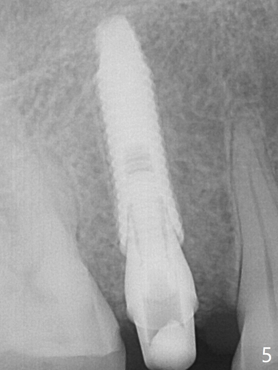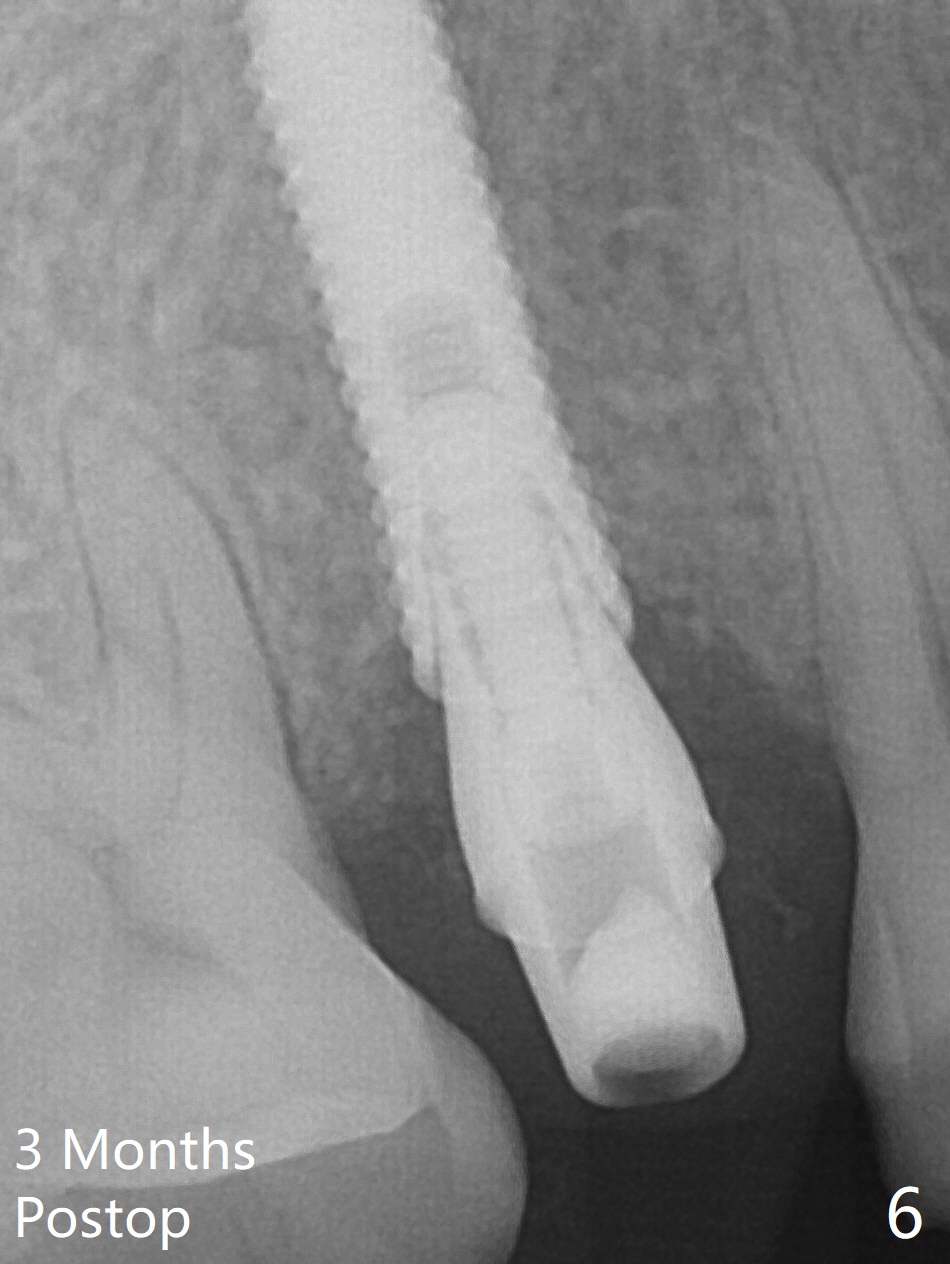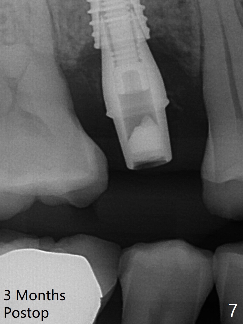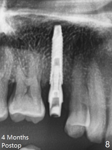 A 61-year-old man cracks the tooth #4 while chewing on a piece of chicken bone (Fig.1,2). Initial osteotomy appears to be able to hold a 16 mm long implant (Fig.3). After sequential osteotomy, a 4x16 mm implant is initially unable to be seated low enough for the buccal crest. Following packing the osteotomy with Vanilla Graft (.5-1 mm) and additional 2-3 mm depth of osteotomy, the implant is placed slightly apical to the buccal crest (Fig.4,5); with placement of Vanilla Graft (*) and a 4.5x4(4) mm abutment, an immediate provisional is fabricated to close the socket. The provisional is removed 3 months postop because of poor local oral hygiene (Fig.6,7). The gingiva is healthy 2-3 weeks later; it is easy to take impression (Fig.8).
