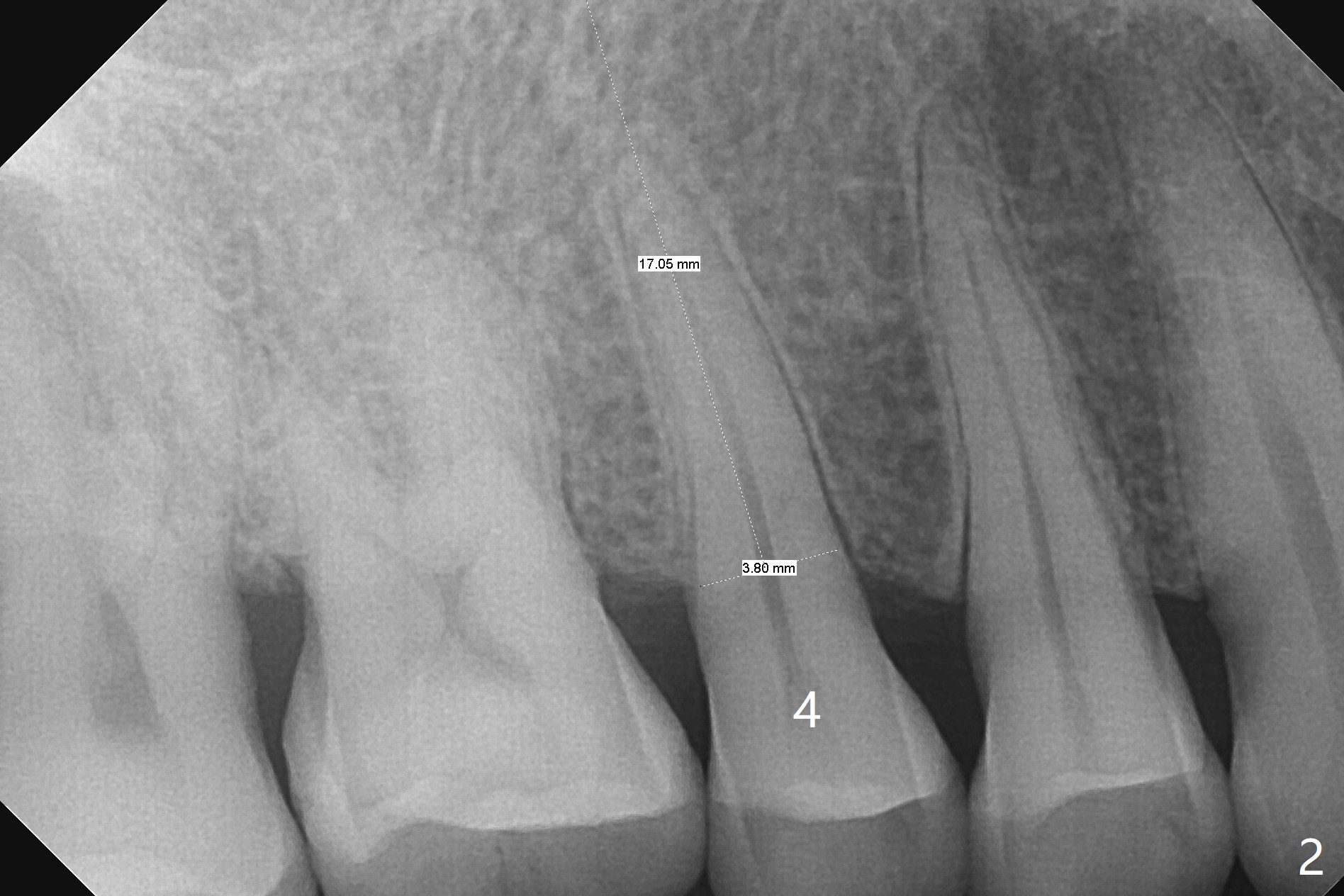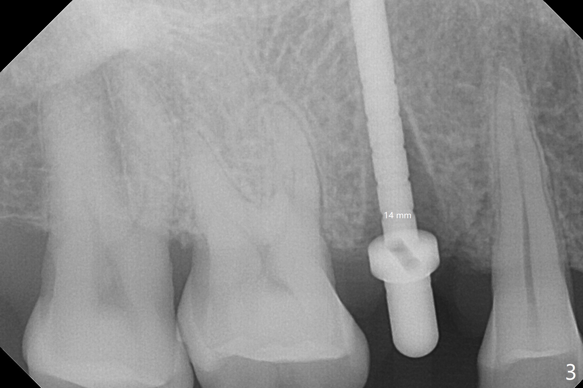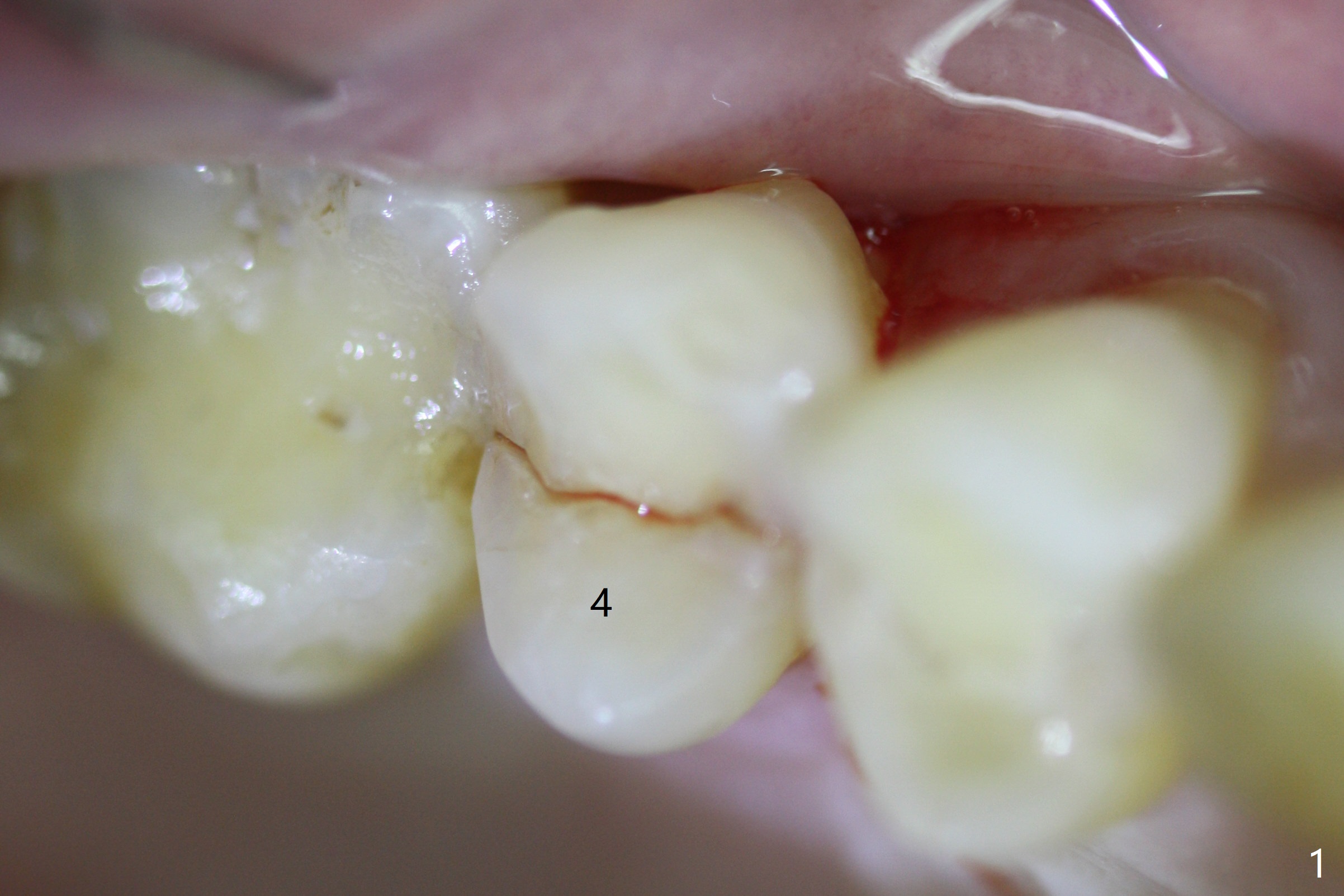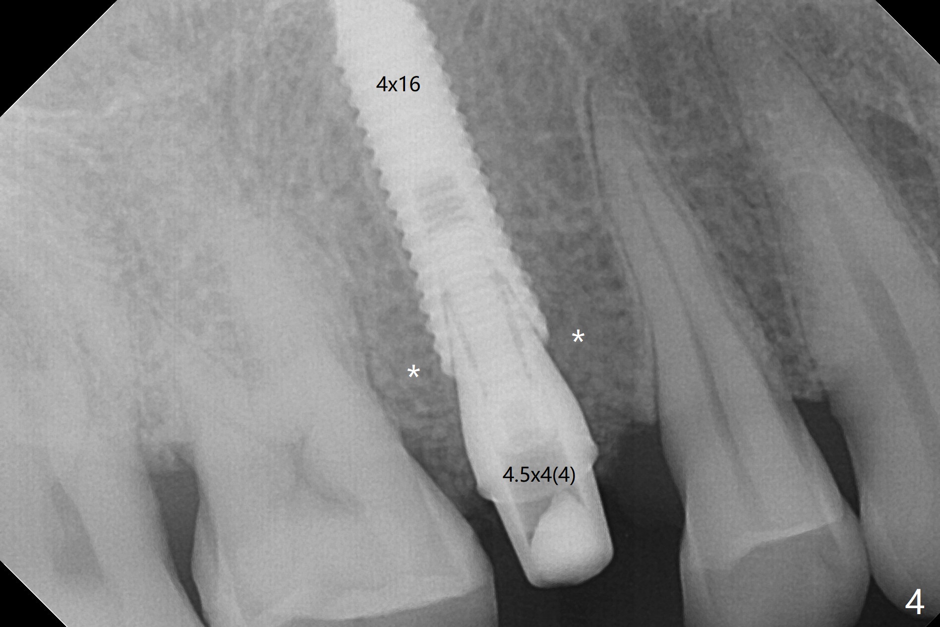 A 61-year-old man cracks the tooth #4 while chewing on a piece of chicken bone (Fig.1,2). Initial osteotomy appears to be able to hold a 16 mm long implant (Fig.3). After sequential osteotomy, a 4x16 mm implant is initially unable to be seated low enough for the buccal crest. Following packing the osteotomy with Vanilla Graft (.5-1 mm) and additional 2-3 mm depth of osteotomy, the implant is placed slightly apical to the buccal crest (Fig.4,5); with placement of Vanilla Graft (*) and a 4.5x4(4) mm abutment, an immediate provisional is fabricated to close the socket. The provisional is removed 3 months postop because of poor local oral hygiene (Fig.6,7). The gingiva is healthy 2-3 weeks later; it is easy to take impression (Fig.8).