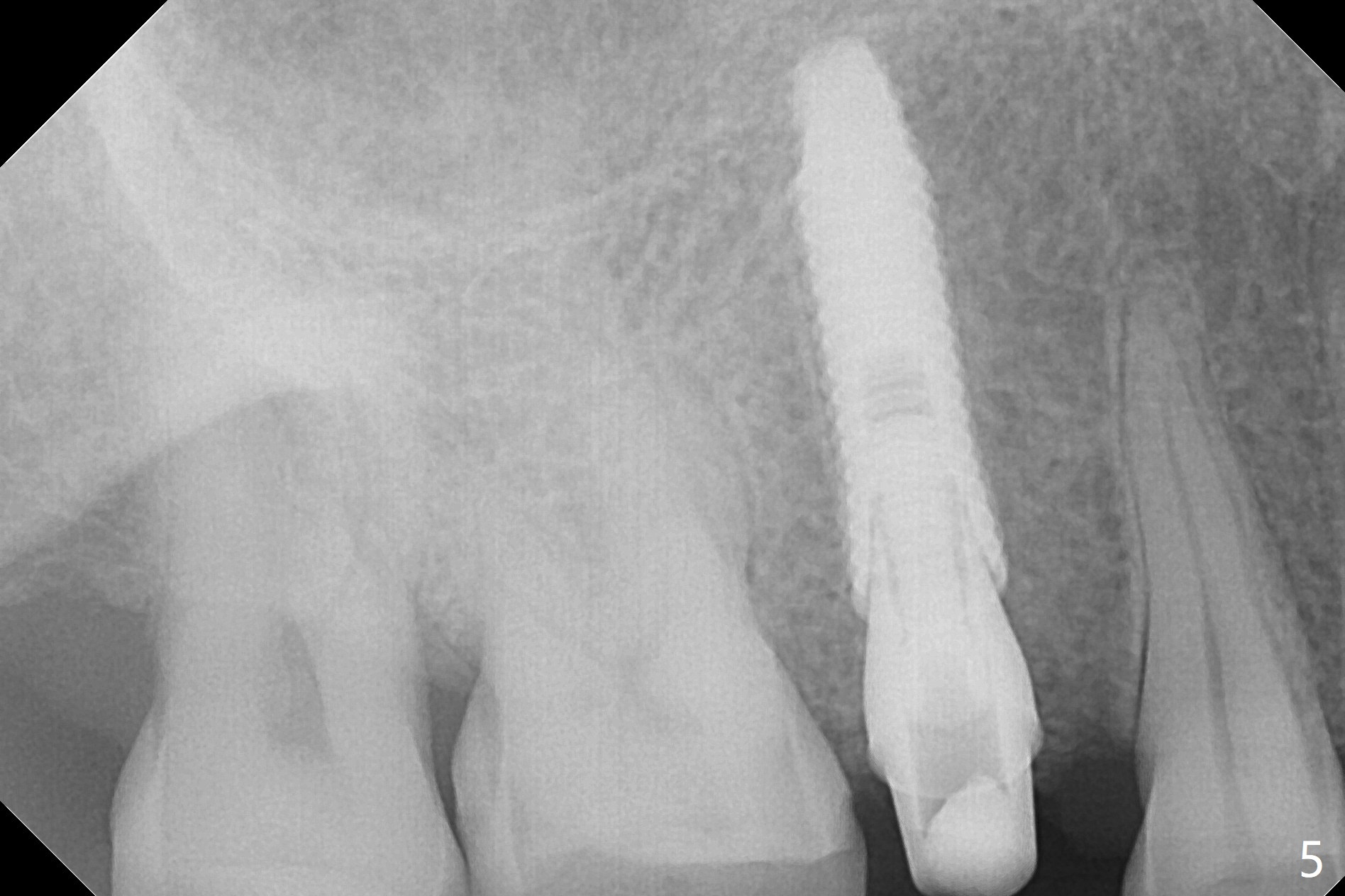 After sequential osteotomy, a 4x16 mm implant is initially unable to be seated low enough for the buccal crest. Following packing the osteotomy with Vanilla Graft (.5-1 mm) and additional 2-3 mm depth of osteotomy with 3 mm reamer, the implant is placed slightly apical to the buccal crest (Fig.4,5, ~35 Ncm); with placement of Vanilla Graft (*) and a 4.5x4(4) mm abutment, an immediate provisional is fabricated to close the socket. In fact the long implant has not penetrated the sinus floor (Fig.8 (from panoramic X-ray)).