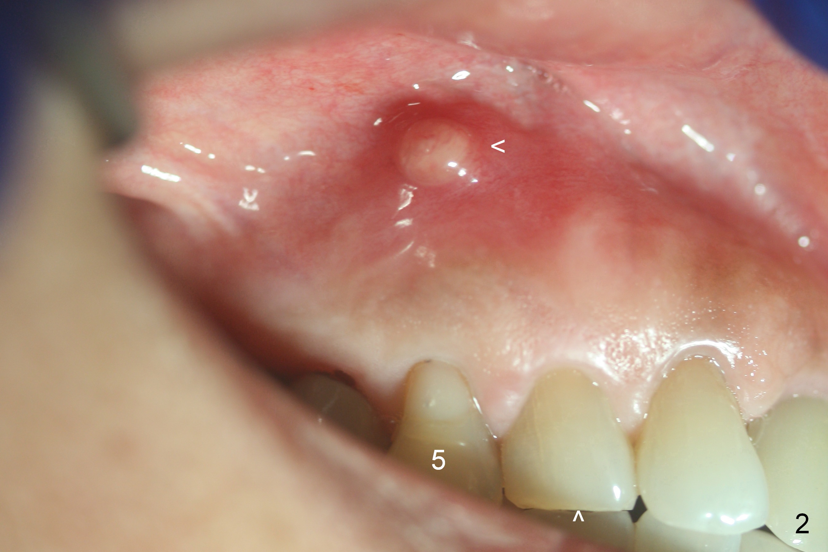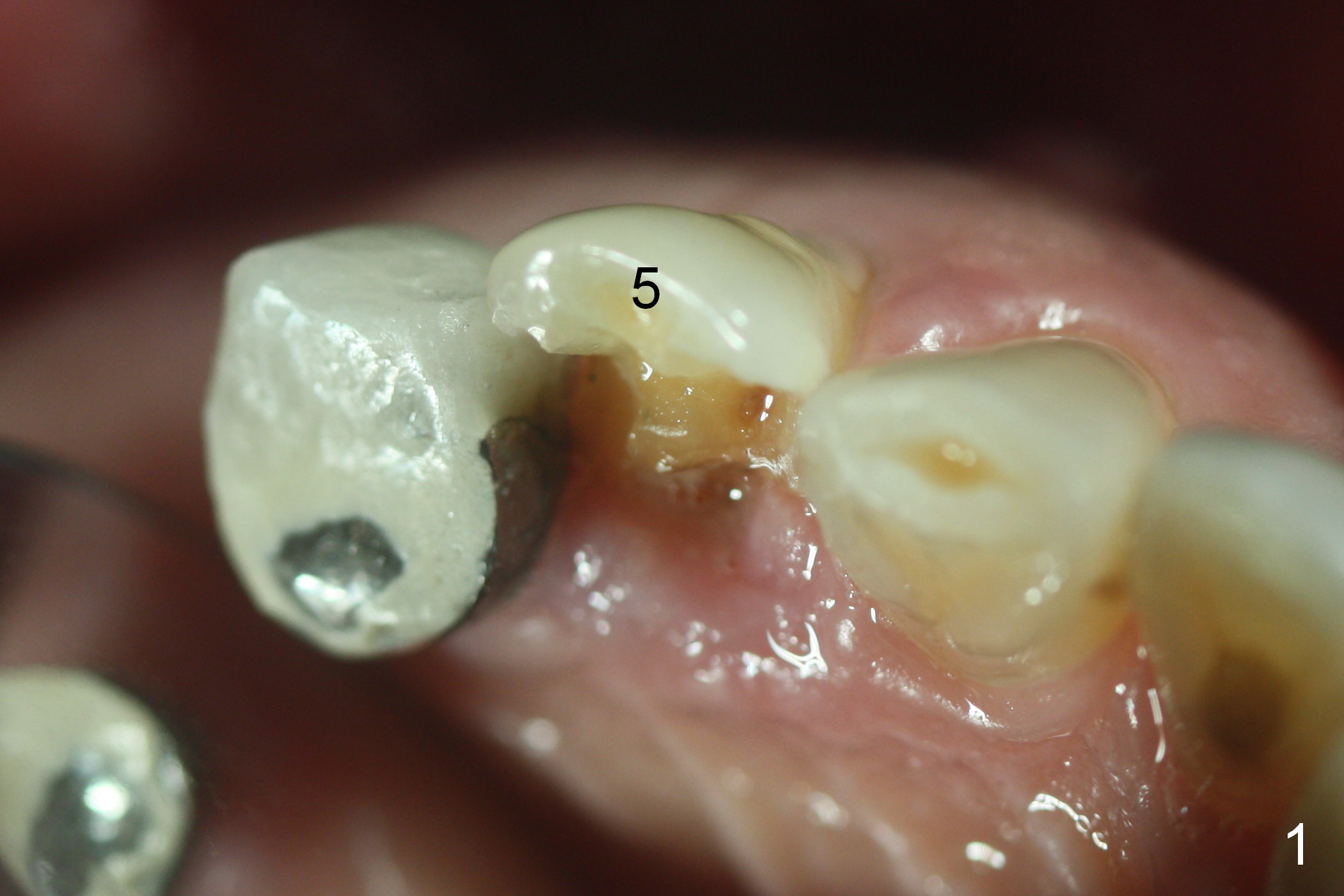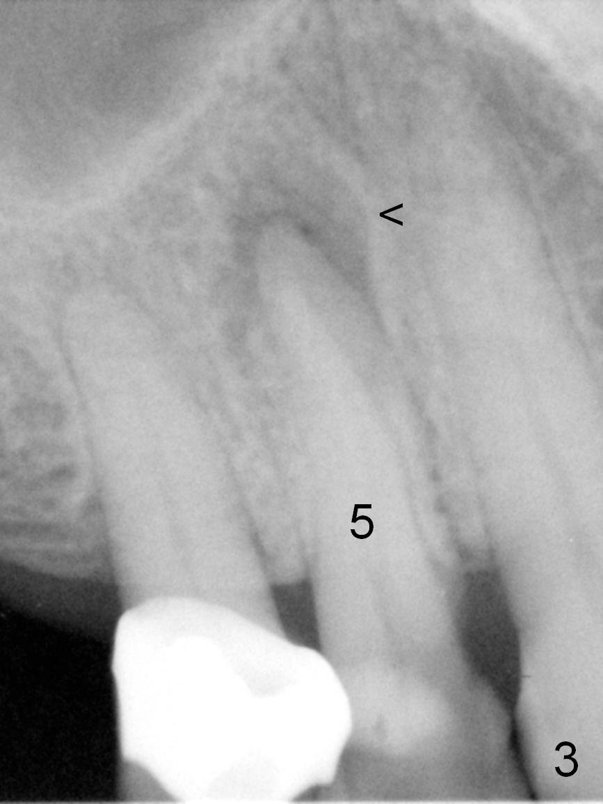 A 72-year-old lady is a bruxer with palatal subgingival fracture of the upper right 1st premolar (Fig.1) with a fistula/periapical radiolucency (Fig.2,3 <). She insists on saving the tooth, since it is asymptomatic. Bruxism must be severe, as the canine (Fig.2 ^) is shorter than the lateral incisor. She has history of #8 fracture and loosening of implant crown at #14.