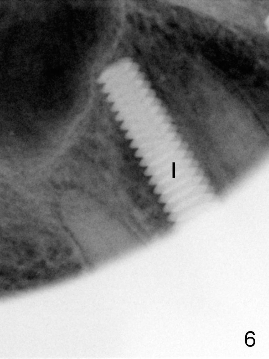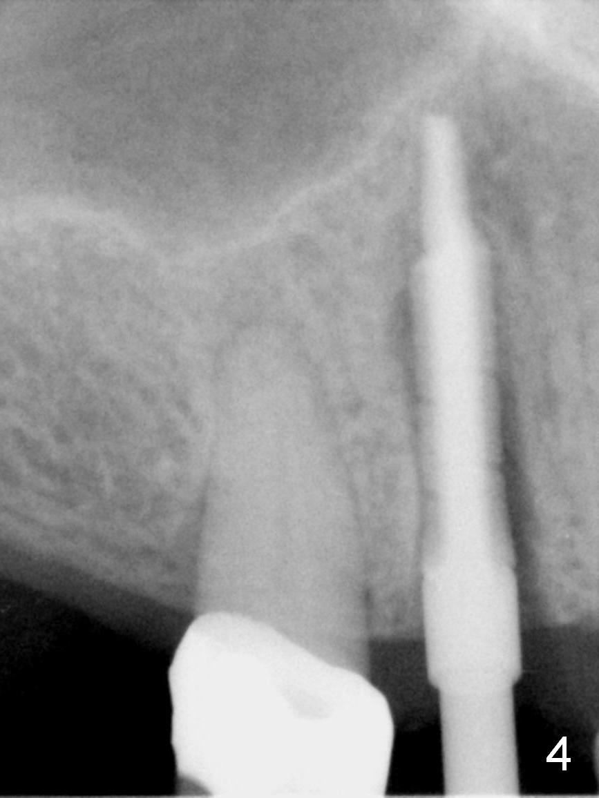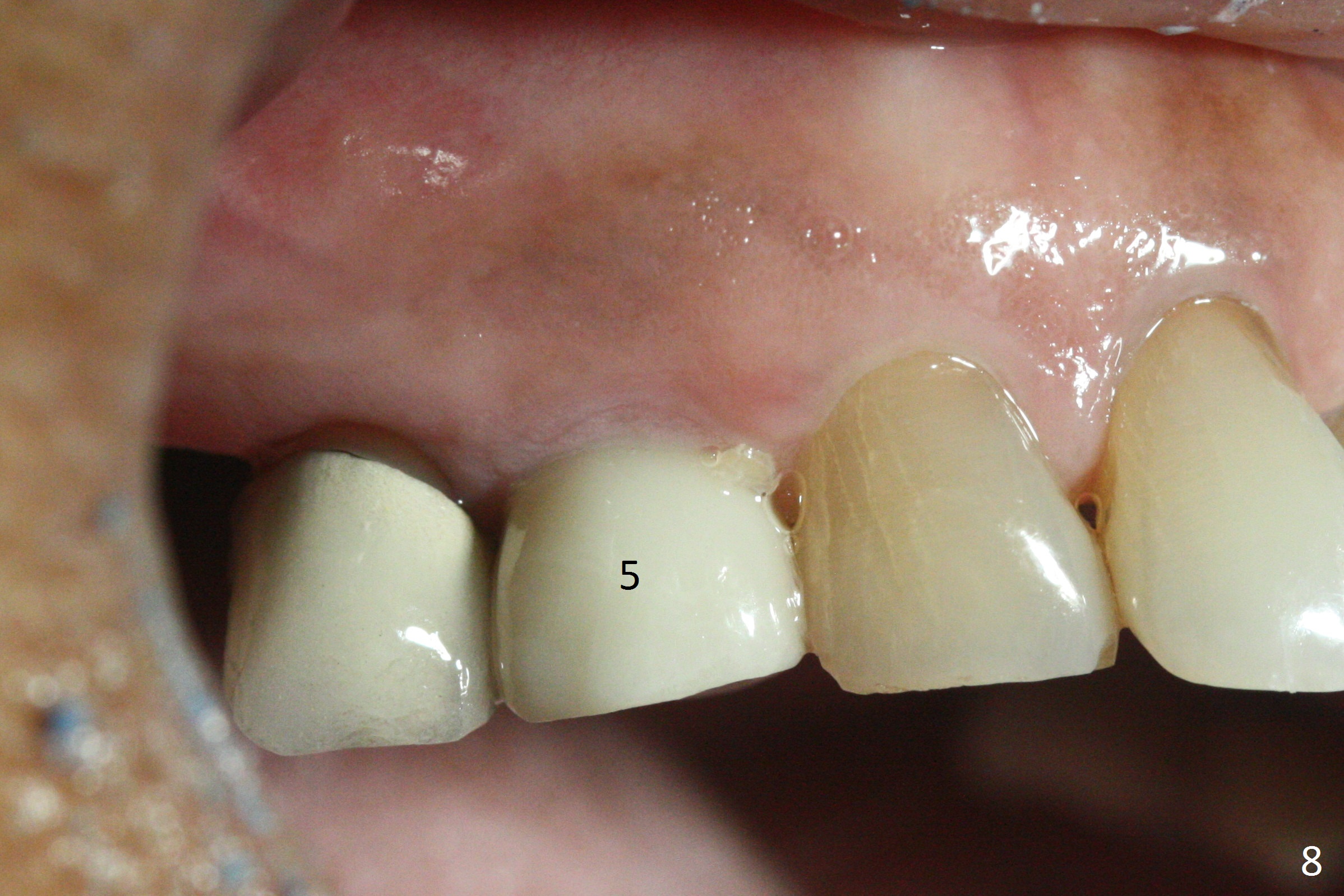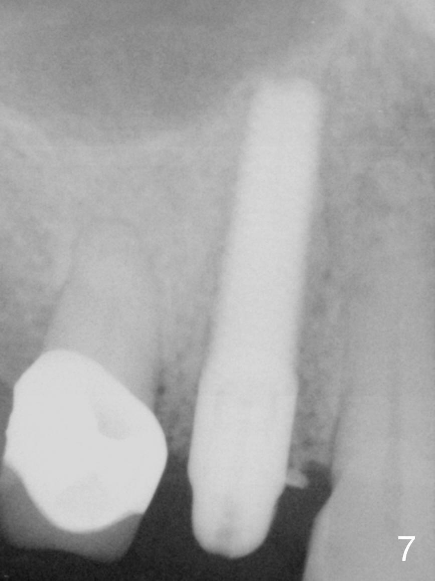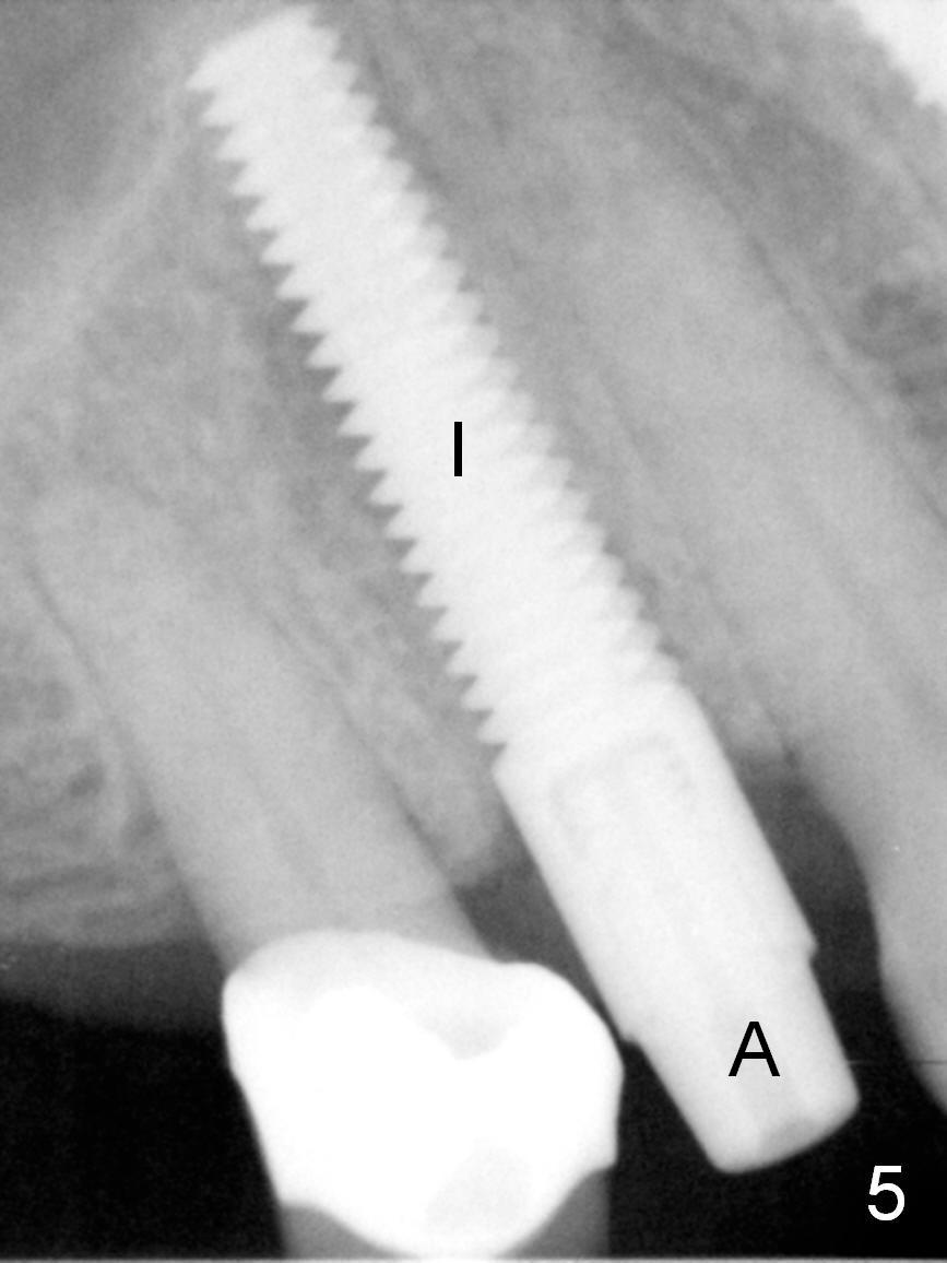 After long discussion, she agrees with extraction and immediate implant. After the extraction, granulation tissue is removed. There is buccal apical fenestration. The socket is treated with Metronidazole. The socket depth is 17 mm, while osteotomy depth is 20 mm (Fig.4). A 4x20 mm tissue-level implant is placed with primary stability (Fig.5,6 I). A short abutment (A) is placed immediately for an immediate provisional. The buccal gap is filled with Osteogen plug. There is no crestal bone loss 3 months postop (Fig.7). The provisional stays in place with occlusal perforation. The gingiva is healthy 5.5 months post cementation (Fig.8).