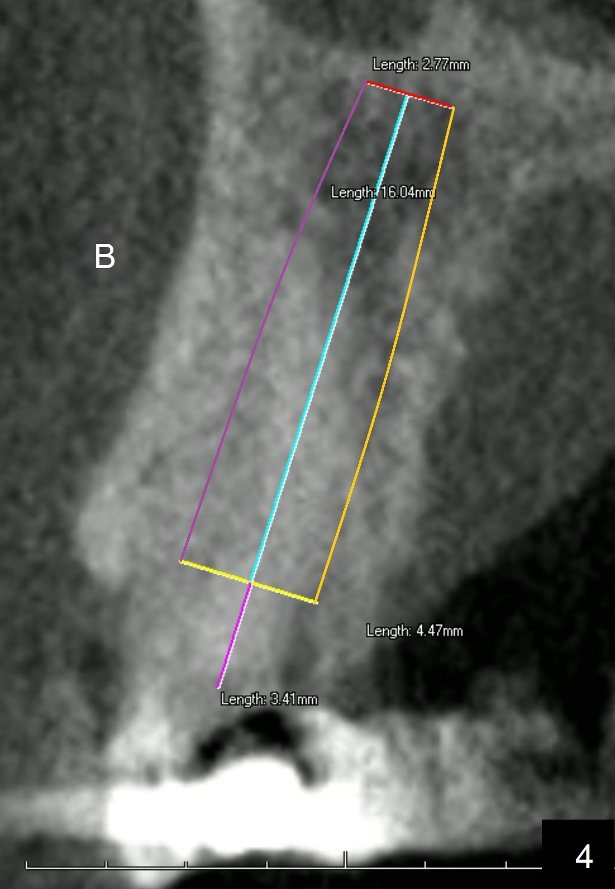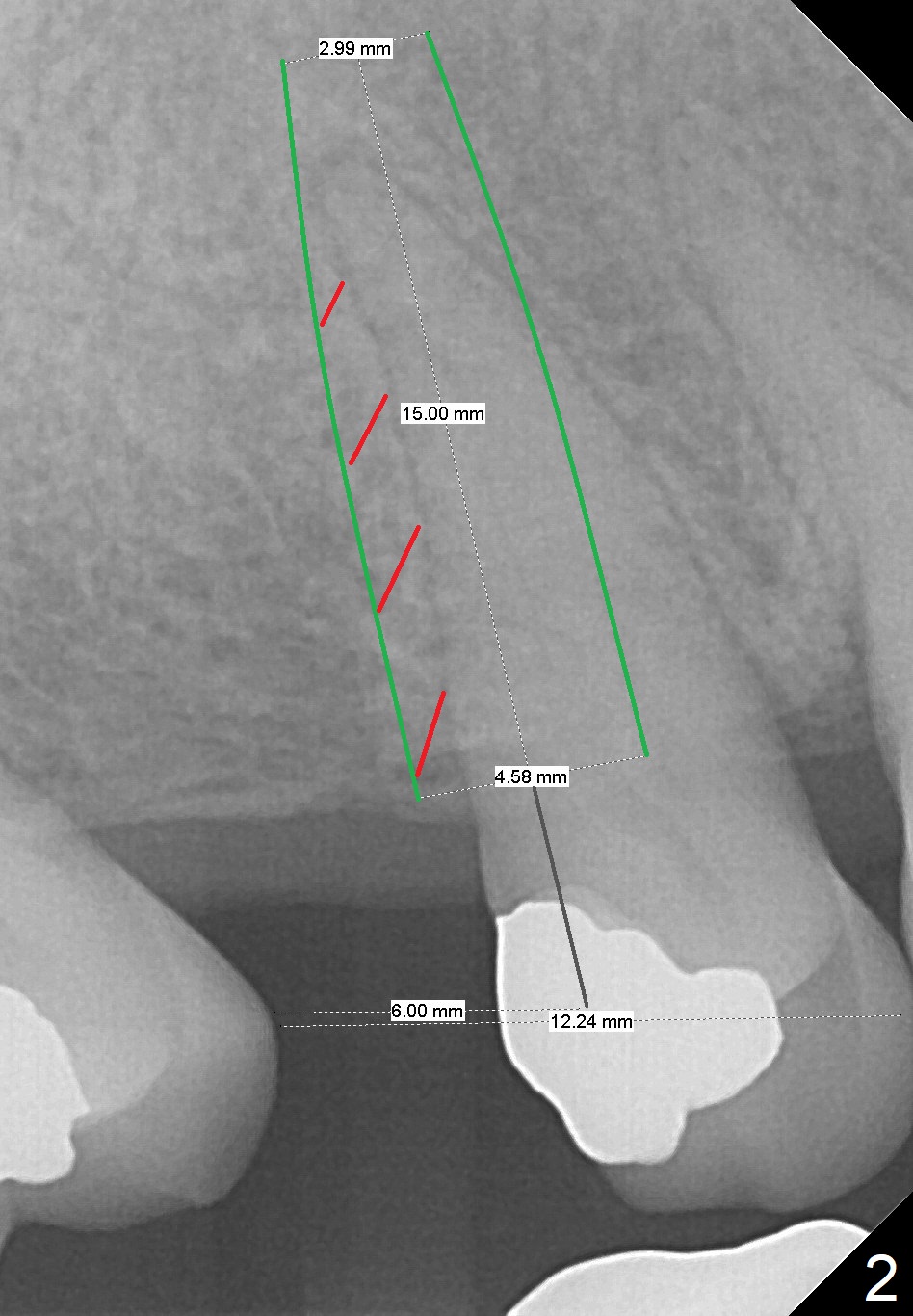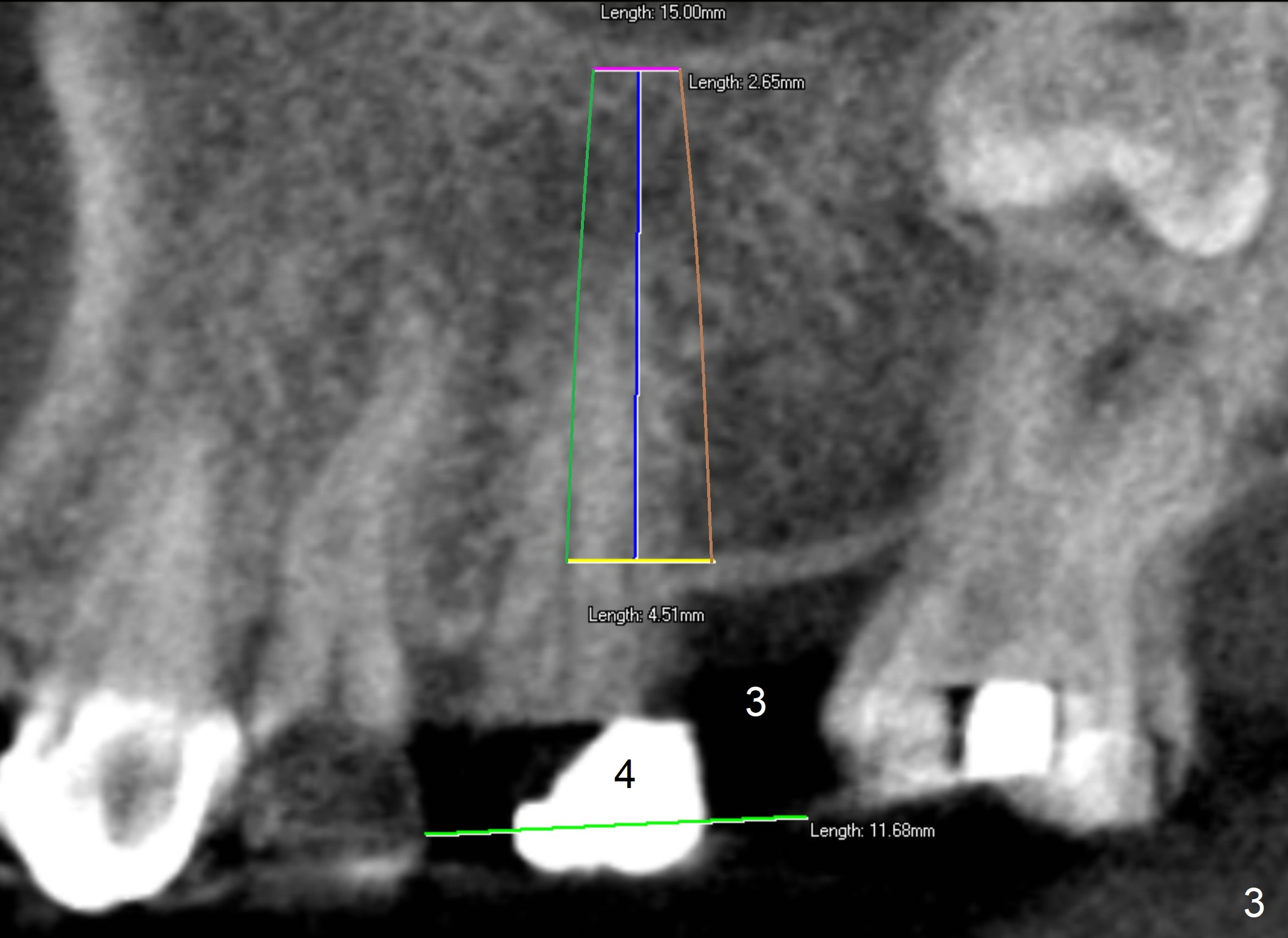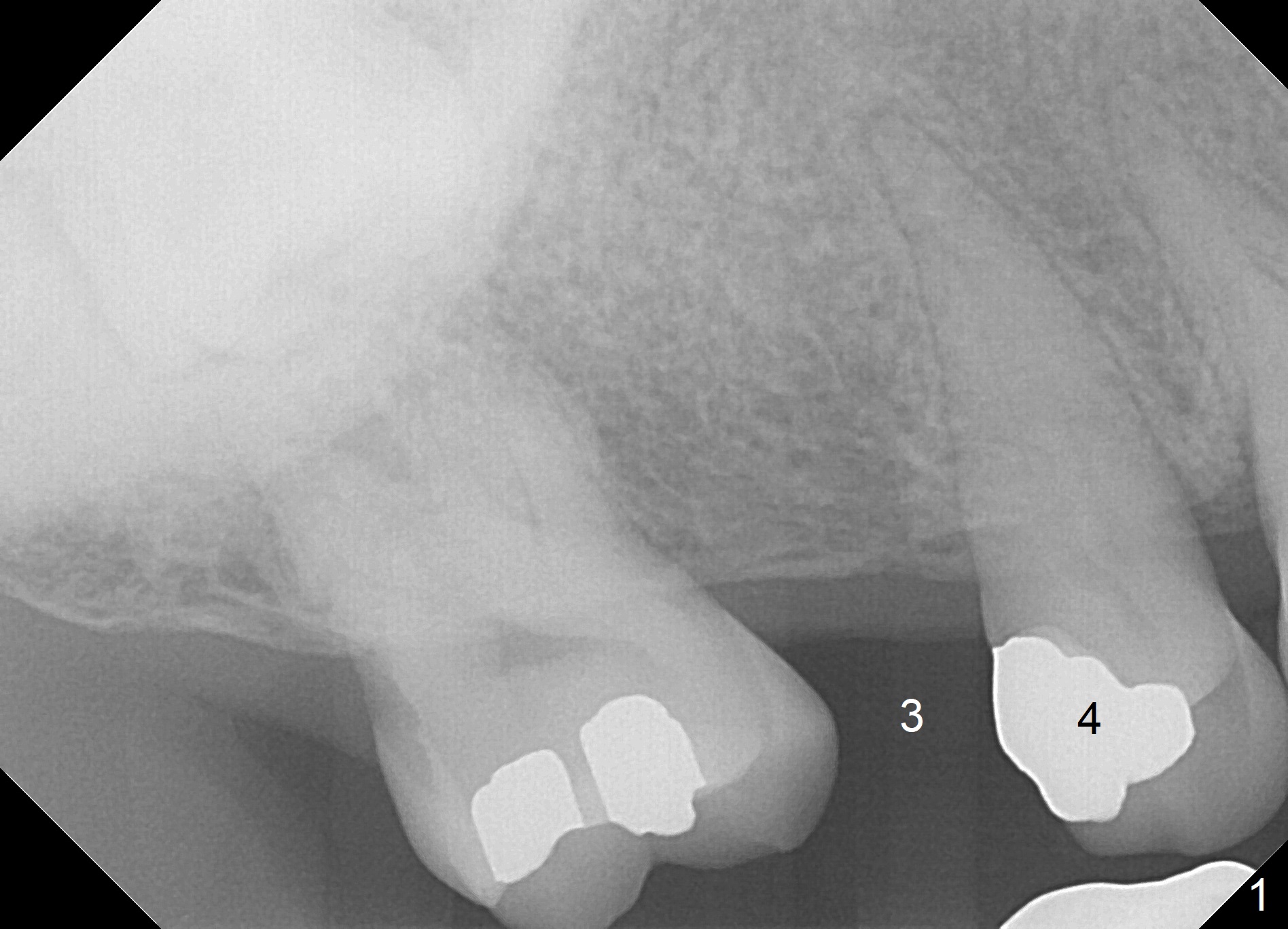 A 62-year-old man has sudden severe pain associated with the tooth #4. Since the edentulous space at #3 is narrow (Fig.1,3), an implant is placed distal to the site of #4 (after extraction) as a molar (Fig.2-4). Use Lindamann bur to remove the bone in the distal wall of the socket prior to osteotomy (Fig.2 red dashed area).