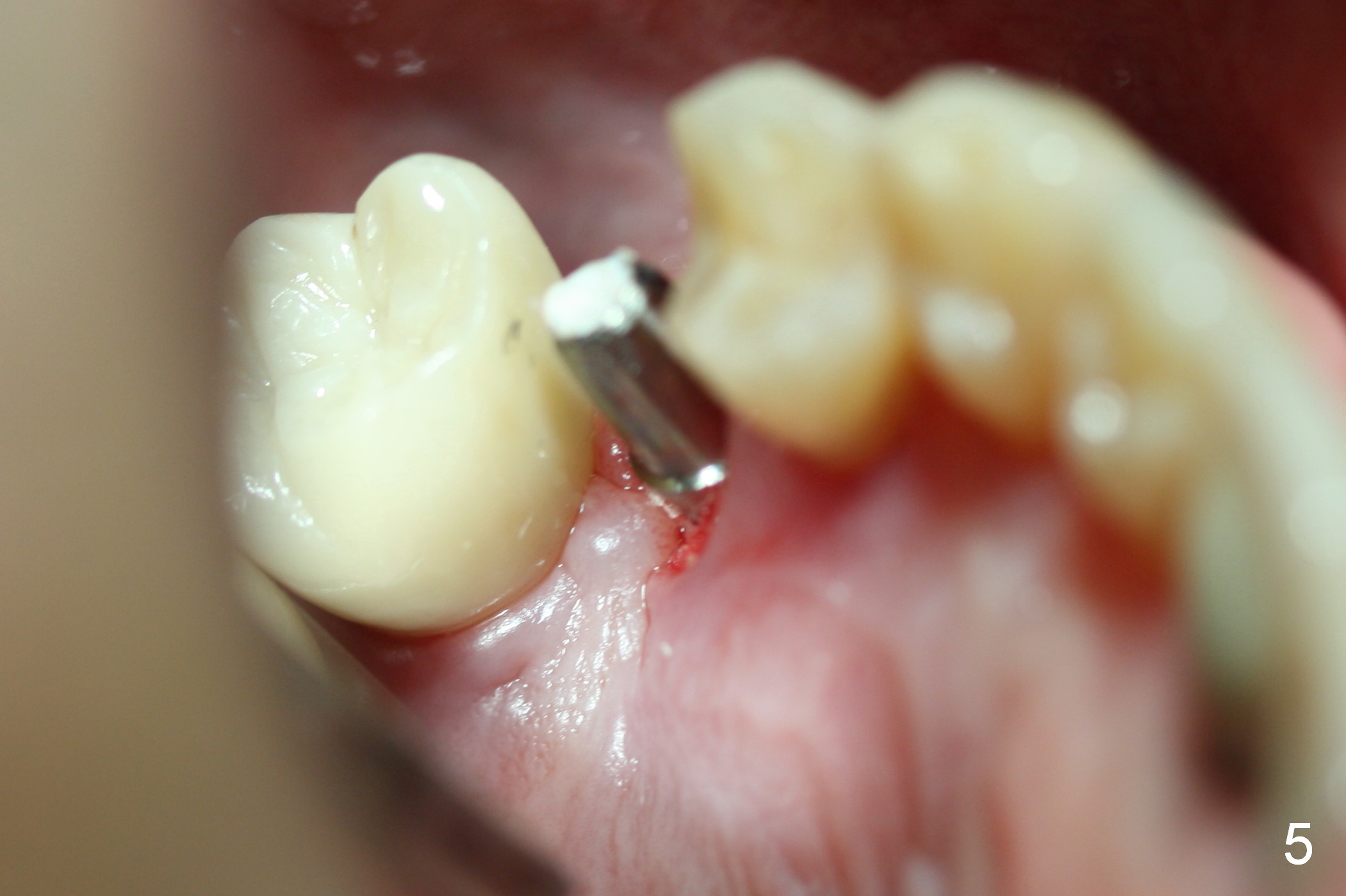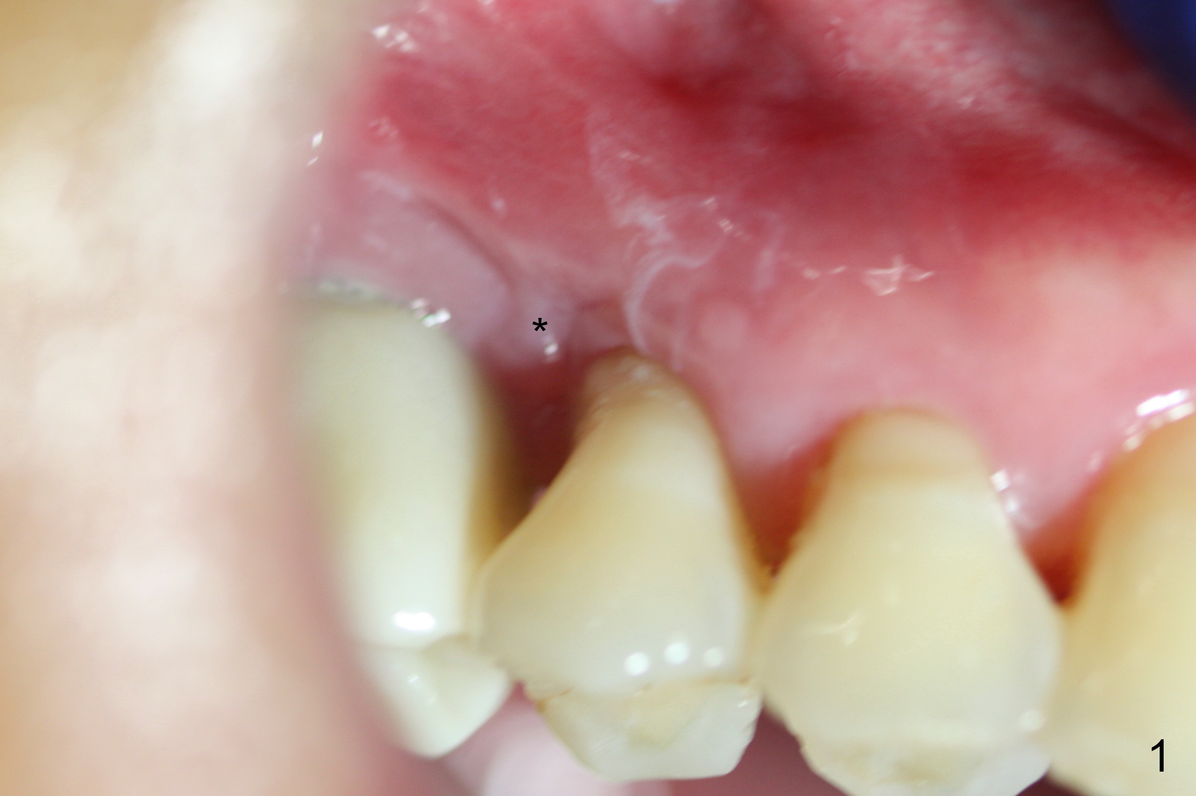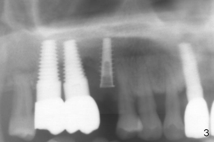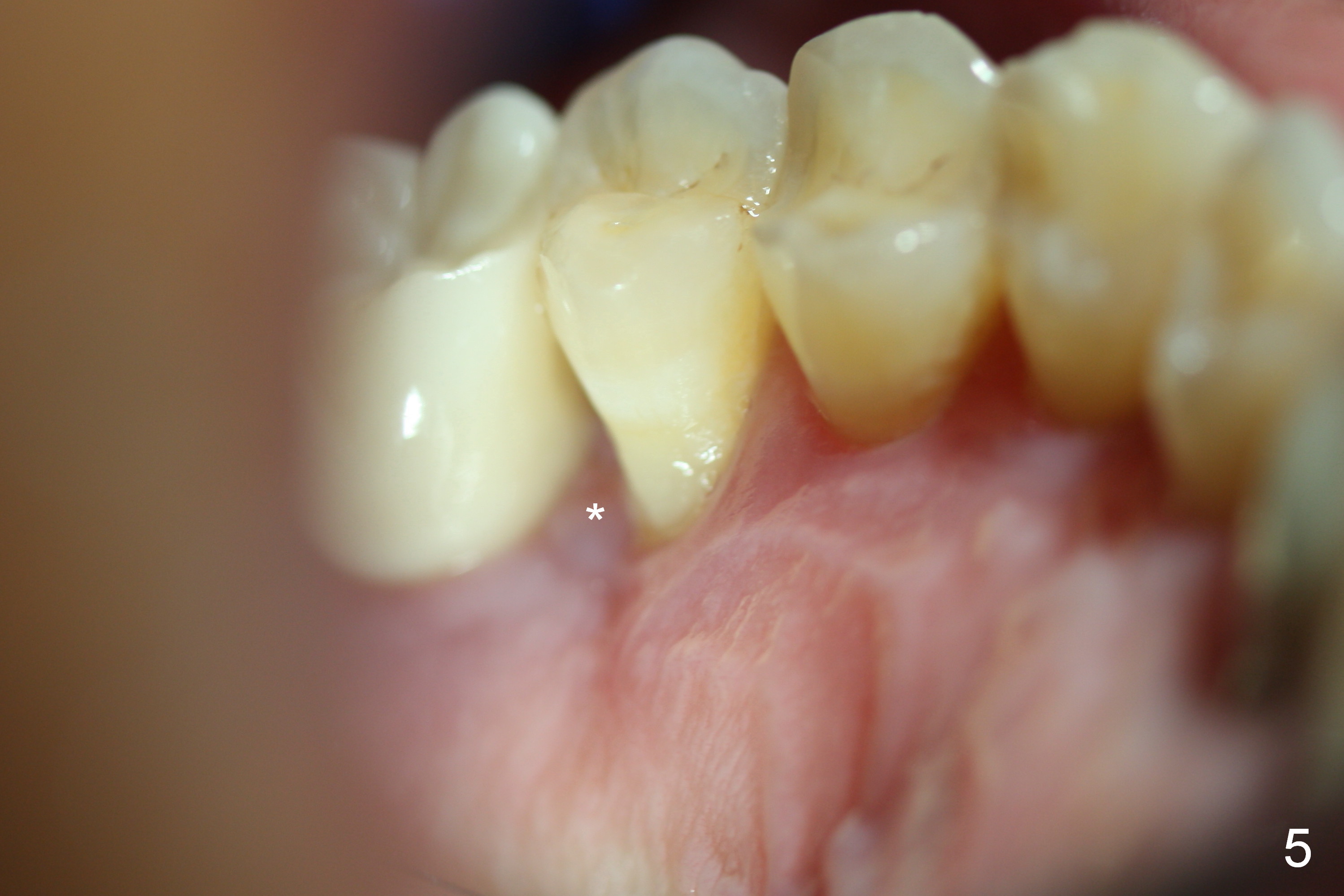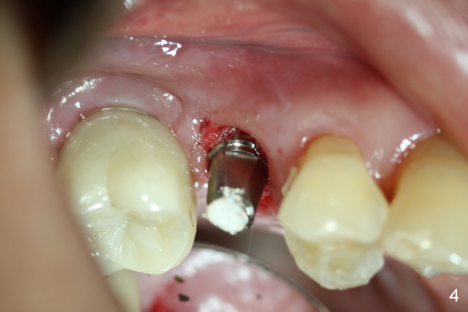 The distal buccal (Fig.1) and palatal (Fig.2) papillae (*) are recessive at the tooth #4.  Following extraction and use of 3.8 mm Magic Drill, a 4.5x13 mm implant is placed lower than the mesial crest (Fig.3) to reduce the chance of the distal implant thread exposure.  The latter is a measure to decrease peri-implantitis.  A 4.5x5.7(4) mm pair abutment is placed (Fig.4,5).  The remaining socket is filled with allograft/Osteogen placement.  The large space between #3 and 4 implants is occupied by the healthy gingiva, where bone graft cannot get in.