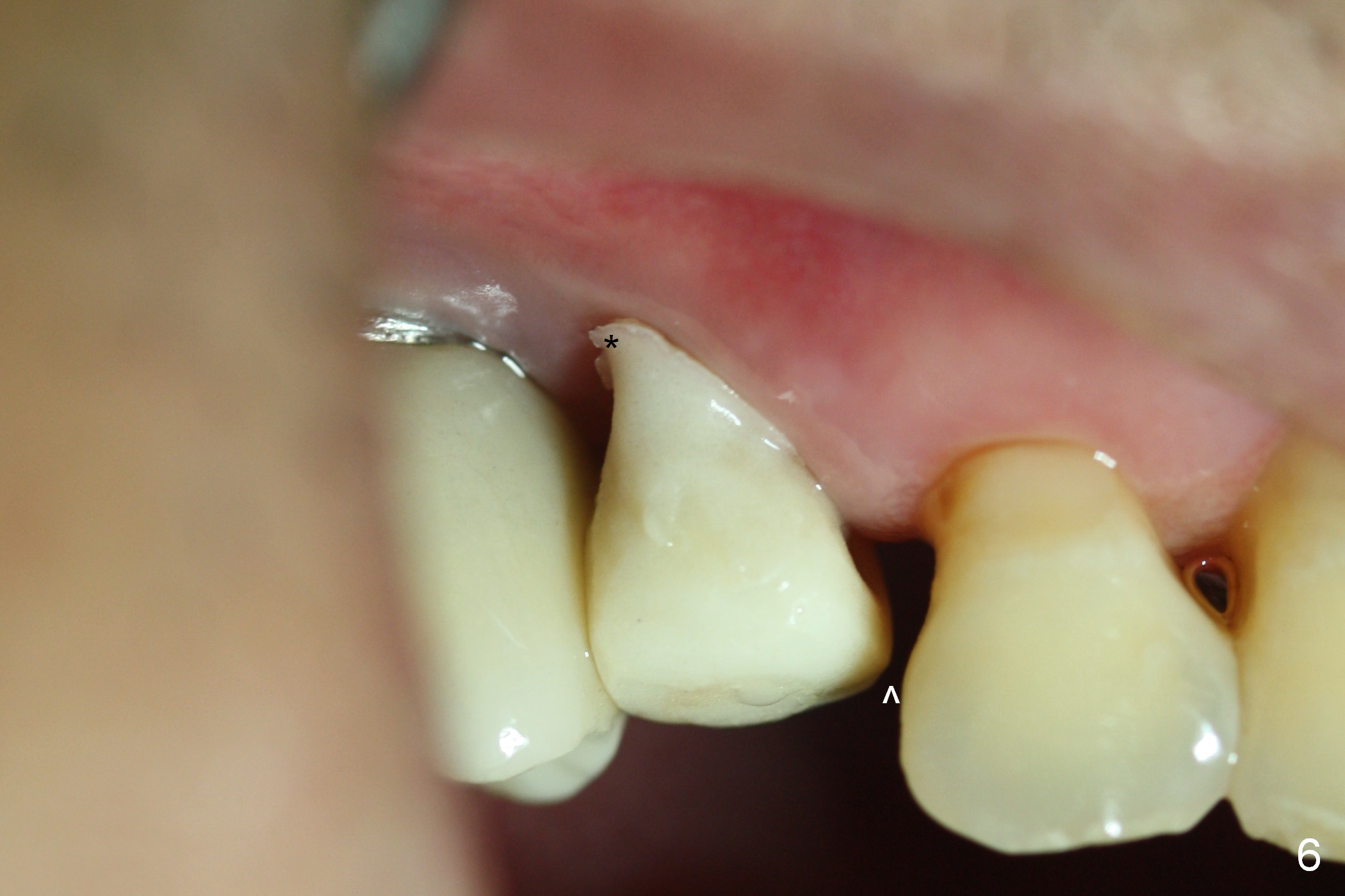 Six days postop, the distobuccal margin of the immediate provisional appears to be overbuilt (Fig.6 *).  The overhang was made to cover the distobuccal opening of the socket (Fig.4).  In addition to daily use of water pik, cleaning with .25% Sodium Hypochlorite contributes to the shiny surface of the provisional.  From now on, use cotton pellets soaked with the diluted bleach to clean the provisional and abutment (if exposed) every visit.  For this case, the overhang will be trimmed when the patient returns in 2 weeks so that the distal papilla may grow downward. The mesial contact should be re-established (^).