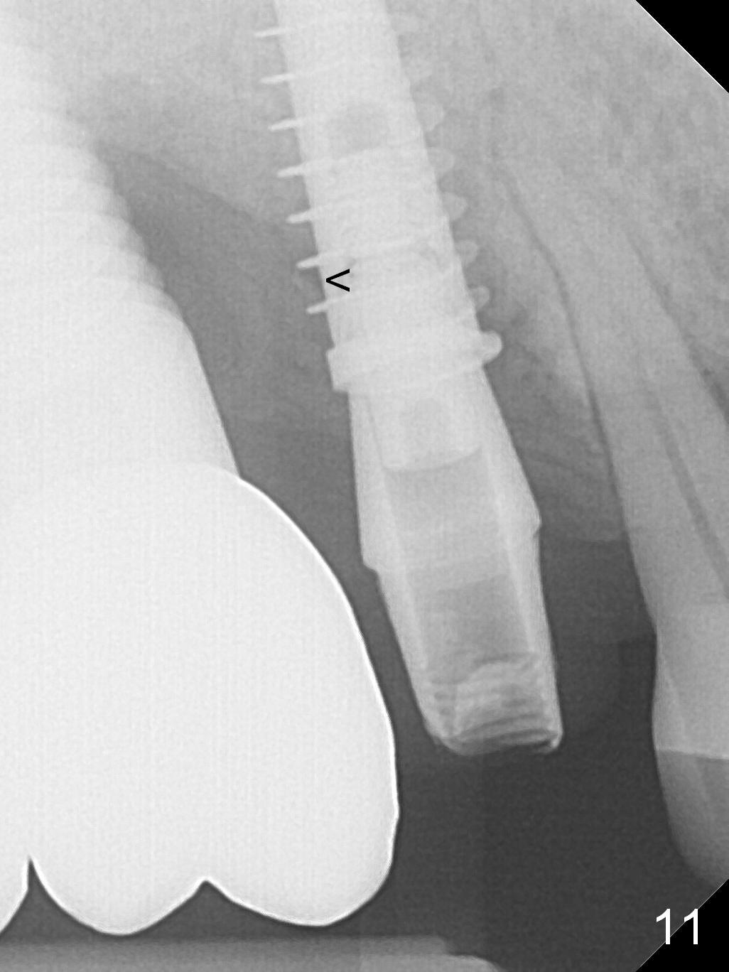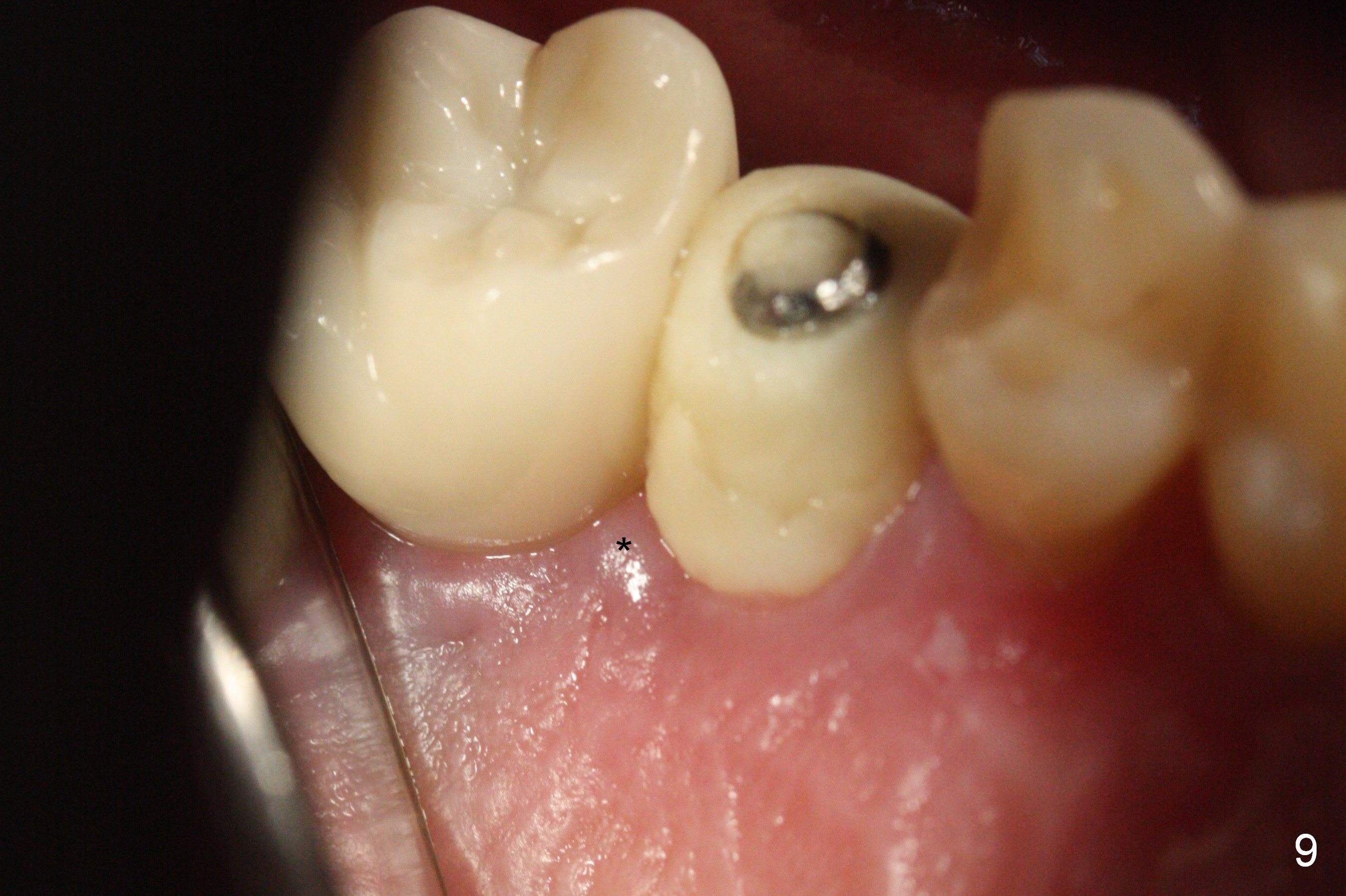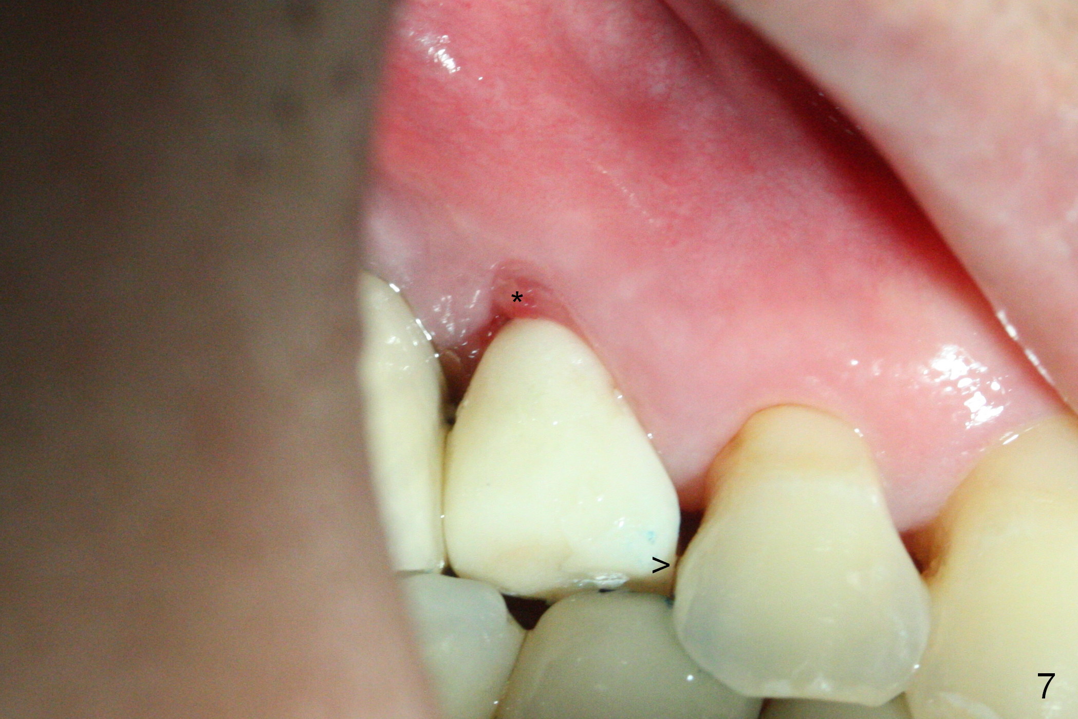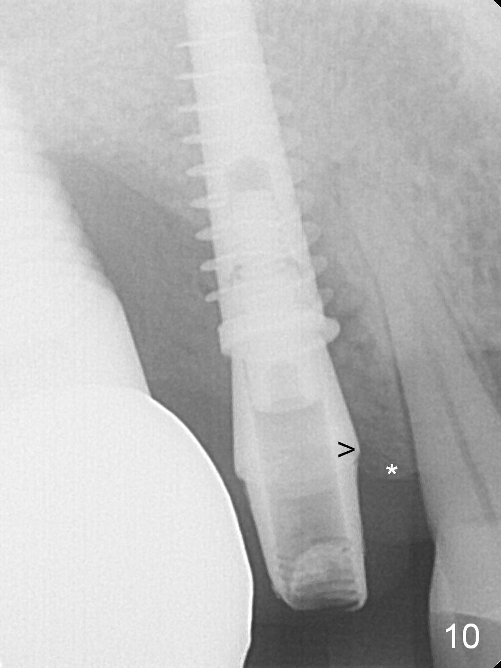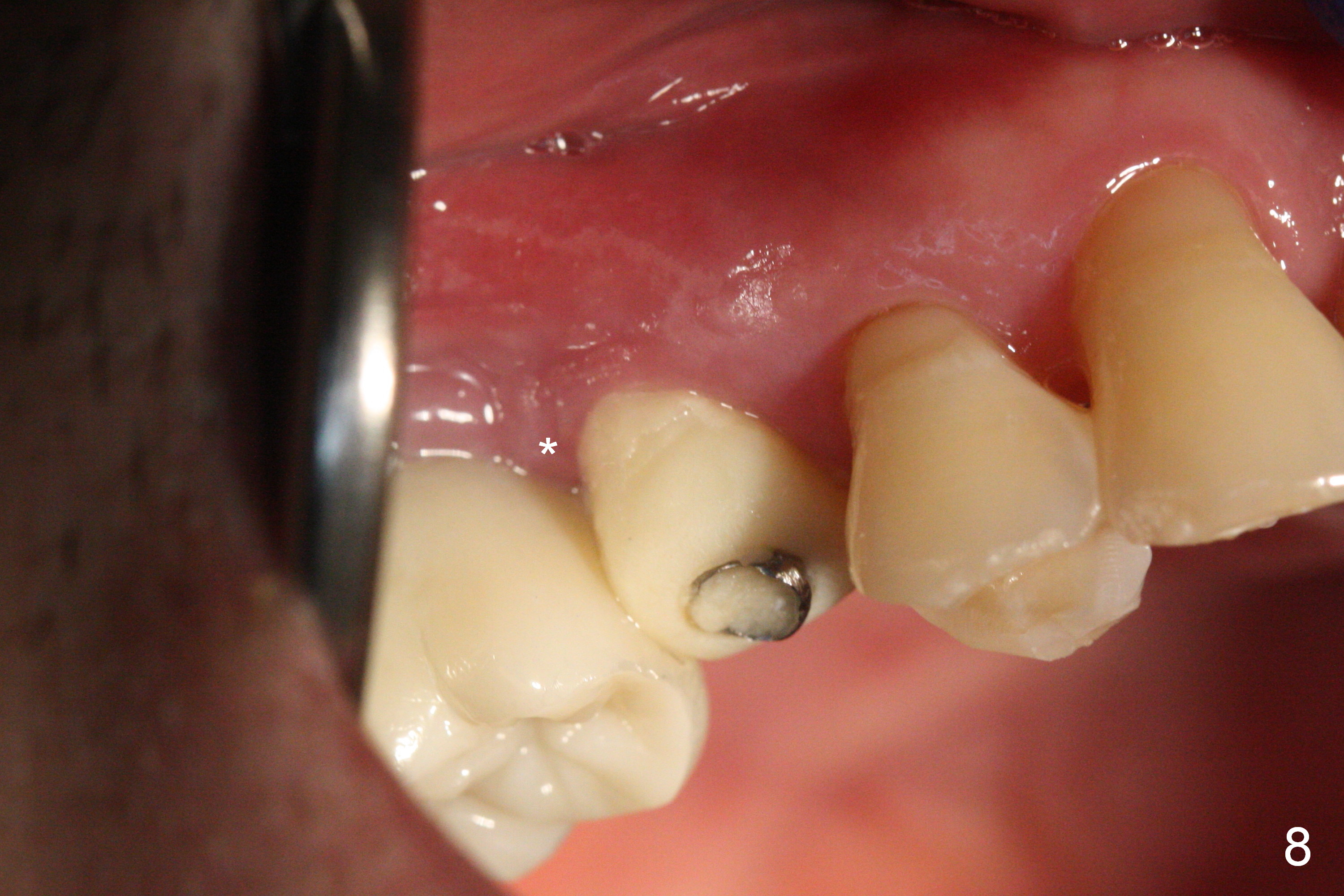 These are done 3 weeks postop (Fig.7) with granulation tissue having formed (*).  The teeth #14 and 18 become symptomatic 4 weeks postop.
