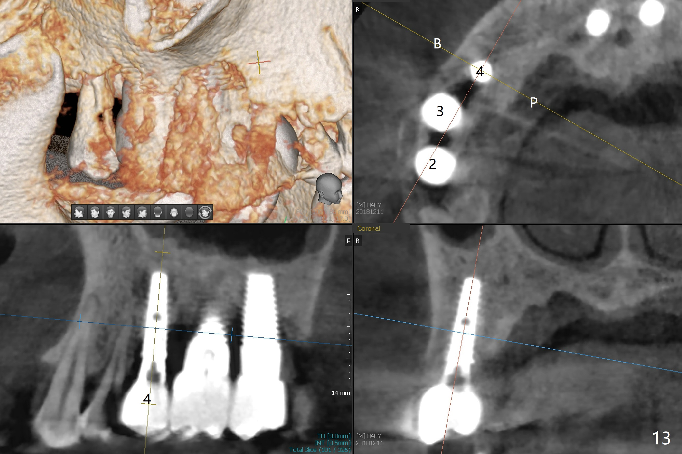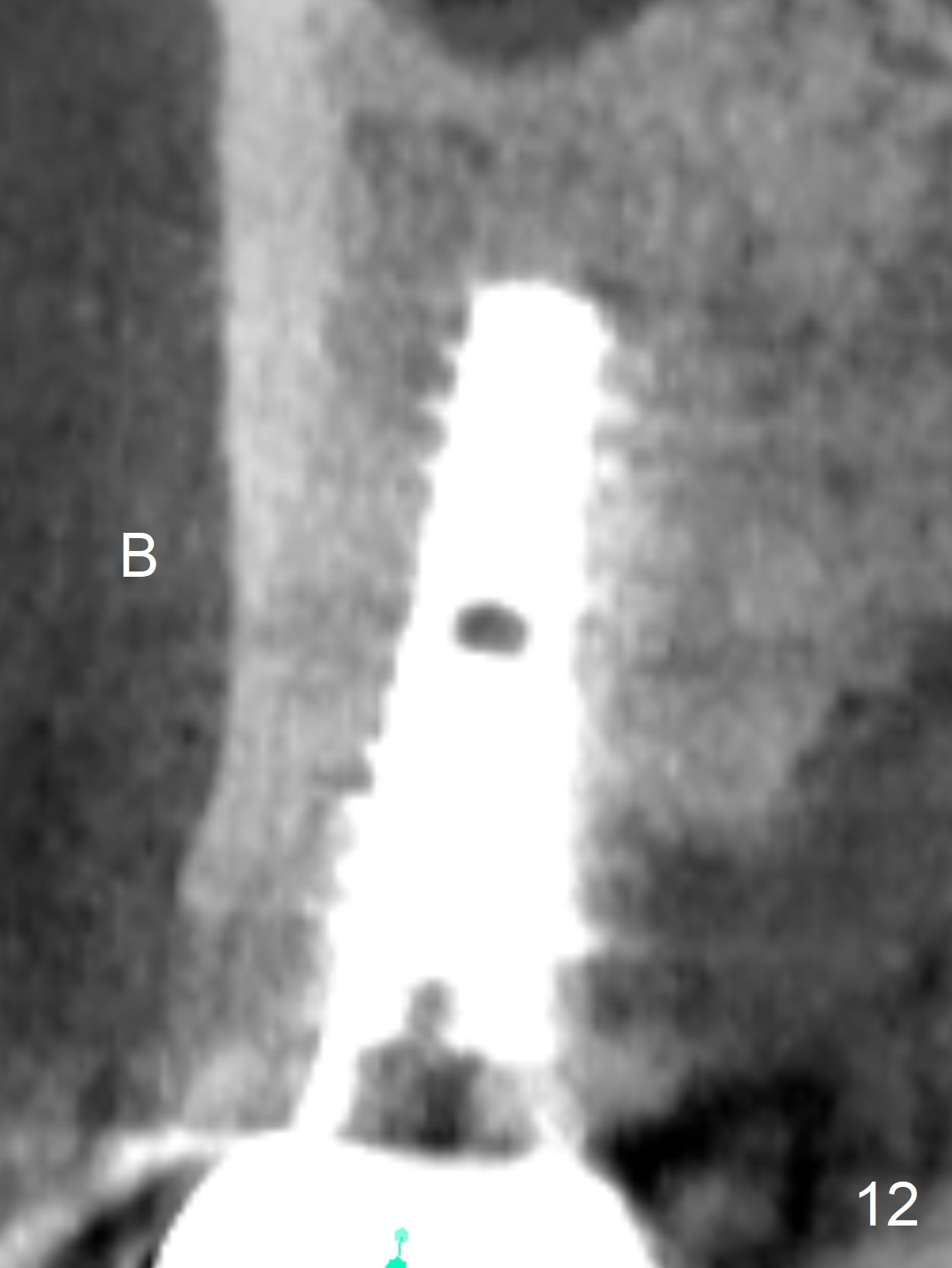 The distal papilla reforms buccally (Fig.8 *) and palatally (Fig.9) 4 months postop.  It appears that the 4 mm cuff of the pair abutment (Fig.10 >) is apical to the mesial crest (*).  The distal coronal implant threads seem to be covered by bone graft (Fig.11 <).  Therefore pair abutments with 5 mm or more cuff are required in cases of the uneven bone.   Implants have to be placed deep.  CT taken 3 months post cementation (10 months postop) shows that the implant is placed in the middle of the alveolus without apparent thread exposure.  CT taken 1 year and 8 months post cementation (Fig.13) shows that the implant is placed in the middle of the alveolus without apparent thread exposure, as compared to those at #2 and 3, which are placed buccal (B).