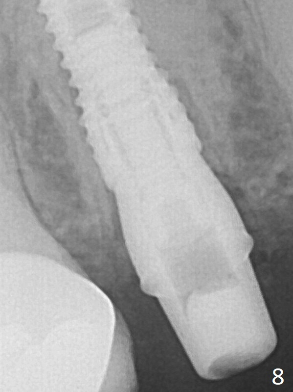 Vanilla graft is placed around the implant (vaguely shown) and a 4.5x4(4) mm abutment is placed immediately for an immediate provisional (Fig.8).
