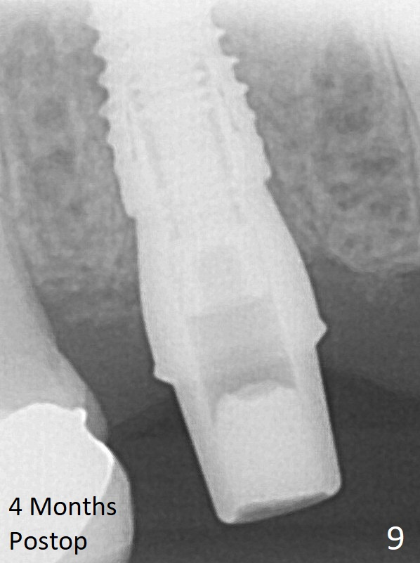 Although the provisional easily dislodges in spite of remake, the implant seems osteointegrated with decreased space 4 months postop (Fig.9). The gingiva is healthy, although it covers the abutment margin partially. Gingivectomy appears necessary for impression.