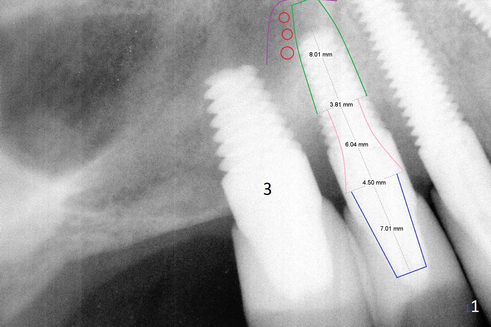 For the implant #4 (4.5x14 mm), there are 2 options: exposed thread or implant removal. Either way, make an ample incision. Prepare long diamond burs. Soak several pieces of gauze in 1:1000 Epinephrine. The implant will be removed using 5/6 mm trephine bur or surgical handpiece, followed by immediate placement of a bone-level implant with the longest abutment cuff (Fig.1: 6 mm (pink)). Insert PRF (purple line, 4-5 tubes of blood) and allograft (red circles) prior to implantation. The implant/crown ratio is poor, place a long healing abutment or cemented abutment with the shortest abutment height (4 mm vs. 7 mm of the final one (Fig.1 blue, 6-8 months of healing)). If the site is unfavorable for implantation, a 3-unit bridge will be fabricated.