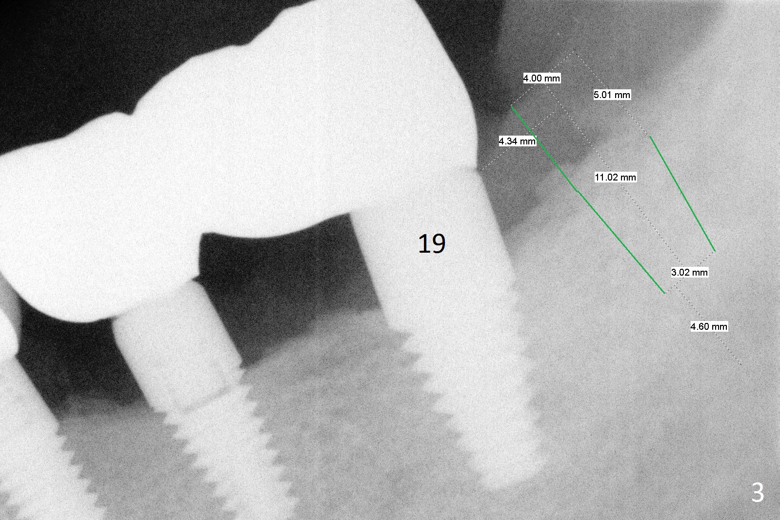 A 58-year-old man has two types of implant complications: periimplantitis at #4 (in spite of 2 bone graft surgeries, Fig.1) and abutment loosening at #14 and repeatedly 19 (probably due to bruxism, Fig.2,3).