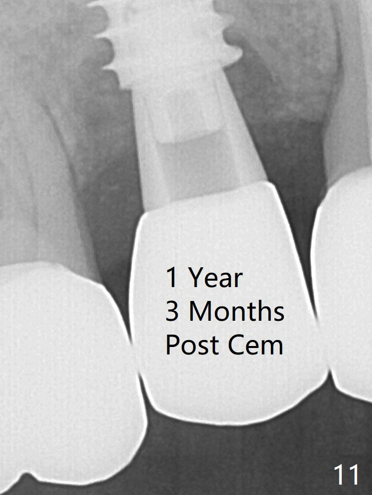 To reduce the gap and periimplantitis, a 5x11 mm IBS implant is placed with insertion torque > 50 Ncm after further osteotomy using Magic Drills (Fig.4). Following placement of 5.5x4(4) mm abutment (A), a splinted provisional is fabricated at #3 and 4. The provisional is stable 3 months postop (Fig.7). Bone graft appears to remain between the implant fins (arrows). The bone density of the bone graft between the implant fins increases 4.5 months postop (Fig.9). The bone density appears to reach the normal value (same as that of the nearby bone) 1 year 3 months post cementation (Fig.11).