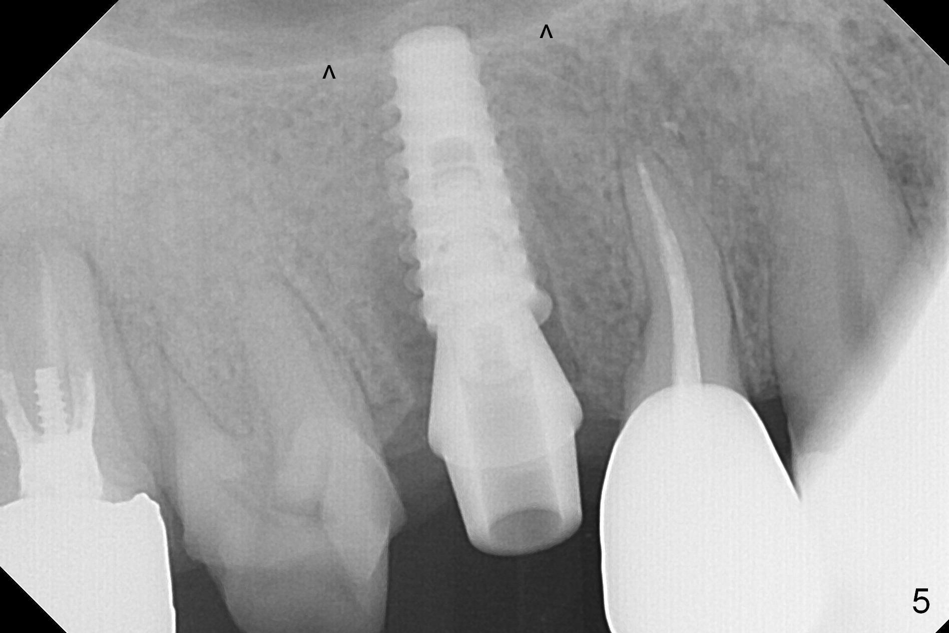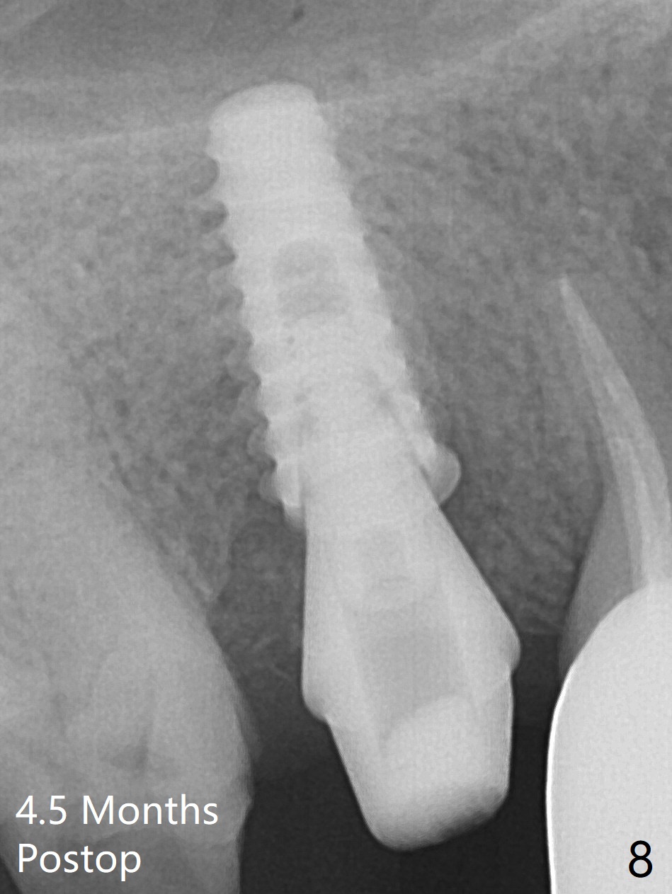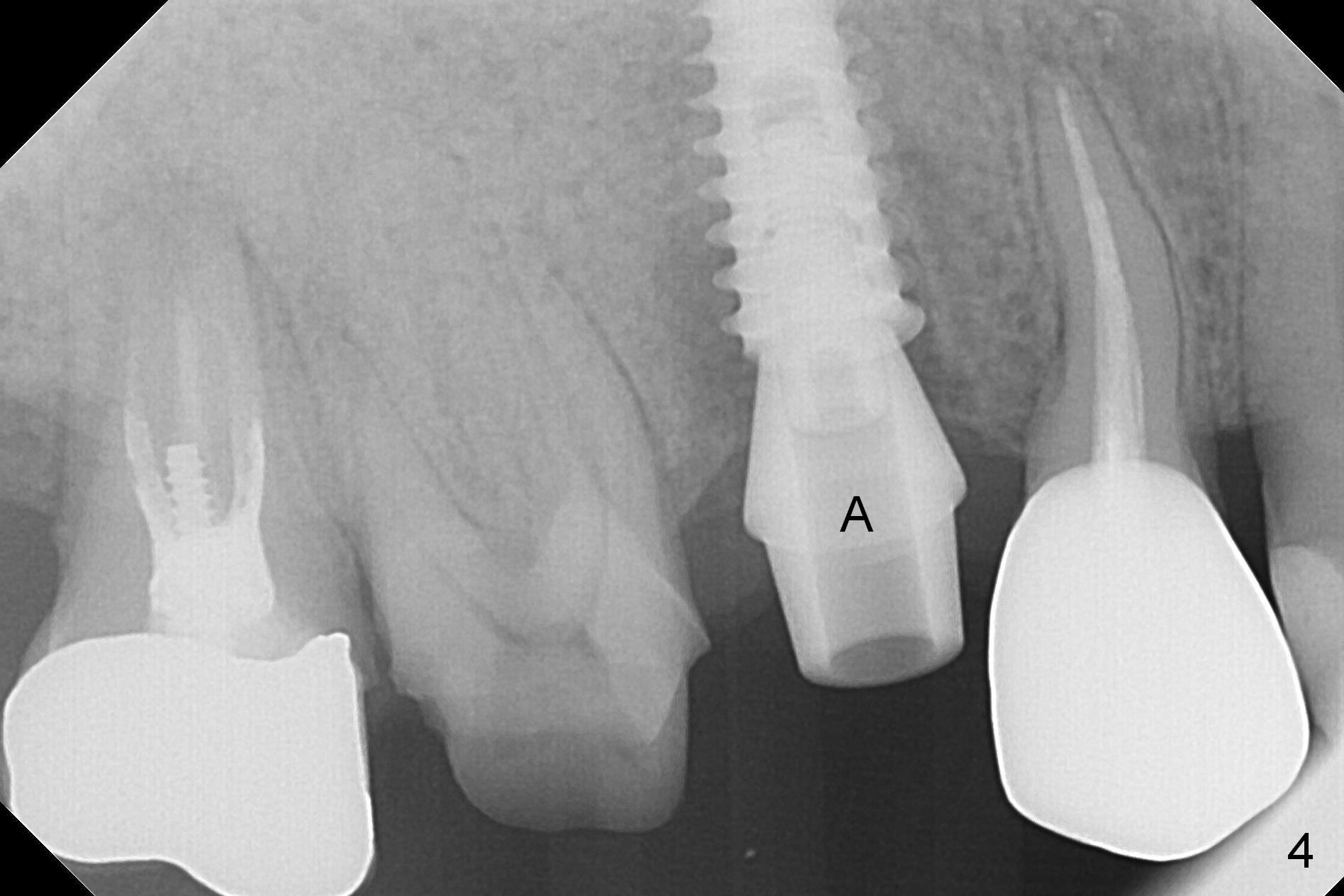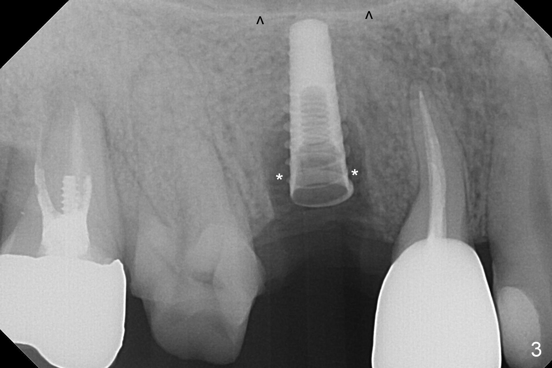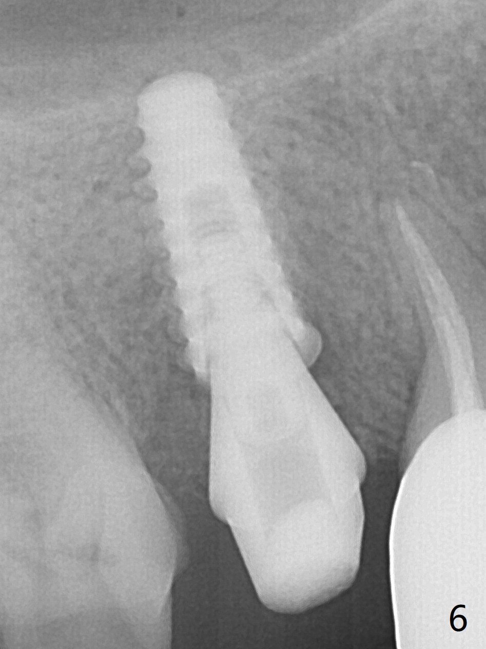 When the tooth #4 with vertical root fracture is extracted, the socket is large, approximately 6x10x10 mm (Fig.1 (mesiodistal x buccopalatal width x depth)). Osteotomy is established in the middle of the socket with 2 mm initial drill for 7 mm, 2.8 and 3.6 mm rounds drills (from DIO Sinus Master Kit) for < 7 mm, and 3.0 and 3.8 mm Magic Expanders. A 4x11 mm dummy implant is placed with insertion torque of 30 Ncm (Fig.2,3 (^: sinus floor)). There is a gap between the socket wall and the implant (*). To reduce the gap and periimplantitis, a 5x11 mm IBS implant is placed with insertion torque > 50 Ncm after further osteotomy using Magic Drills (Fig.4,5). Following placement of 5.5x4(4) mm abutment (A) and bone graft (data not shown), a splinted provisional is fabricated at #3 and 4. The provisional is stable 3 months postop (Fig.6,7). The peri-implant gaps (Fig.4,5) seem to disappear (Fig.6) with the help of bone graft. Bone graft appears to remain between the implant fins (Fig.7 arrows). Impression is taken 4.5 months postop (Fig.8,9). The abutment dislodges 4 months post cementation. After retightening, there is clearance for shim after use of 2 layers of thick articulating paper. Is the abutment screw too short? Or Titanium V is too hard for welding? The abutment/crown dislodges again 1 year 3 month post cementation; it appears that the fact that the implant is placed deep contributes to abutment screw loosening (Fig.10,11). An abutment screw will be buried inside the implant well 10 days post initial retightening.