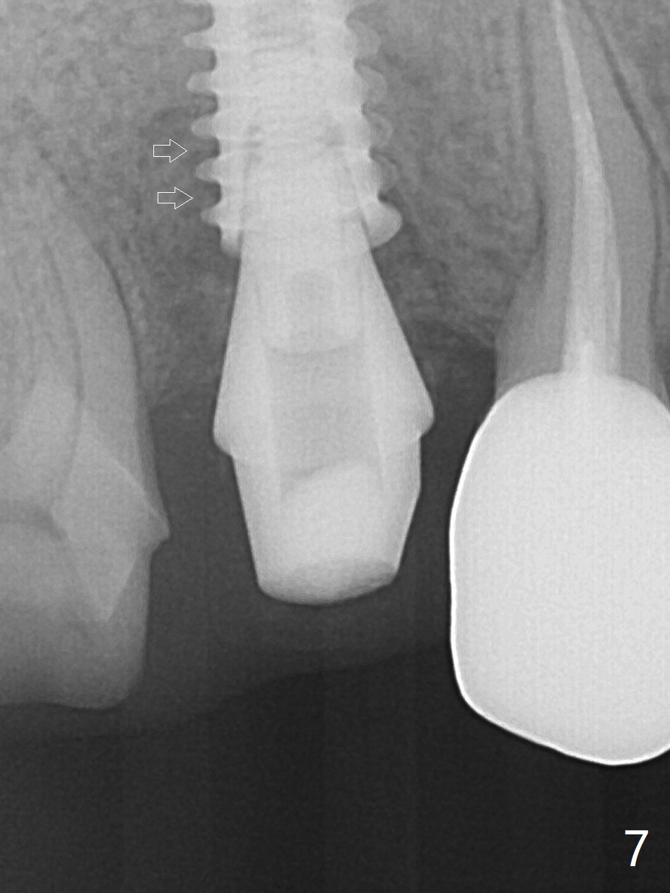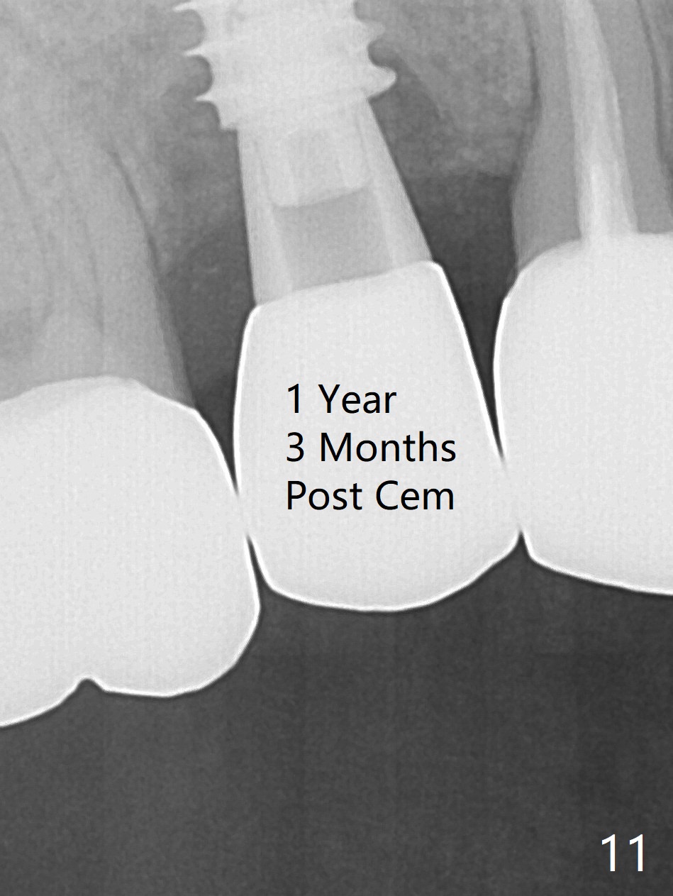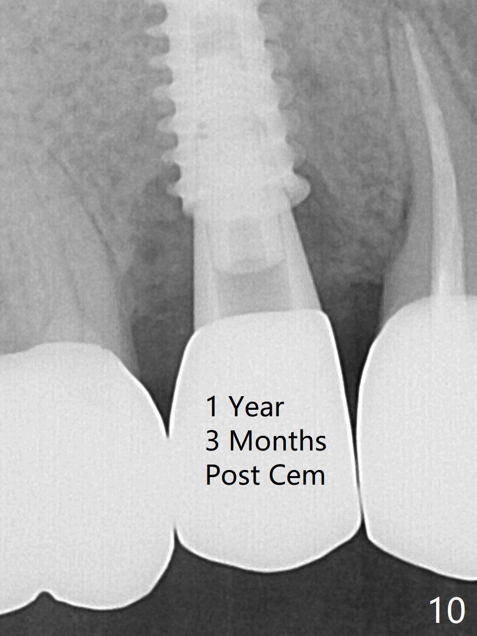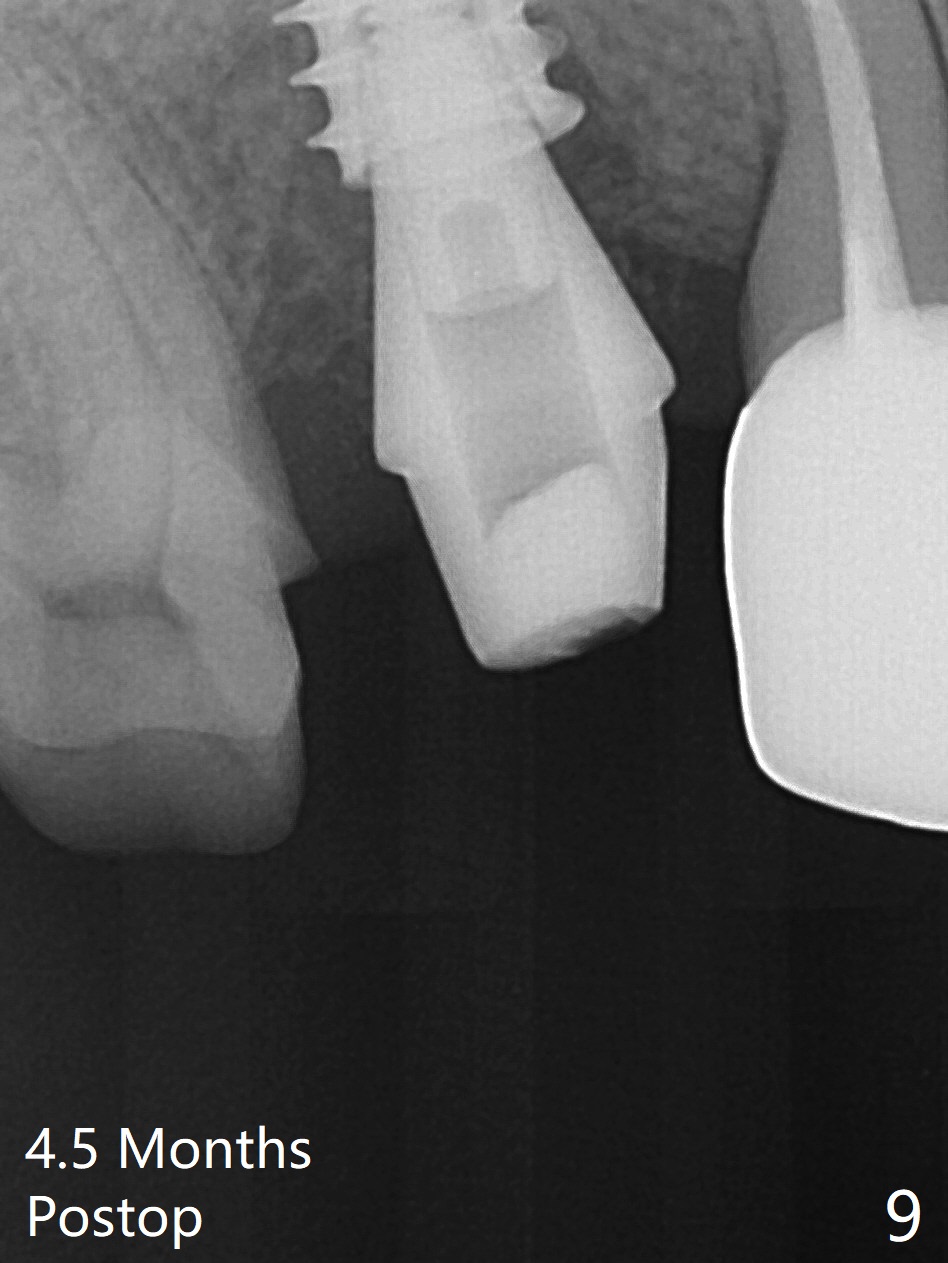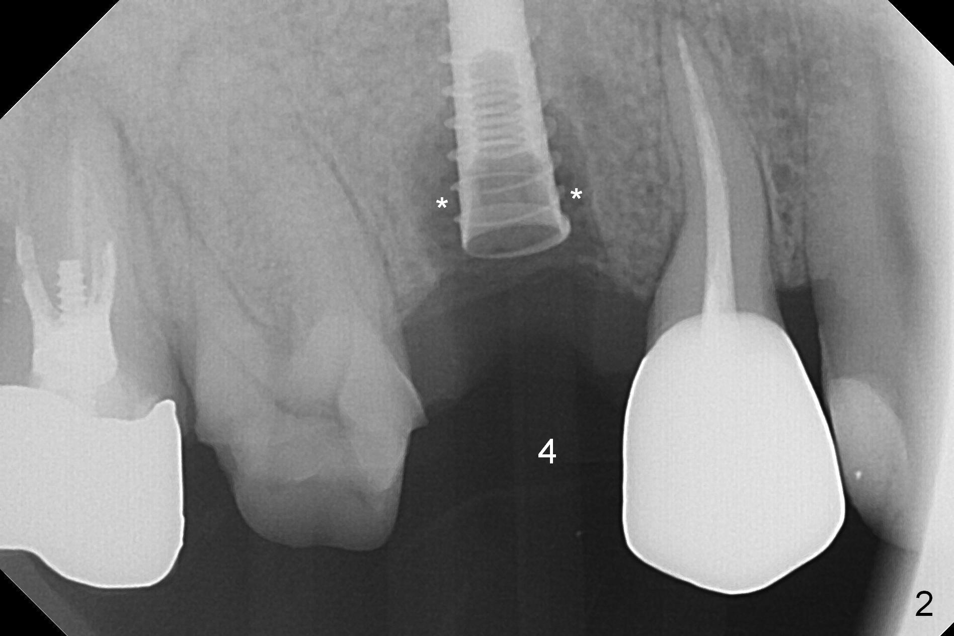 When the tooth #4 with vertical root fracture is extracted, the socket is large, approximately 6x10x10 mm (Fig.1 (mesiodistal x buccopalatal width x depth)). Osteotomy is established in the middle of the socket with 2 mm initial drill for 7 mm, 2.8 and 3.6 mm rounds drills (from DIO Sinus Master Kit) for < 7 mm, and 3.0 and 3.8 mm Magic Expanders. A 4x11 mm dummy implant is placed with insertion torque of 30 Ncm (Fig.2,3 (^: sinus floor)). There is a gap between the socket wall and the implant (*). To reduce the gap and periimplantitis, a 5x11 mm IBS implant is placed with insertion torque > 50 Ncm after further osteotomy using Magic Drills (Fig.4,5). Following placement of 5.5x4(4) mm abutment (A) and bone graft (data not shown), a splinted provisional is fabricated at #3 and 4. The provisional is stable 3 months postop (Fig.6,7). The peri-implant gaps (Fig.4,5) seem to disappear (Fig.6) with the help of bone graft. Bone graft appears to remain between the implant fins (Fig.7 arrows). Impression is taken 4.5 months postop (Fig.8,9). The abutment dislodges 4 months post cementation. After retightening, there is clearance for shim after use of 2 layers of thick articulating paper. Is the abutment screw too short? Or Titanium V is too hard for welding? The abutment/crown dislodges again 1 year 3 month post cementation; it appears that the fact that the implant is placed deep contributes to abutment screw loosening (Fig.10,11). An abutment screw will be buried inside the implant well 10 days post initial retightening.