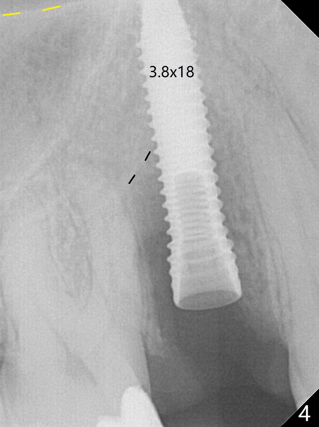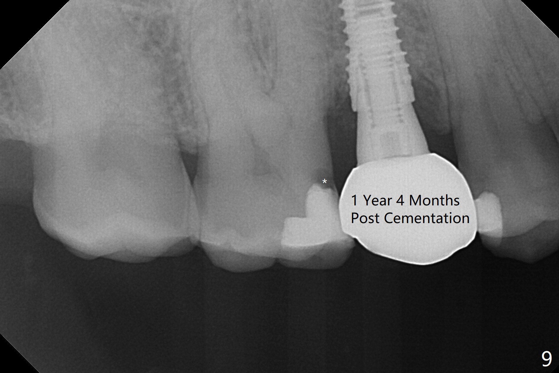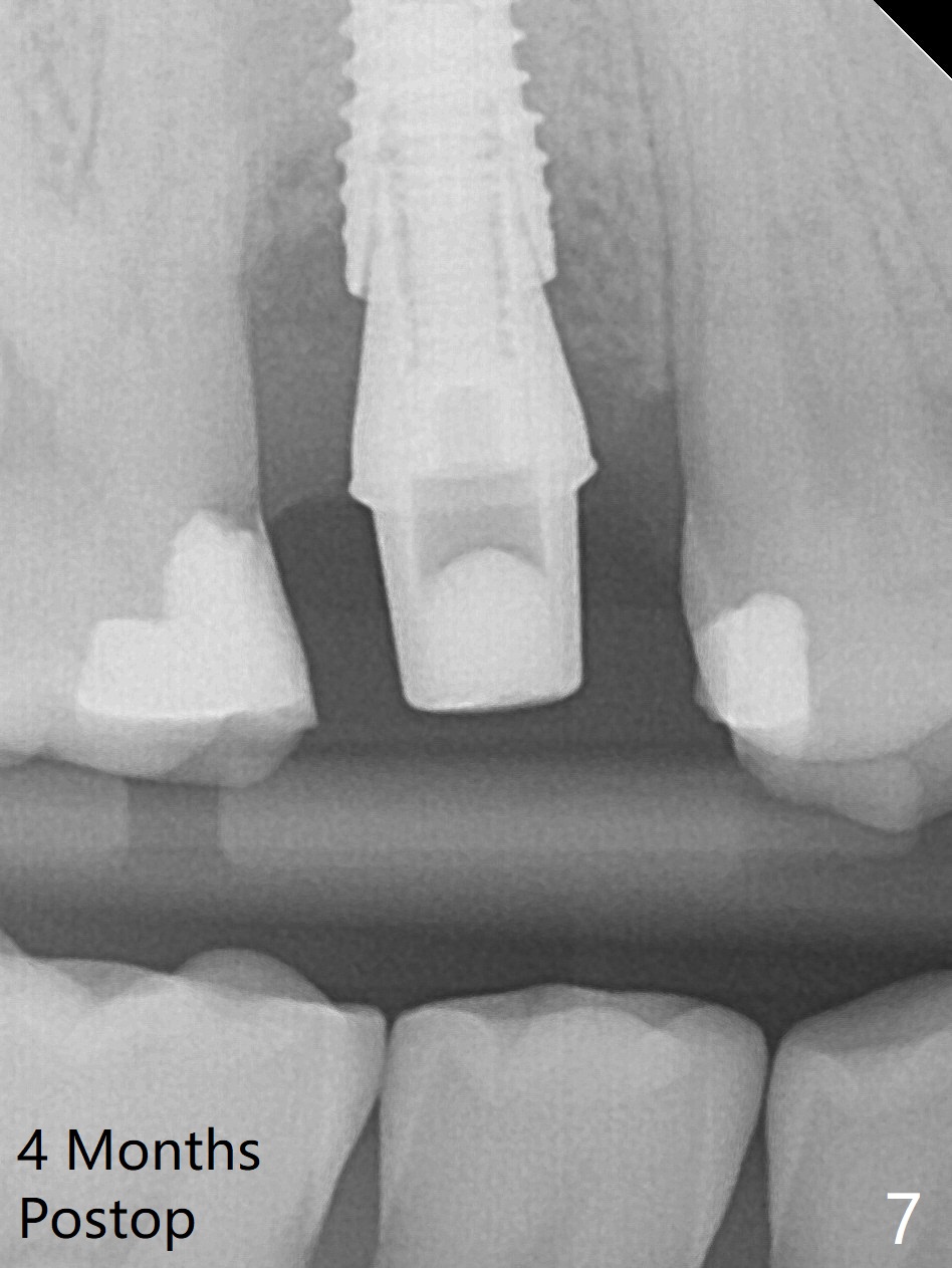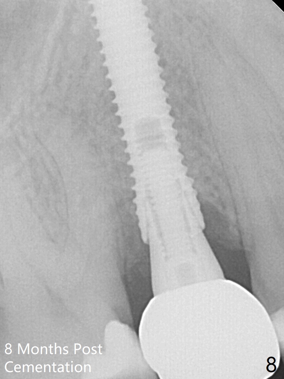 When the tooth #4 with vertical root fracture (Fig.1) is extracted, the buccal plate is found to be lost. The lowest point of the defect is shown as black dashed line in Fig.2 (yellow dashed line: sinus floor). After use of 2.5 mm reamer for 21 mm (buccal gingival level) and 3.0 mm reamer for ~17 mm, a 3.8x15 mm dummy implant is placed with 30 Ncm and 1.85 mm apical space (Fig.3 pink outline). A 3.8x18 mm (definitive) implant is placed with <40 Ncm with the implant plateau apical to the lingual crest (Fig.4,5). The buccal plate defect is repaired by Vanilla Graft (Fig.6 *) before and after insertion of a 4.5x4(3) mm abutment. The buccal plate defect seems to being repaired 4 months postop (Fig.7). Occlusal wear suggests bruxism, which is also associated with the root fracture. Night guard is recommended. The defect repair is close to completion 8 months post cementation (Fig.8). The crown/abutment is found to be loose 1 year 4 months post cementation and retightened without checking whether there is clinical 2nd DO caries of #3 (Fig.9, "sensitive to water pik"). A few days later, DO composite is being removed. It is difficult to determine whether the 2nd DO caries or gap has been removed with the neighboring crown in place. When the crown/abutment is removed and gingival retractions are inserted, there is no decay. The gap is removed. With Toflemire in place, the crown/abutment is reseated and hand tightened; after packable composite, the crown/abutment is removed, there is no more DO gap.