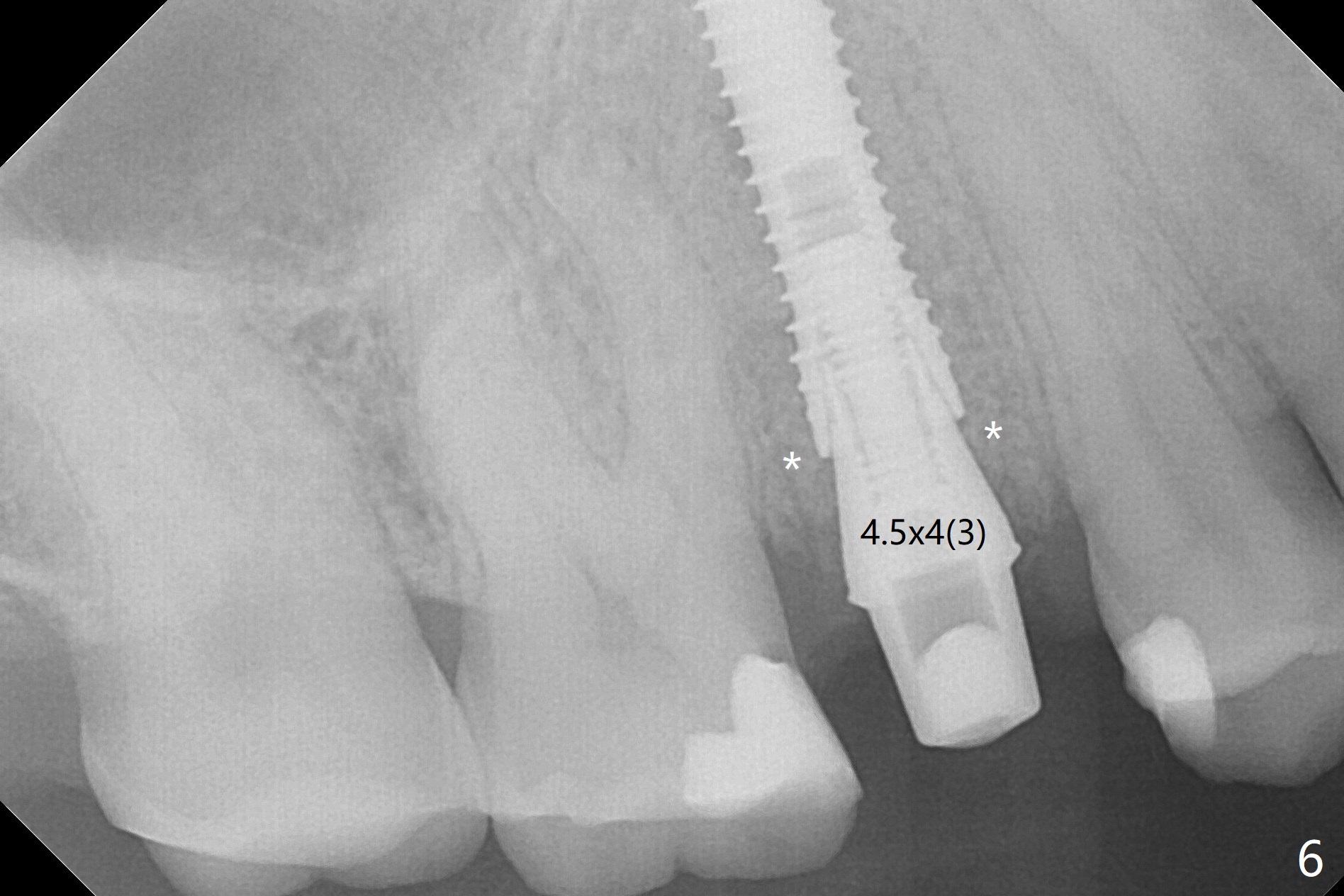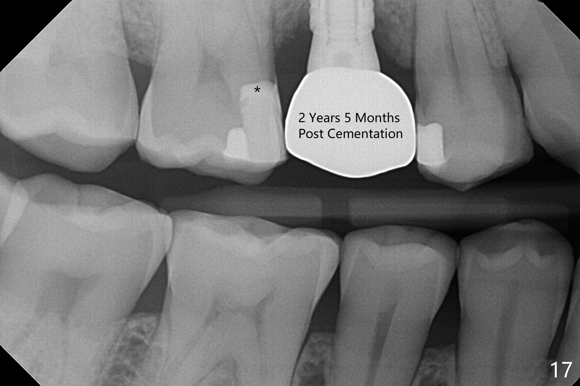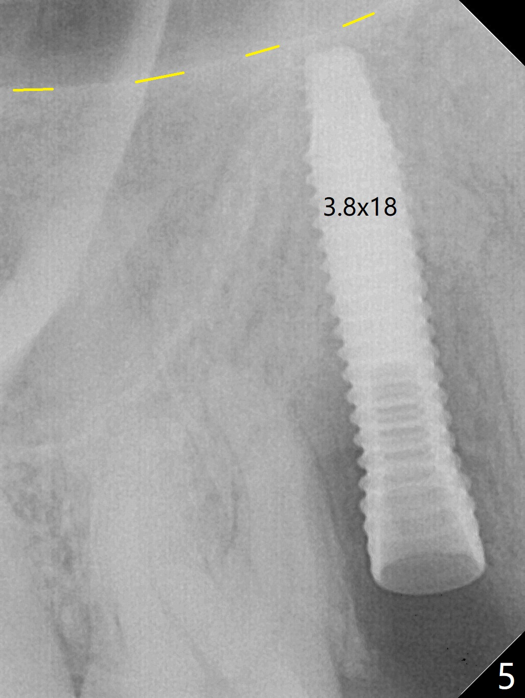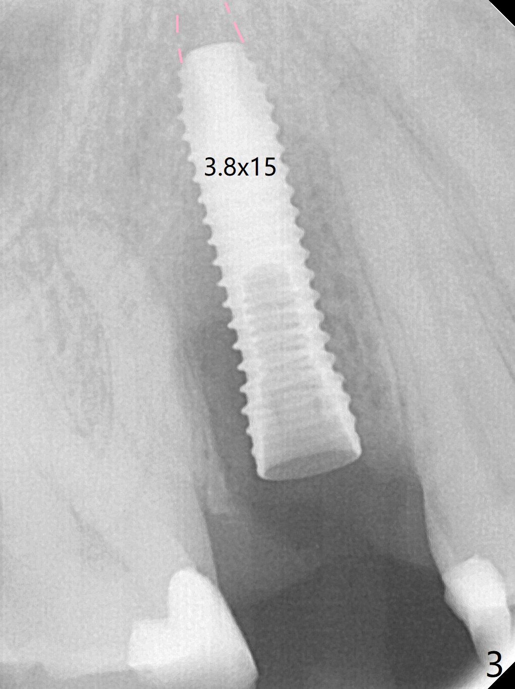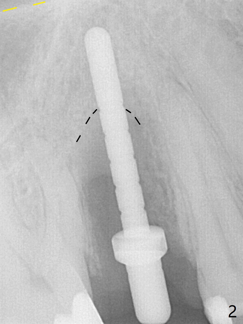 When the tooth #4 with vertical root fracture (Fig.1) is extracted, the buccal plate is found to be lost. The lowest point of the defect is shown as black dashed line in Fig.2 (yellow dashed line: sinus floor). After use of 2.5 mm reamer for 21 mm (buccal gingival level) and 3.0 mm reamer for ~17 mm, a 3.8x15 mm dummy implant is placed with 30 Ncm and 1.85 mm apical space (Fig.3 pink outline). A 3.8x18 mm (definitive) implant is placed with <40 Ncm with the implant plateau apical to the lingual crest (Fig.4,5). The buccal plate defect is repaired by Vanilla Graft (Fig.6 *) before and after insertion of a 4.5x4(3) mm abutment. The buccal plate defect seems to being repaired 4 months postop (Fig.7). Occlusal wear suggests bruxism, which is also associated with the root fracture. Night guard is recommended. The defect repair is close to completion 8 months post cementation (Fig.8). The crown/abutment is found to be loose 1 year 4 months post cementation and retightened without checking whether there is clinical 2nd DO caries of #3 (Fig.9, "sensitive to water pik"). A few days later, DO composite is being removed. It is difficult to determine whether the 2nd DO caries or gap has been removed with the neighboring crown in place. When the crown/abutment is removed and gingival retractions are inserted, there is no decay. The gap is removed. With Toflemire in place, the crown/abutment is reseated and hand tightened; after packable composite, the crown/abutment is removed, there is no more DO gap.