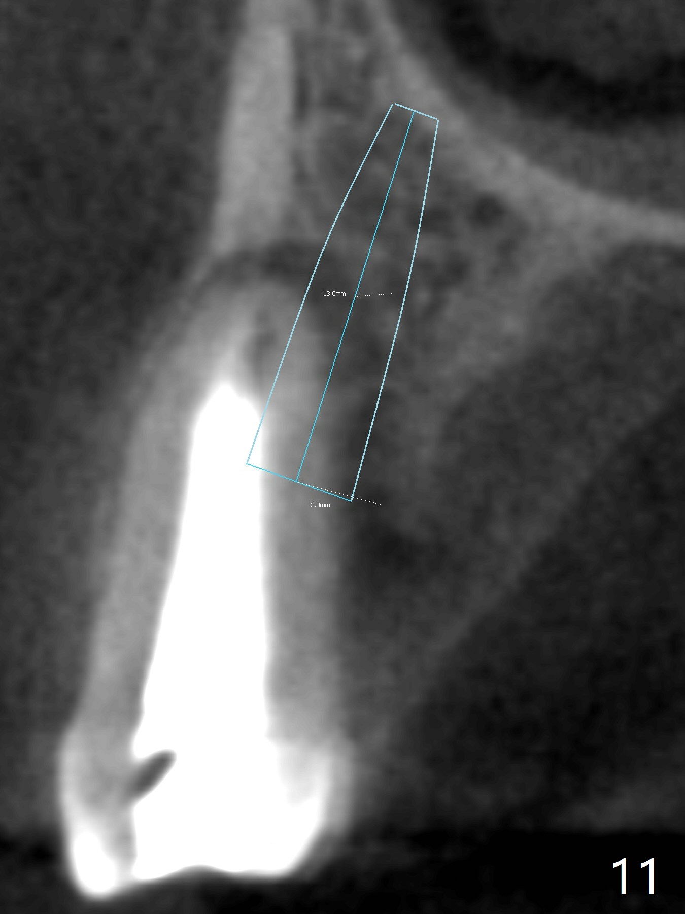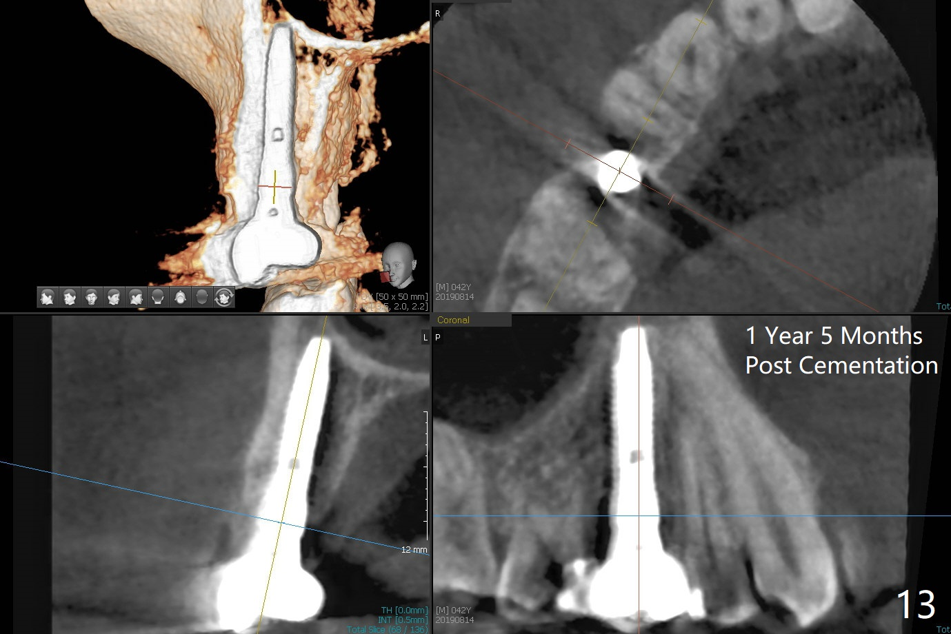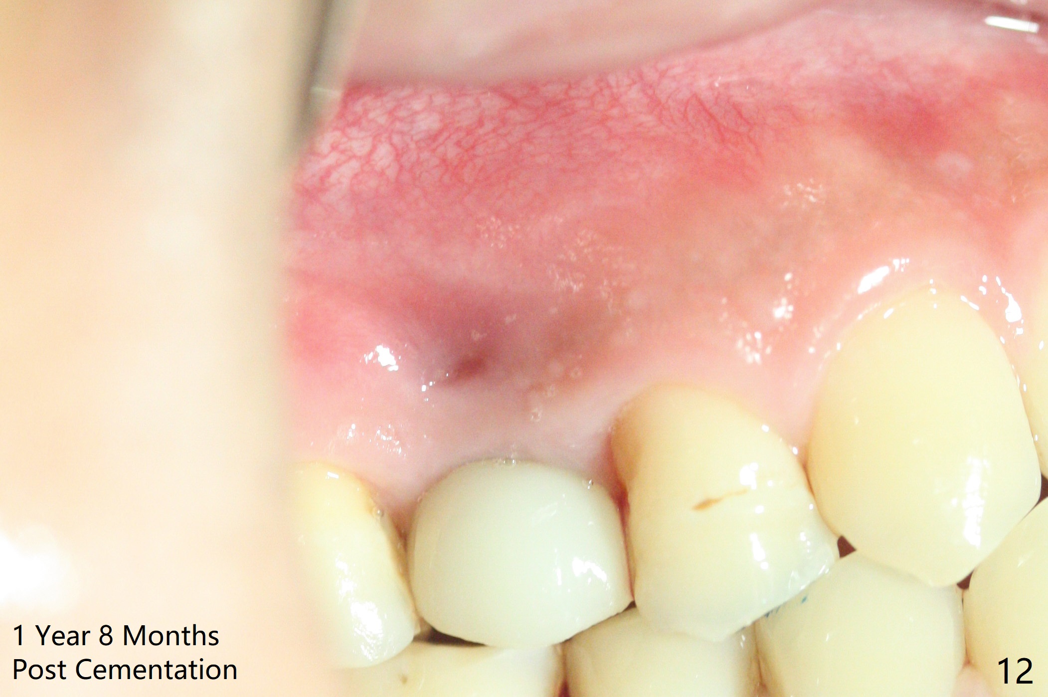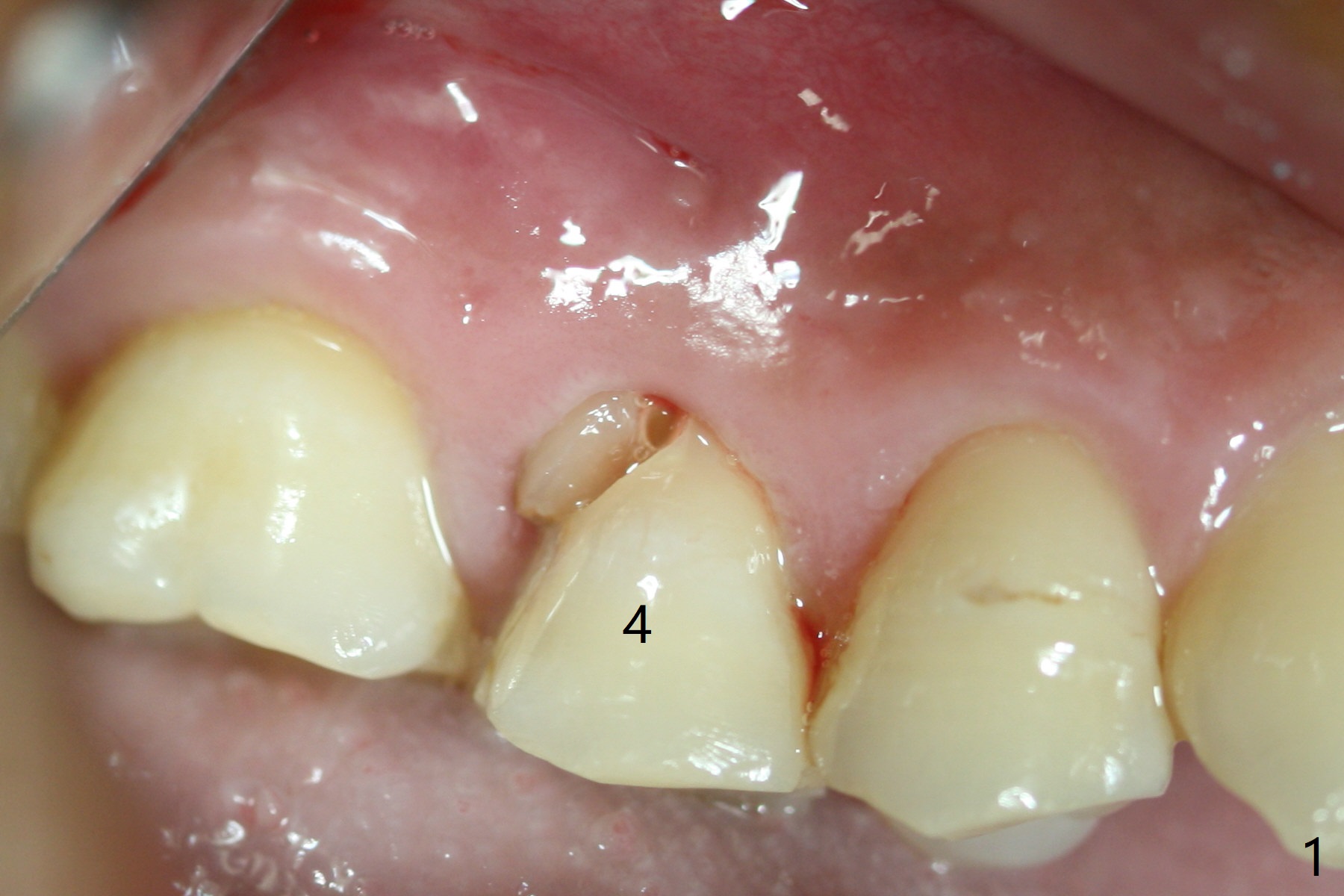 When the tooth #4 with vertical root fracture (Fig.1) is extracted, the buccal plate is found to be lost. The lowest point of the defect is shown as black dashed line in Fig.2 (yellow dashed line: sinus floor). After use of 2.5 mm reamer for 21 mm (buccal gingival level) and 3.0 mm reamer for ~17 mm, a 3.8x15 mm dummy implant is placed with 30 Ncm and 1.85 mm apical space (Fig.3 pink outline). A 3.8x18 mm (definitive) implant is placed with <40 Ncm with the implant plateau apical to the lingual crest (Fig.4,5). The buccal plate defect is repaired by Vanilla Graft (Fig.6 *) before and after insertion of a 4.5x4(3) mm abutment. The buccal plate defect seems to being repaired 4 months postop (Fig.7). Occlusal wear suggests bruxism, which is also associated with the root fracture. Night guard is recommended. The defect repair is close to completion 8 months post cementation (Fig.8). The crown/abutment is found to be loose 1 year 4 months post cementation and retightened without checking whether there is clinical 2nd DO caries of #3 (Fig.9, "sensitive to water pik"). A few days later, DO composite is being removed. It is difficult to determine whether the 2nd DO caries or gap has been removed with the neighboring crown in place. When the crown/abutment is removed and gingival retractions are inserted, there is no decay. The gap is removed. With Toflemire in place, the crown/abutment is reseated and hand tightened; after packable composite, the crown/abutment is removed, there is no more DO gap.