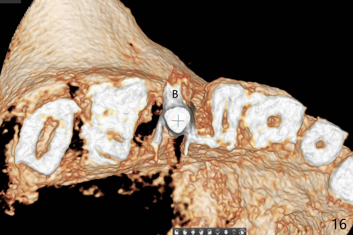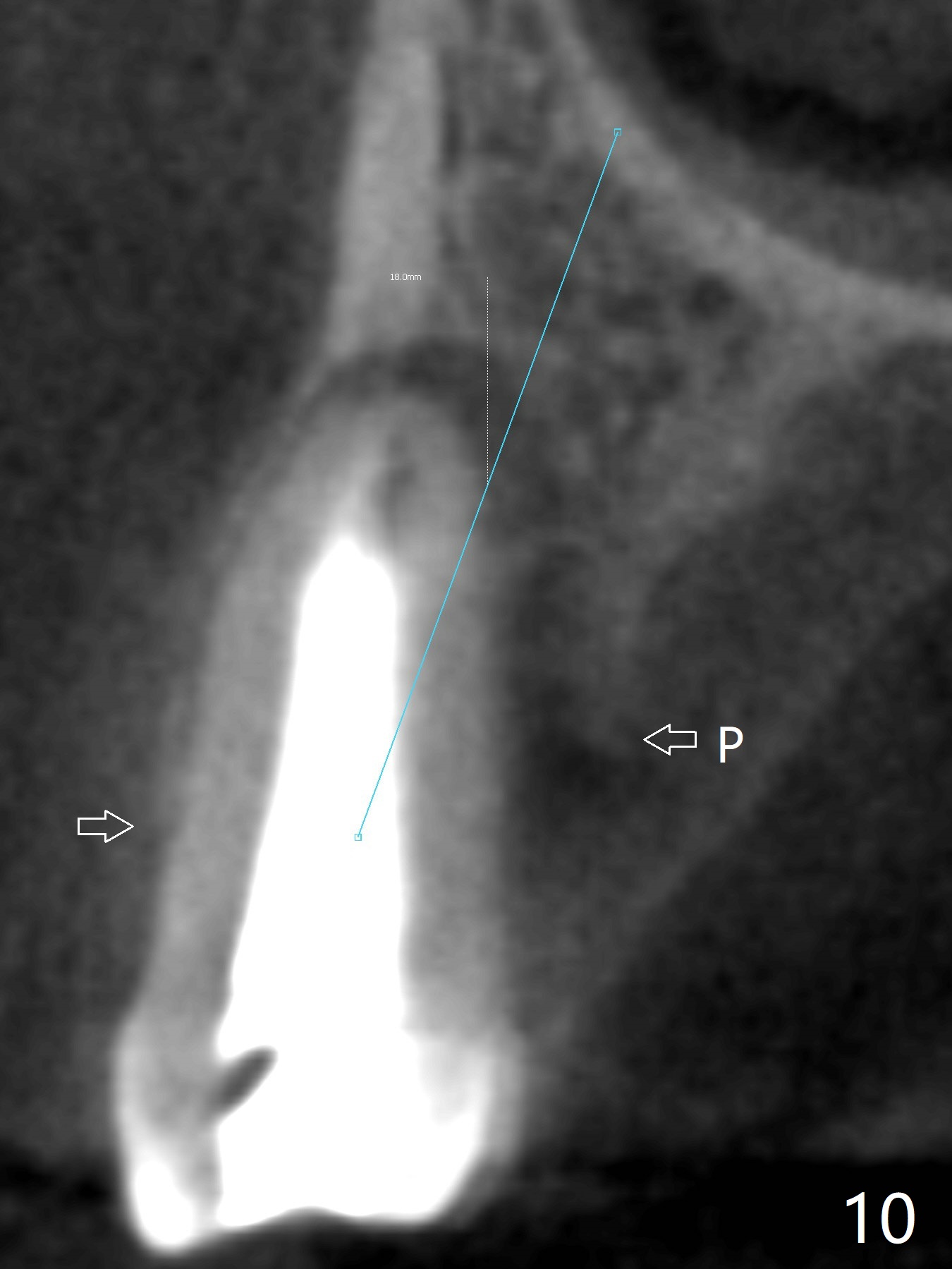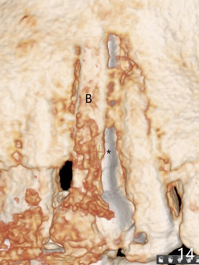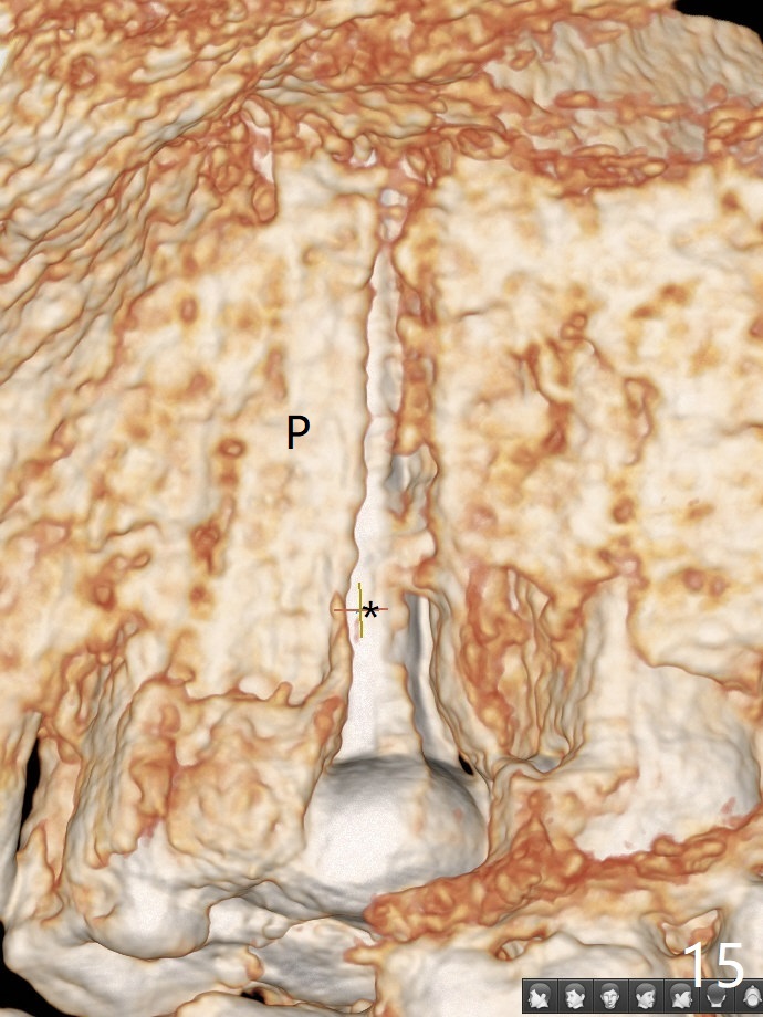 In fact there is a small buccal fistula, which is communicated with the underlying implant threads. Although preop CT shows that the buccal crest is lower than the palatal (3.8x13 mm, Fig.10 P) one, intraop finding of missing buccal plate should dictate a shorter implant (Fig.11) or onlay graft to avoid periimplantitis. Regeneration of the bone plate is limited. Later the fistula disappears with formation of a concavity (Fig.13). There is no symptom. Is bone graft necessary with a remote incision? 3-D images of CT taken 1 year 5 months post cementation show possible mesiobuccal and distopalatal bony defects (Fig.13-16). It is possible that bone graft was placed enough palatal (Fig.16). DO composite at #3 is redo satisfactorily (Fig.17 *).