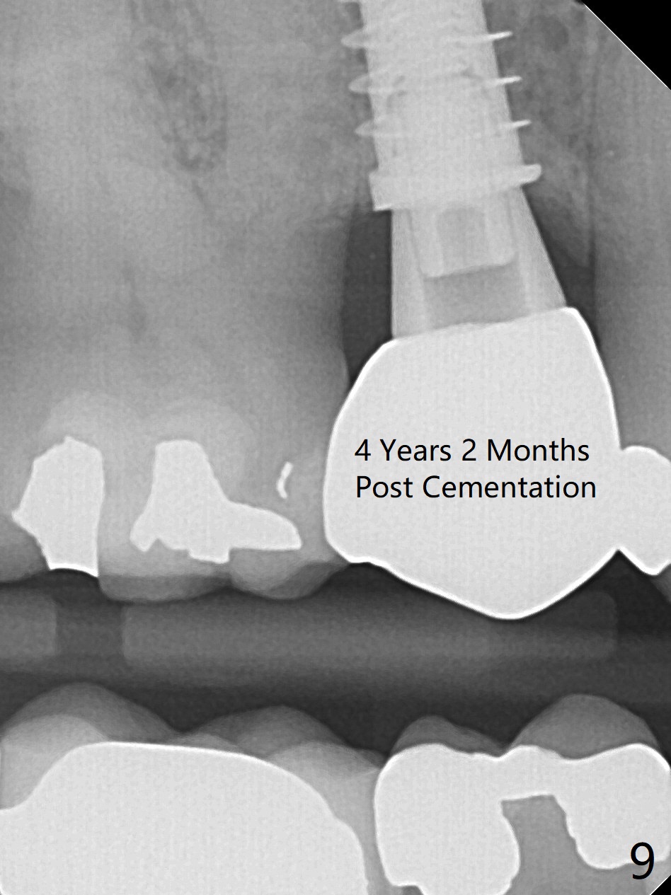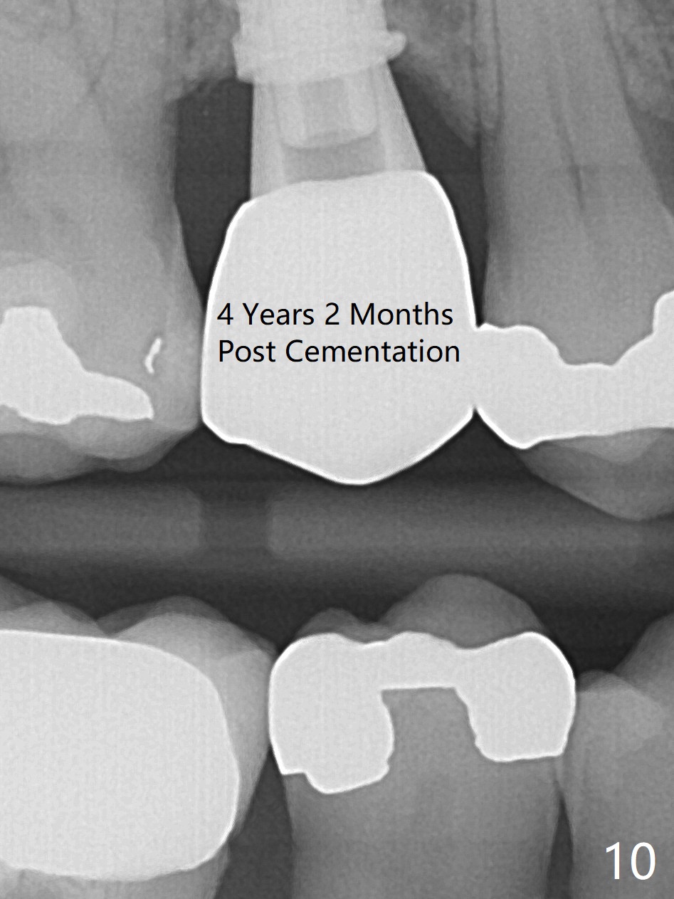 To prevent sinus lift related sinusitis, a shorter implant is going to be placed (Fig.1), approximately 2 mm beyond the apex. Following extraction, the buccal plate (Fig.3a (coronal section): B) is not only ~ 2 mm shorter than the palatal one (P), but also thinner. Since the bone density of the palatal plate is higher, without osteotomy an implant is less likely placed in the middle of the socket (S (Fig.1); Fig.3b) than buccal (Fig.3c). Therefore drills are used to form osteotomy in the apical 1/3 of the palatal slope (Fig.3d (red arrow); SM: sinus membrane). When 3.3 mm Magic Drill (MD) is in place (Fig.2), the distal surface of the sinus septum is perforated without air leakage. Demineralized allograft (.0125-.085) is placed for sinus lift (Fig.4 *) prior to placement of 4.5x11 mm implant with ~ 30 Ncm. The implant is slightly buccal to the ideal position indicated in Fig.3e (curved blue line: sinus lift). A 4.5x4(2) mm pair abutment is placed for an immediate provisional to hold mineralized allograft in the remaining socket gaps (Fig.4 arrowheads, .5-1.5 mm). A 9 mm implant may avoid sinus floor perforation on the distal slope of the 2nd premolar. The osteotomy should have been established initially as mesial as possible. In fact the patient has nasal hemorrhage while sneezing for the first 2 days postop. Although he complains of pain buccal to the implant, the gingiva appears to heal 7 days postop (Fig.5). The distobuccal papilla appears to be displaced somewhat. Raising mucoperiosteal flap is most likely associated with postop pain and esthetic compromise. The implant appears to have osteointegrated 5 months postop (Fig.6). A 4.5 mmx15° 3 mm cuff angled abutment is placed for final restoration. The distolingual portion of the implant is supported by the regenerated bone 3 years post cementation (Fig.7,8). There is no bone loss 4 years 2 months post cementation (Fig.9,10).