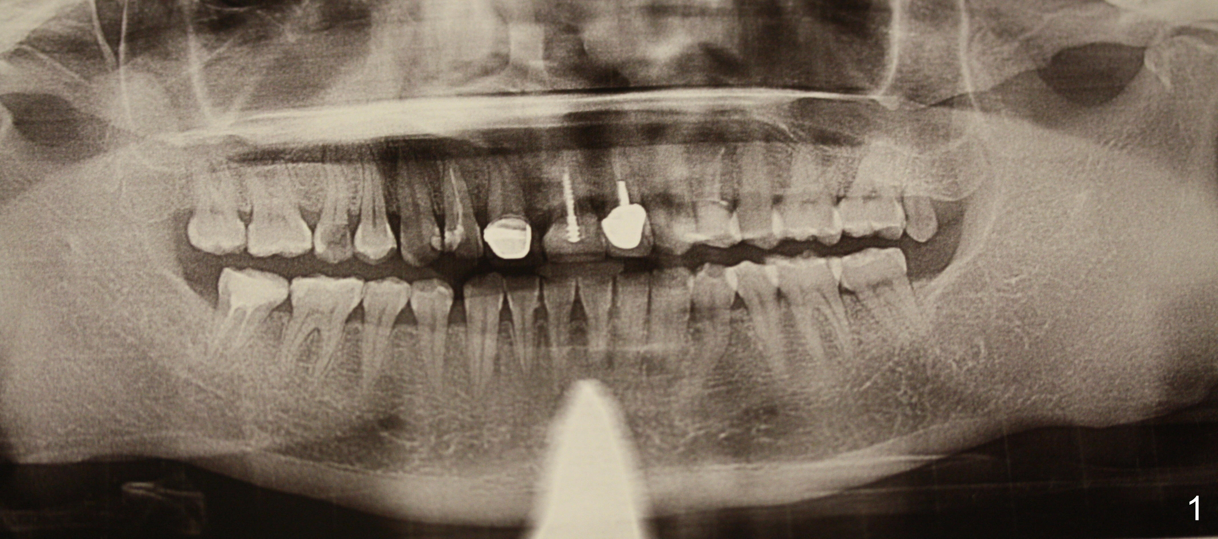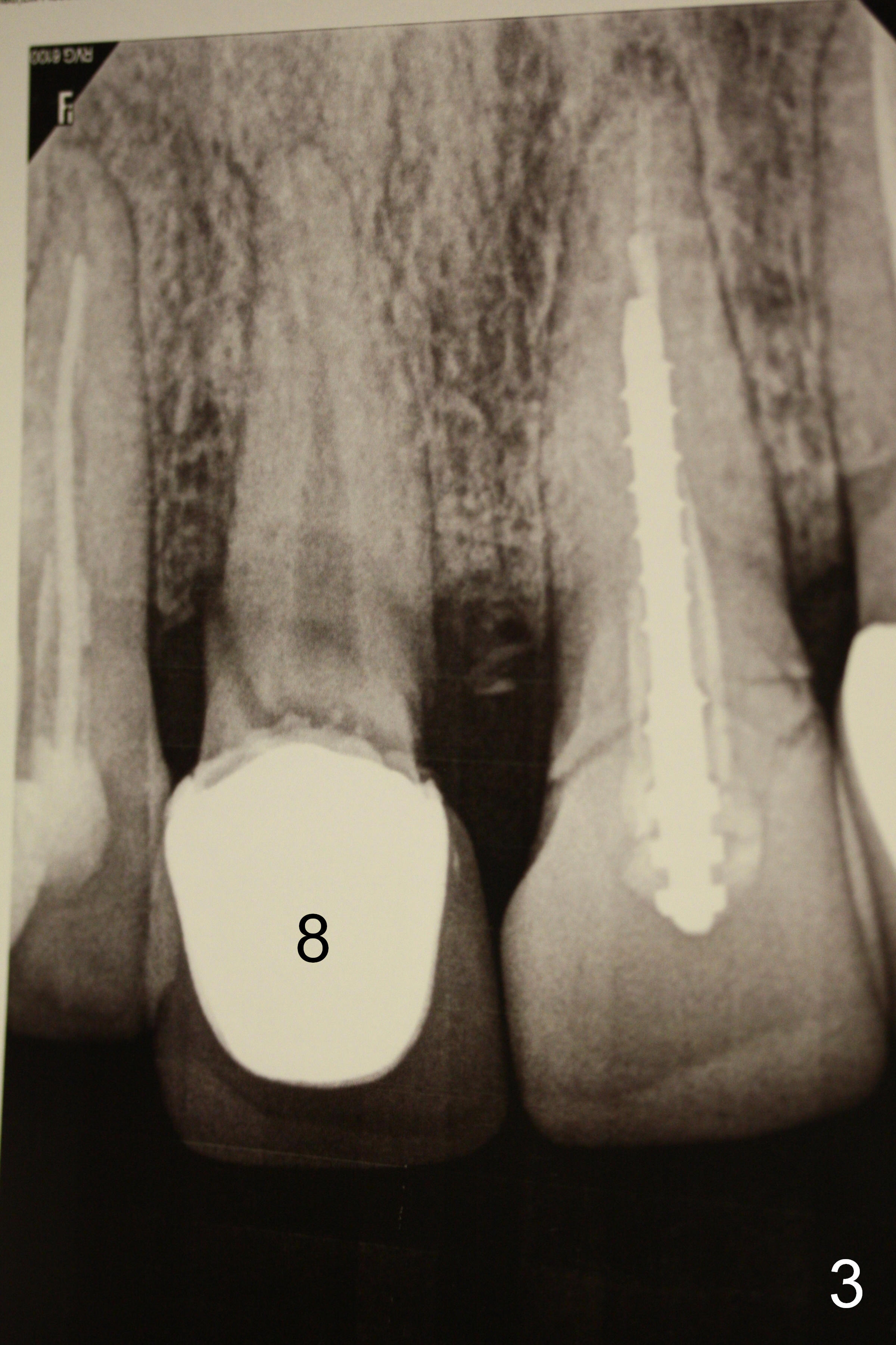 A 40-year-old lady has multiple restorations (Fig.1). Two of them require implants (#4 (Fig.2, severe caries) and #8 (Fig.3, root fracture). The root of #4 is long and curved (Fig.2). It may present a challenge to extraction, but not implant placement. The narrow and long root is favorable to primary stability. A 2 mm pilot drill is used to initiate osteotomy in the palatal wall of the socket, followed by 2.5 and 3 mm reamers at 17 mm (gingival level). If the bone is soft, the depth for the 3 mm reamer will be reduced to 14 mm. A 4.5x20 mm Tatum tapered tap will be used at 17 mm deep to test stability.