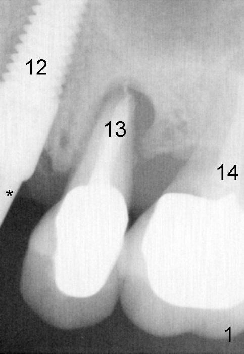As soon as the tooth #12 is extracted and replaced with immediate implant, the patient feels that pain shifts to the tooth #13 (Fig.1 taken 3 months post implantation of #12; *: abutment). By the 7th months postop (Fig.2 C: crown), the patient agrees to have a 2nd implant for the tooth #13. Thorough debridement of the socket is planned. Sinus lift is expected. Take preop PA and photos.