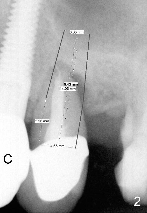 To place bone graft efficiently, prepare 4 small pieces of gauze in a dap pen dish. Dissolve Clindamycin with 2% Xylocaine (or 4% Septocaine) with 1:50,000 Epinephrine. Use 3 pieces of gauze as usual, followed by normal saline irrigation. Thoroughly debride the socket, since there is a fistula buccodistally. Finish sinus lift and bone expansion/condensation with RT2,3, followed by 4.5x17 mm tap at the depth 14 mm. The first intraop PA is taken. If the bone is dense, use a 2 mm pilot drill to start osteotomy.