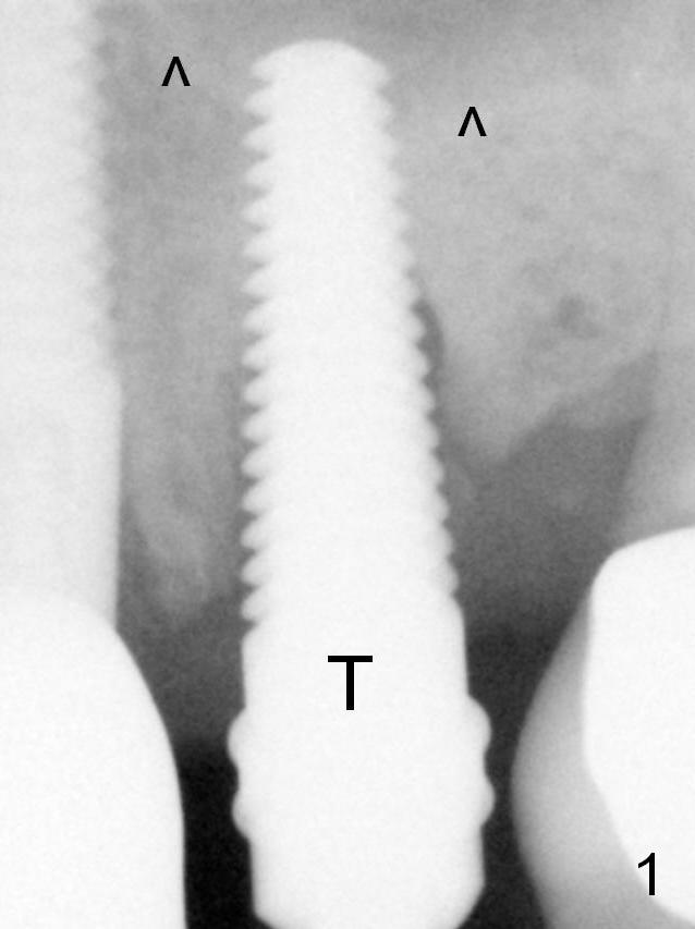 Extraction of the affected 2nd premolar is easy; the apical bone is so hard that drill (2 mm) and reamers (2.5 and 3 mm) have to be used for osteotomy, followed by insertion of a 4.5 mm tap with stability (Fig.1 T). The sinus floor (^) is lifted. There is no sinus membrane perforation. There is no sign of sinus membrane perforation before placement of a 4.5x14 mm implant (Fig.2 I); sinus lift is performed (*, with mixture of autogenous bone (from reamers), allograft and Osteogen). Arrowheads: remaining mesial and distal sockets, which will be bone grafted after provisional fabrication. Bone density in the mesial and distal sockets increases after bone graft (Fig.4: arrowheads). The distal threads appear not covered by the bone, with mild distal crestal bone resorption, 2.5 months postop (Fig.11 >). Panoramic X-ray is taken 3 years and 1 year 5 months post cementation for #12 and 13, respectively (Fig.12). The bone height increases at #13. Intraop Modification of Immediate Provisional Last Next Xin Wei, DDS, PhD, MS 1st edition 07/30/2015, last revision 05/25/2018 |