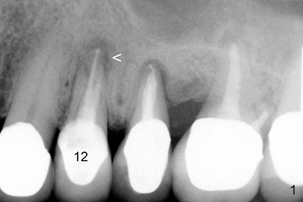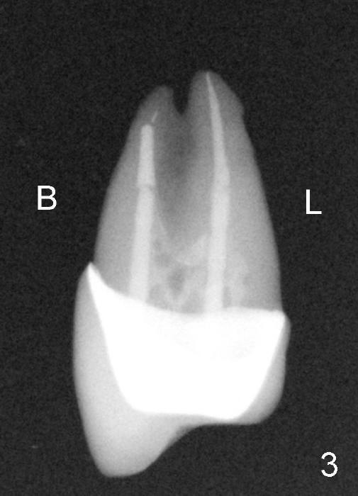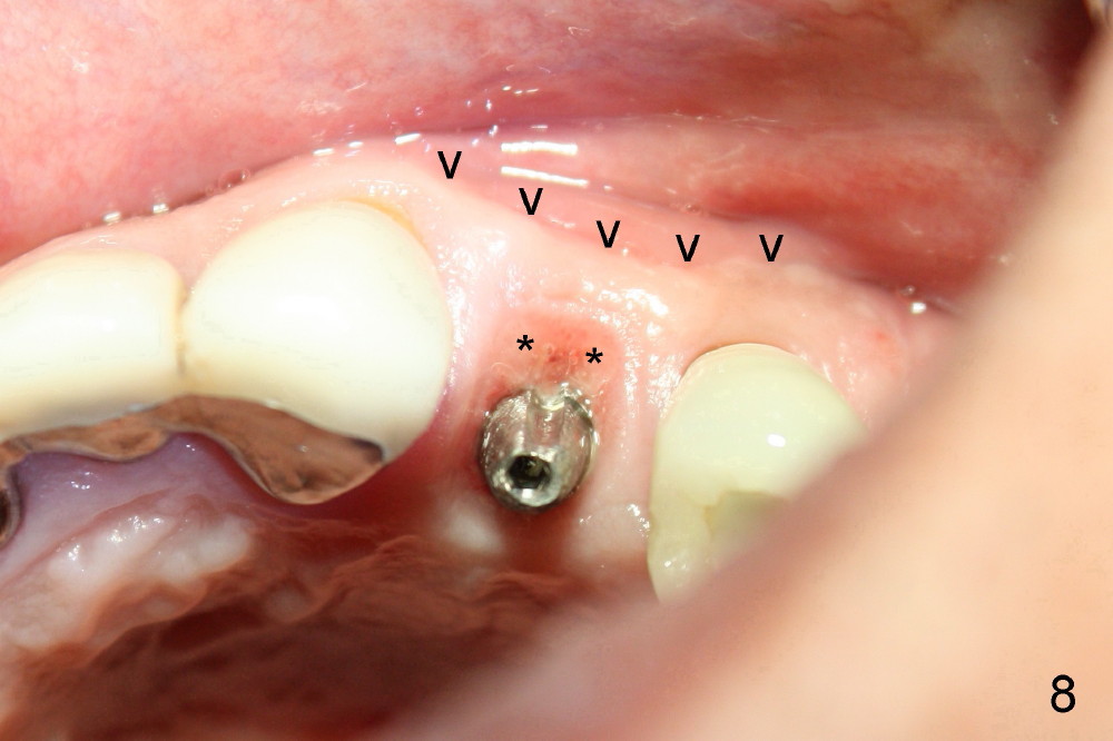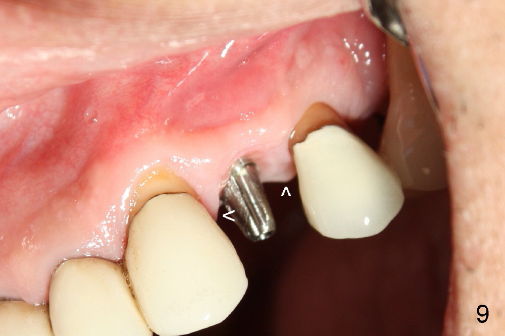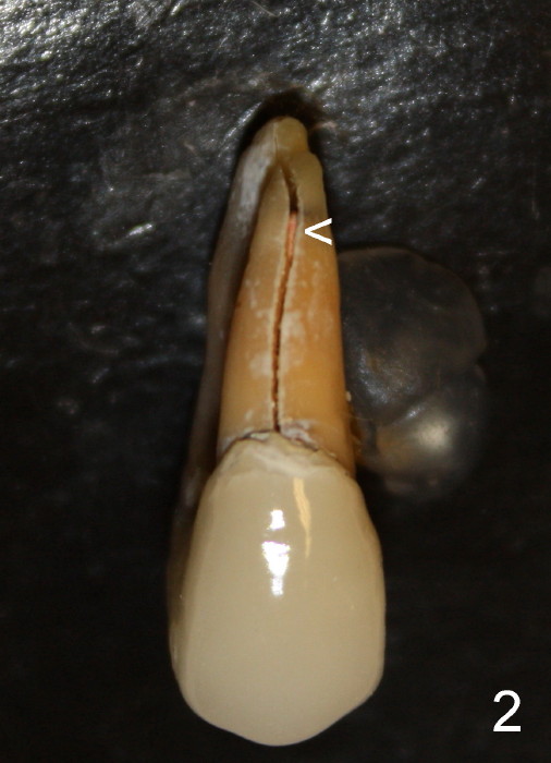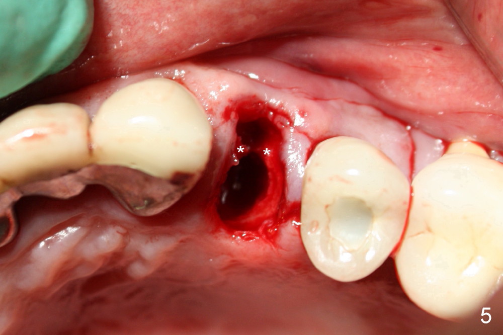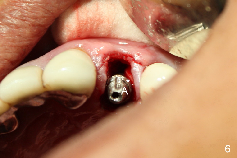 A 50-year-old man has mild pain in the upper left 1st bicuspid 3 years after root canal retreatment with placement of two posts (Fig.1). Findings of clinical exam are consistent with root fracture (Fig.2). Extraction reveals two fused roots (Fig.3,4). Probing indicates that the buccal plate is defective. Osteotomy is initiated in the palatal socket with a 2 mm pilot drill, followed by 2.5 and 3.0 mm reamers and 4.5x20 mm tap. The septum appears to have been pushed buccally (Fig.5 *) and form a new buccal wall (partially, strengthened by bone graft mentioned below) for the implant to be placed. The implant (4.5x20 mm) is placed in the palatal socket (Fig.6 *) with insertion of an abutment (A: 3.5x5 mm 0º), while a mixture of autogenous bone (harvested from reamers) and Synthograft (Bicon) is placed in the shrunken buccal socket (Fig.7; using allograft may decrease postop bony shrinkage). The bone graft is then contained by an immediate provisonal without collagen membrane or flaps. The patient is doing well postop. The gingiva is healthy (Fig.8*) when the provisional is removed 3 months postop with normal papillae (Fig.9 arrowheads). It remains the same 1 month post cementation (Fig.10,11). For further follow up, see immediate implant of the tooth #13.