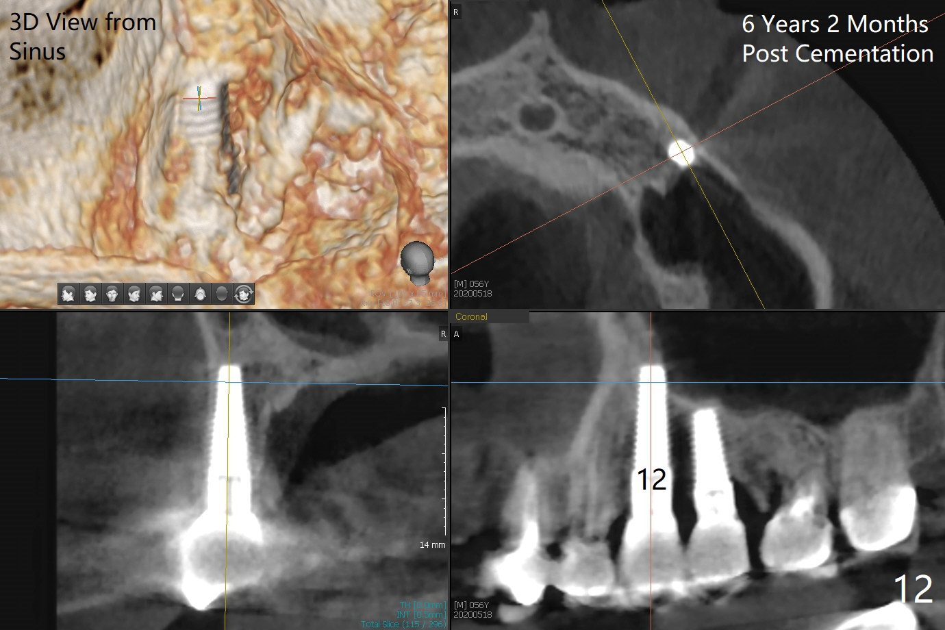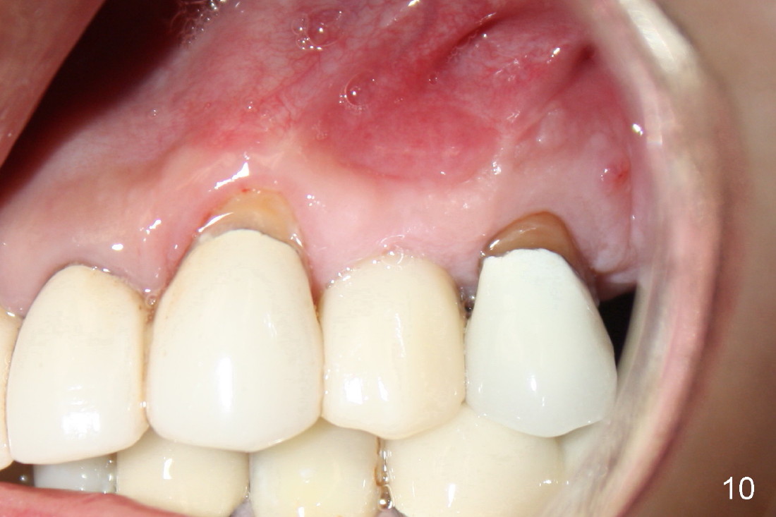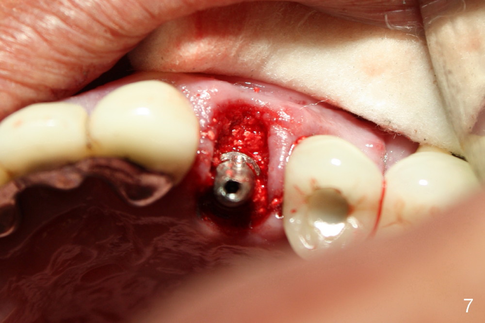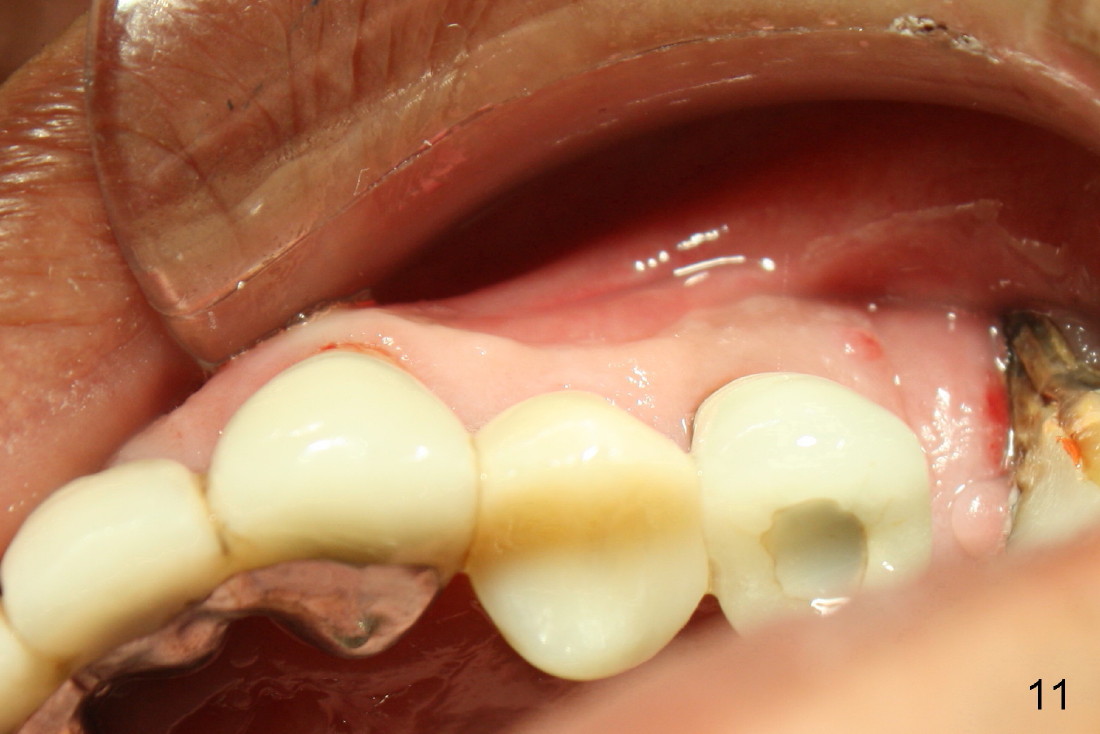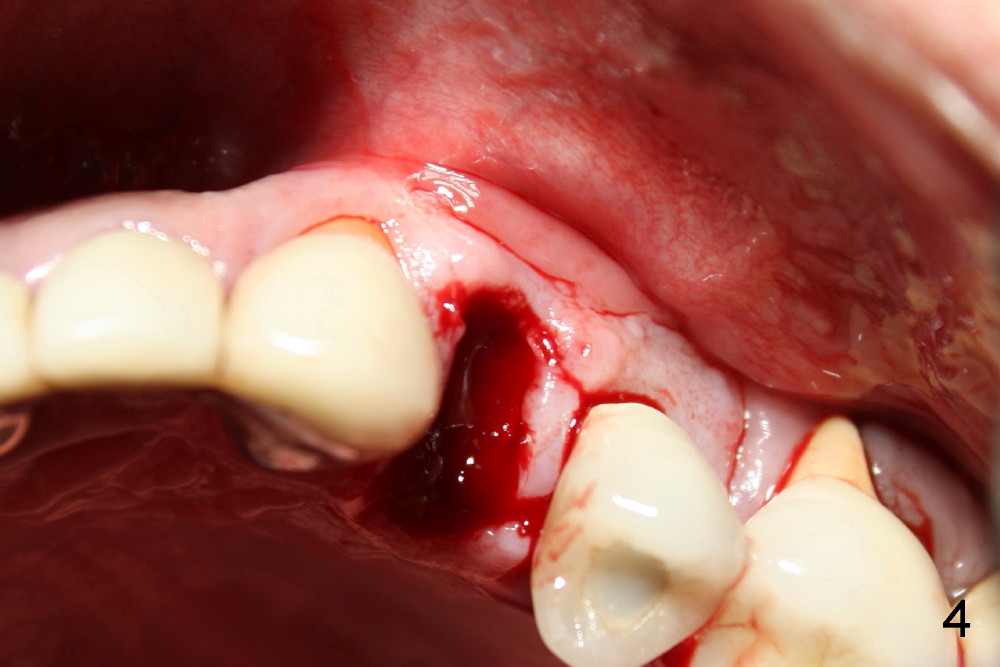 A 50-year-old man has mild pain in the upper left 1st bicuspid 3 years after root canal retreatment with placement of two posts (Fig.1). Findings of clinical exam are consistent with root fracture (Fig.2). Extraction reveals two fused roots (Fig.3,4). Probing indicates that the buccal plate is defective. Osteotomy is initiated in the palatal socket with a 2 mm pilot drill, followed by 2.5 and 3.0 mm reamers and 4.5x20 mm tap. The septum appears to have been pushed buccally (Fig.5 *) and form a new buccal wall (partially, strengthened by bone graft mentioned below) for the implant to be placed. The implant (4.5x20 mm) is placed in the palatal socket (Fig.6 *) with insertion of an abutment (A: 3.5x5 mm 0º), while a mixture of autogenous bone (harvested from reamers) and Synthograft (Bicon) is placed in the shrunken buccal socket (Fig.7; using allograft may decrease postop bony shrinkage). The bone graft is then contained by an immediate provisonal without collagen membrane or flaps. The patient is doing well postop. The gingiva is healthy (Fig.8*) when the provisional is removed 3 months postop with normal papillae (Fig.9 arrowheads). It remains the same 1 month post cementation (Fig.10,11). For further follow up, see immediate implant of the tooth #13.