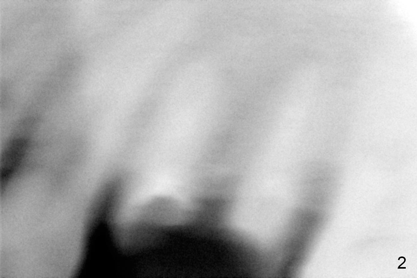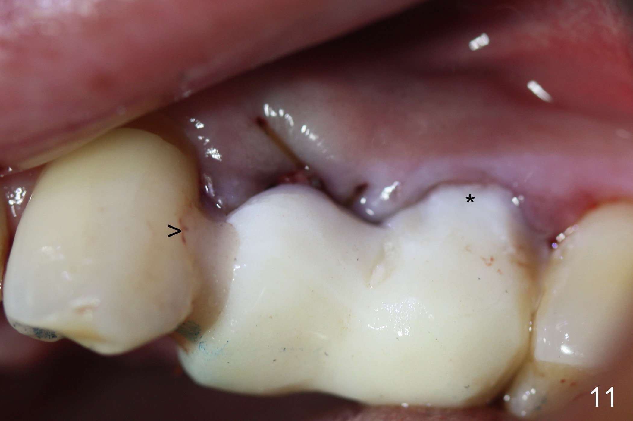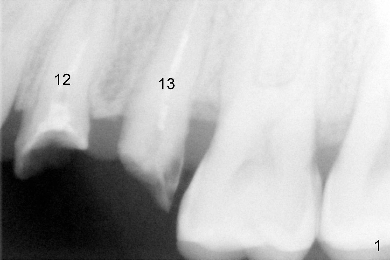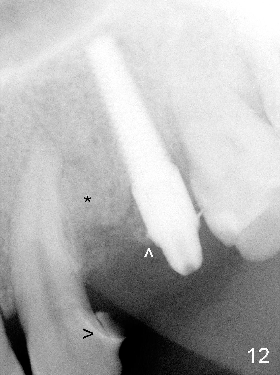 Taking 2 additional PAs with sensor 1 is frustrating (Fig.1,2), no apices shown. Osteotomy is done smoothly with 2 mm pilot drill at 20 mm, 2.5 mm reamer at 17 mm, and 3 mm reamer at 14 mm and 4.5x20 mm tap at 17 mm. The 1st intraop PA is taken with sensor 1 when 2 of 4.5x20 mm implants are placed (Fig.3); the implant at #12 is close to the root of the tooth #11. The 2nd PA is taken with sensor 2: the apex of #11 touches the implant at #12 (Fig.4). There is no separation when panoramic X-ray is taken (Fig.5). Effort is exerted to re-direct the osteotomy twice (Fig.6: tap; Fig.7: implant) without success. When the implant is removed, a PA is taken; it appears that the root of the tooth #11 has no damage (Fig.8). To obtain the best recovery, socket preservation is carried out with 50/50 cortical/cancellous allograft mixed with Osteogen (Fig.12 *) and Collagen Dressing (Fig.9: #12). A 2 (or 3)-unit provisional bridge (Fig.10: #12,13) is fabricated over the implant (Fig.9 I)/abutment (A) to cover these 2 sockets. After acid etching #11 D surface (Fig.9 >) and relining (Fig.11 *), the provisional bridge is bonded to the tooth #11 (Fig.11,12 black >) so that bone graft will be less likely dislodged.