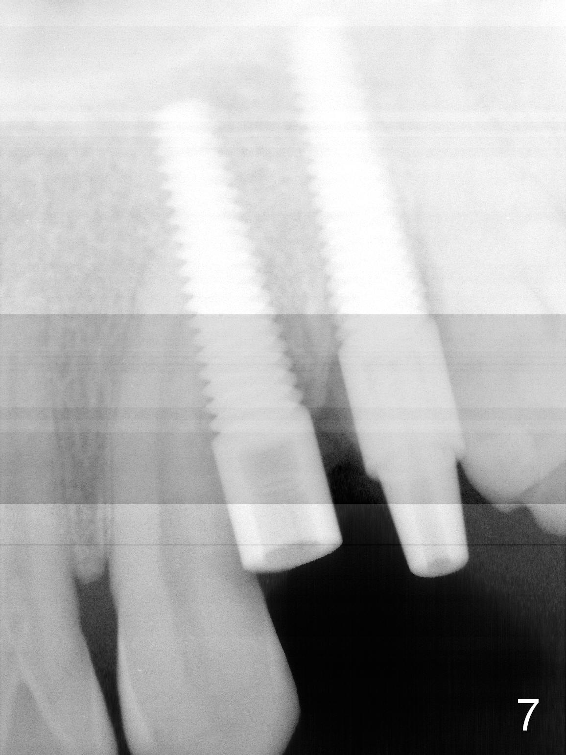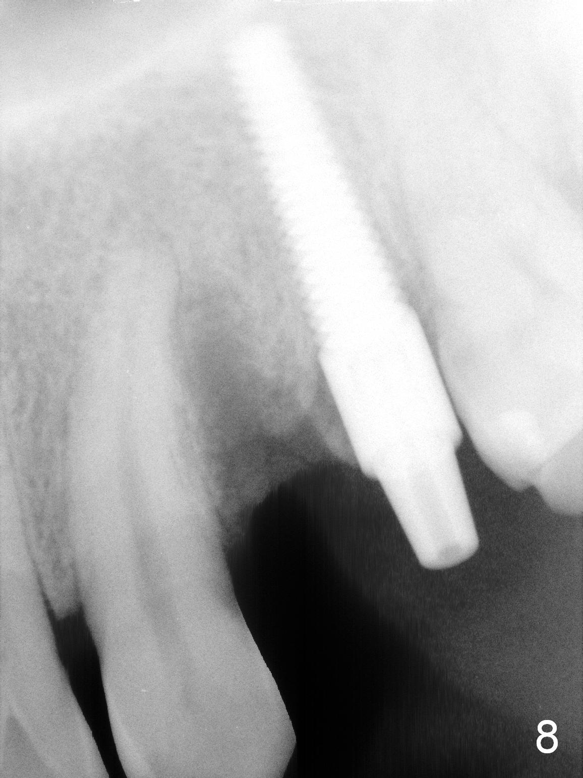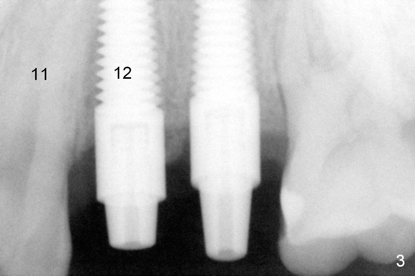 In brief, PA should be taken after pilot drill, no matter how easy the case seems to be. It is difficult to change trajectory later on. Careful analysis of preop PA is equally important. Implant should not be placed outside of PA. The patient will return for #12 implant placement for the 2nd time 2.5 months postop.