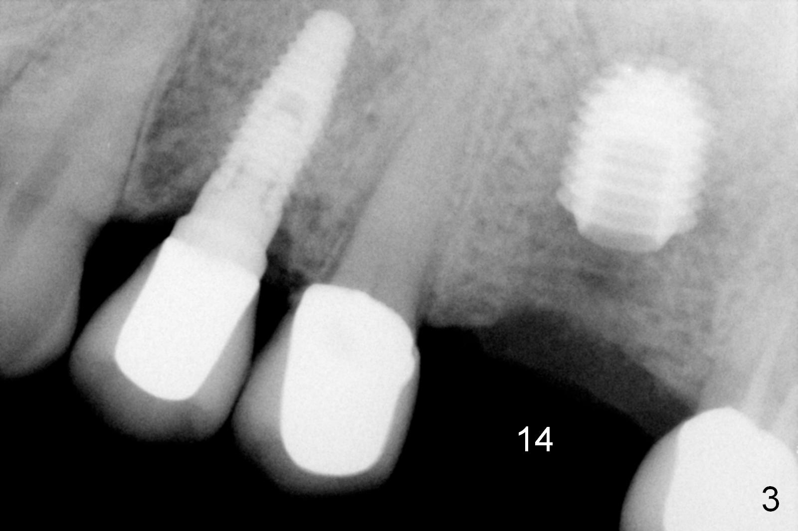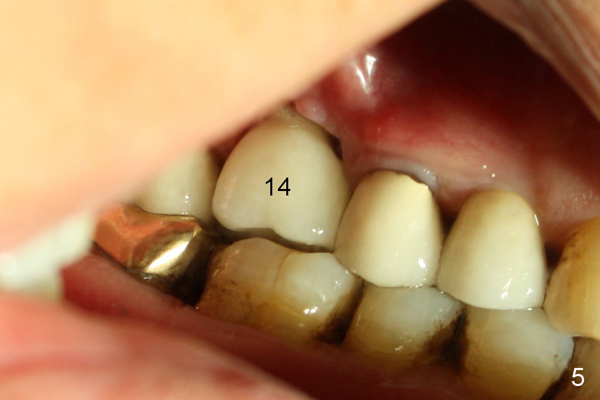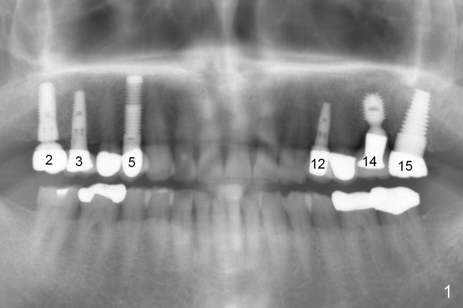A 73-year-old man returned for recall and had panoramic X-ray taken yesterday. The latter shows no bone loss associated with different types of implants (Fig.1). The implants (relatively small in diameter) and crowns were present at the sites of #3 and 12 when the patient presented to my clinic 6 years ago. His chief complaint was discomfort at #13-15 fixed partial denture (FPD). The tooth #15 seems to be without pathology. To increase its longevity, the FPD was removed (Fig.2), a 5x8 mm Bicon implant (short) was placed at #14 (5 years 11 months post cementation now) and single unit restorations were cemented at #13 and 15 (Fig.3). The occlusal table of the implant crown at #14 is narrow buccopalatally (Fig.4). The occlusal contact of the implant restoration is minimal (Fig.5), which is unfavorable for the weakened tooth (#15). The latter shows sign of failure 7 months post #14 crown cementation (Fig.6 >). The patient refused to accept treatment for #15. Seven months later, the tooth #5 fractured (1st sign of bruxism) and a 5x20 mm cylindrical Tatum tissue-level implant (long) was placed immediately (4 years 5 months in function now). Finally the patient agrees with immediate implant at #15 (7x17 mm tapered Tatum tissue-level implant, large). Follow up is 2 years 7 months post cementation. Ideally 2 implants should have been placed when the FPD was removed. To reduce deleterious effect of bruxism, the last implant was placed with bone expansion at the edentulous area at #2 (5.3x14 mm DIO submerged implant, 1 year 9 months post cementation now). The 2nd sign of bruxism is placement of inlay/onlay on the teeth #19 and 30 (Fig.1). The palatal cusp of the implant crown at #13 remains untreated. The 2 immediate implants at #5 and 15 happen not to have immediate provisional. In all, for a bruxer, an implant does not have to be large or long as long as implant trajectory is correct.