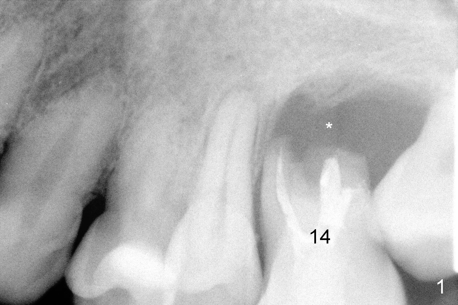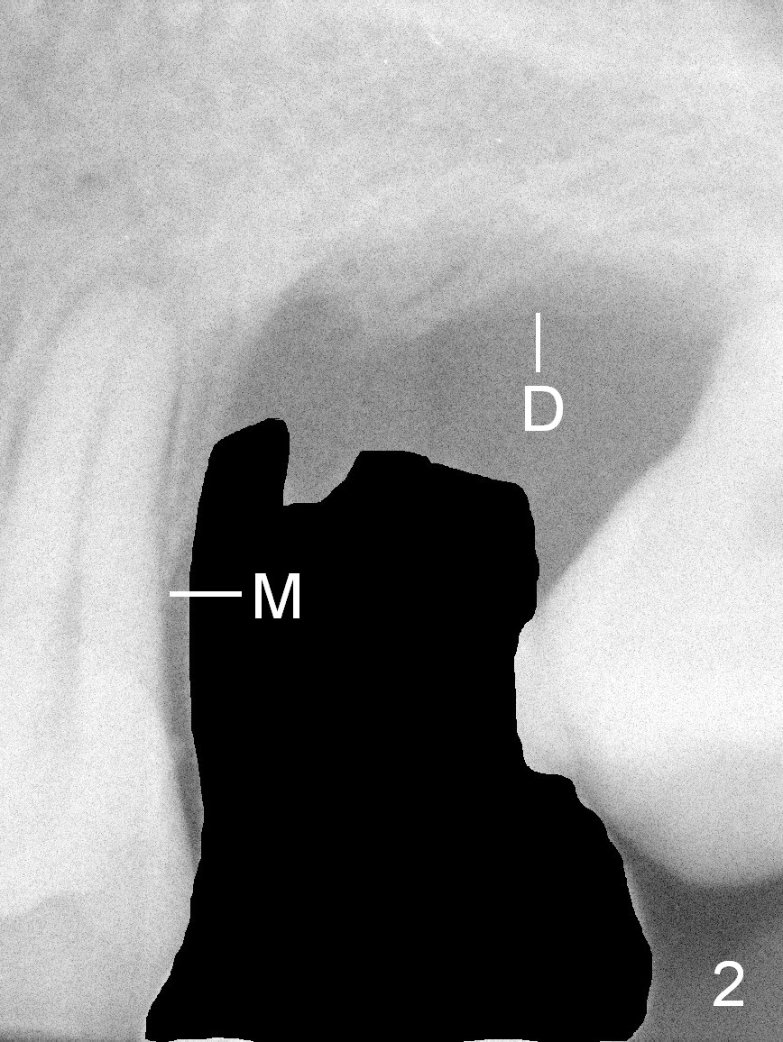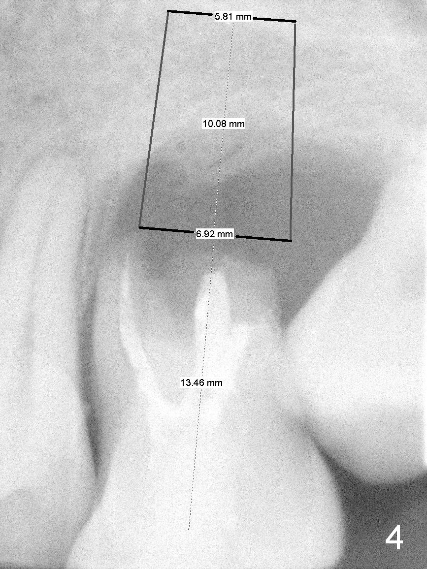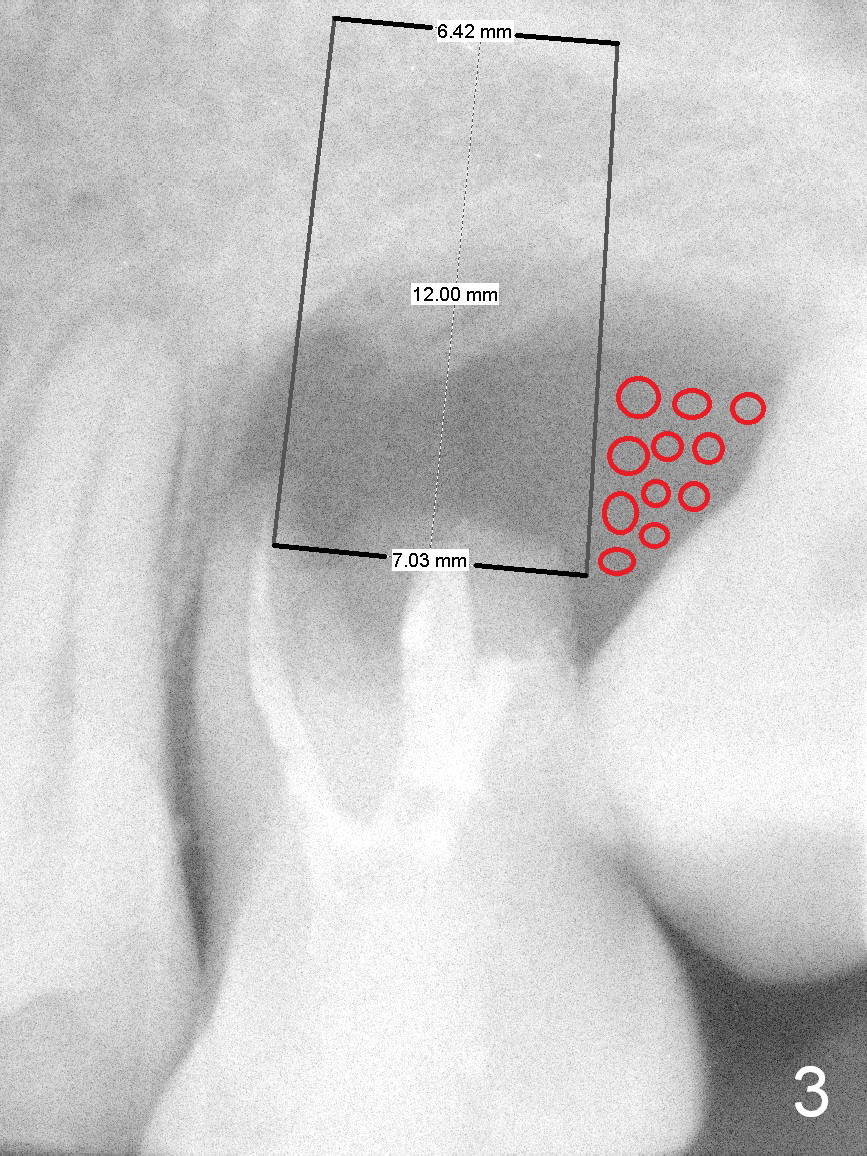 A 42-year-old man (XK) has perio-endo disease at the tooth #14. After root canal therapy (Fig.1), the tooth remains nonsalvageable. The bone loss is extensive (Fig.1 *) and uneven (more bone mesially than distally) after extraction (2% Xylocaine/1:50,000 Epinephrine). A bone-level implant is placed in an ideal depth (Fig.3 UF; Fig.4 SM), irrelevant of the gingival margin, first. Place bone graft distally (Fig.3 red circles) before choosing a proper abutment. For example, there is plenty of combination to choose cuff and abutment lengths for a SM or UF implant (Fig.4).