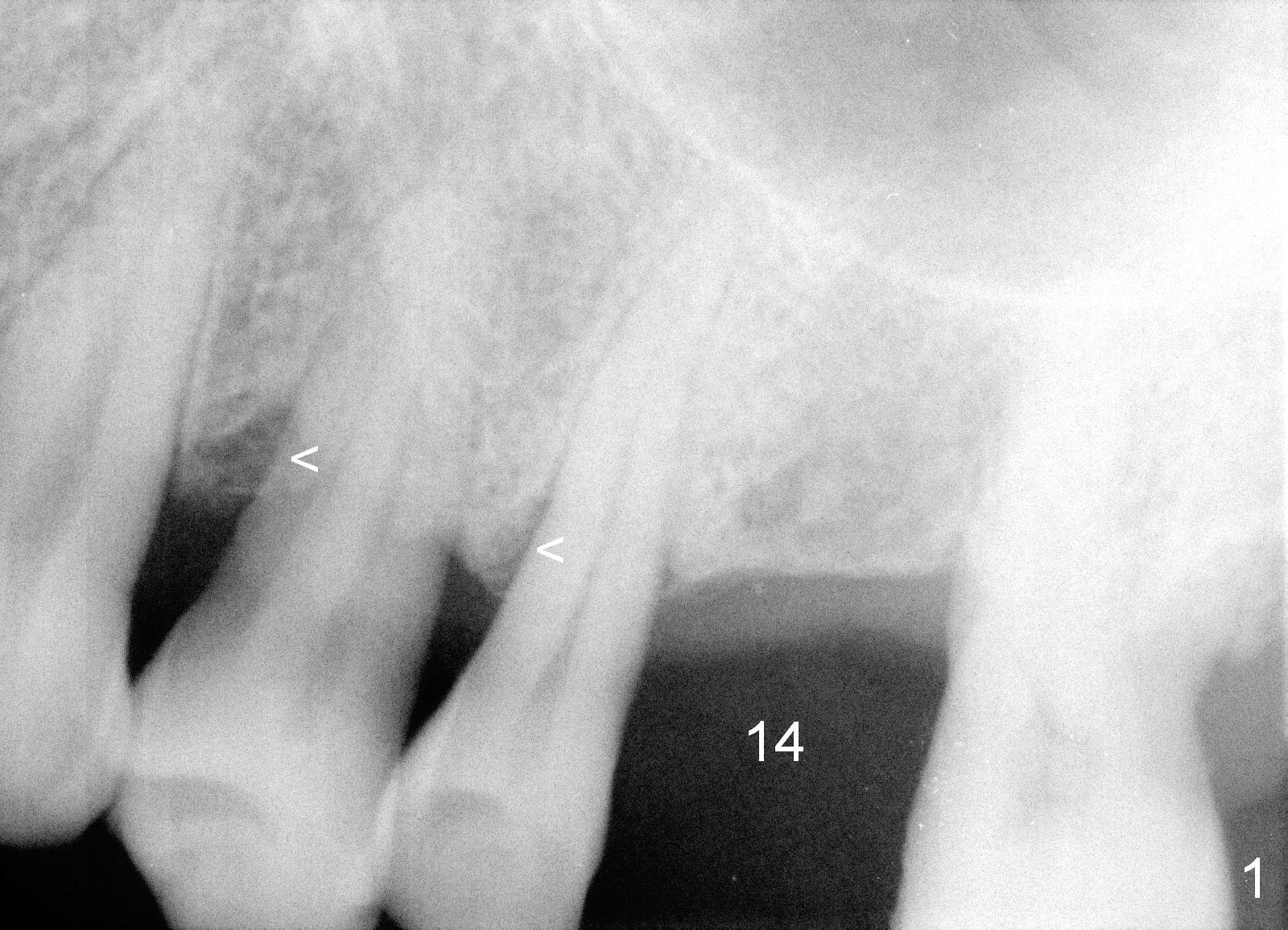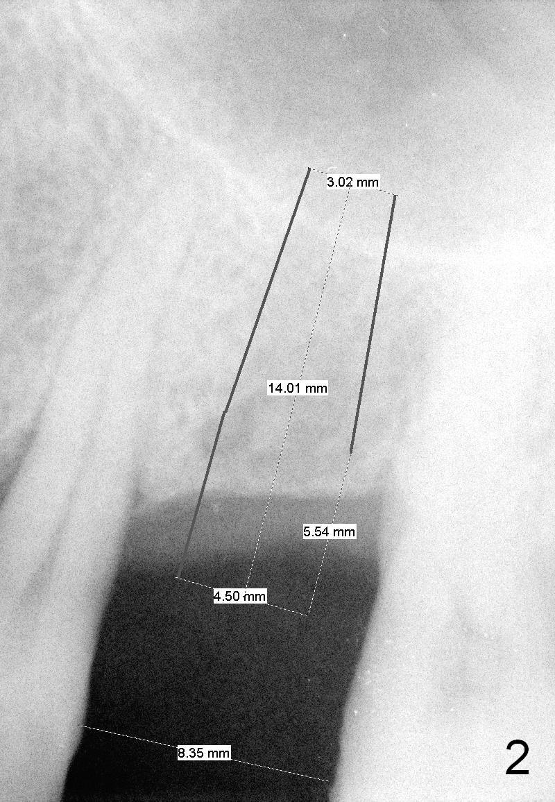 A 58-year-old man has multiple missing teeth including #14; the remaining teeth has sign of occlusal trauma (bone loss, Fig.1 arrowheads). The mesiodistal space of #14 is 8 mm (Fig.2). It appears that a 4.5x14 mm implant is appropriate for the site with sinus lift. Scalpel will be used to initiate osteotomy and bone expansion in case the bone density turns out to be low. To prevent the sinus membrane perforation, use a shorter implant (11 mm, Fig.3).