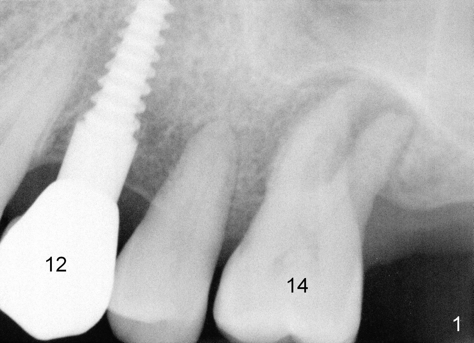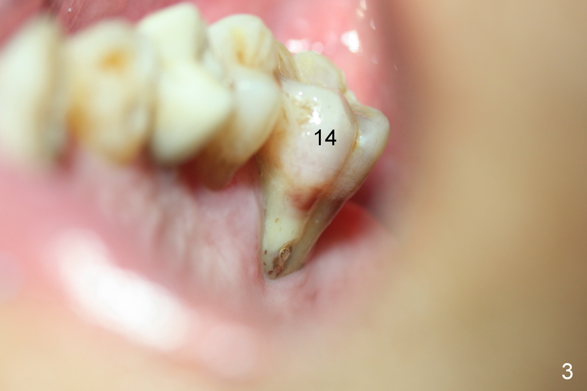 A 52-year-old man (DM) will return for #14 extraction and immediate implant nearly 2 years after #12 crown cementation. There is more bone loss distally than mesially. Clinically, the palatal recession is excessive (Fig.3). After socket debridement and 2% Xylocaine/1:50,000 Epinephrine gauze packing, osteotomy will be initiated in the buccomesial aspect of the septum, if the latter is present. Use 4.5 or 5x17 mm tap to test stability and more importantly determine how much thread exposure can occur palatally before placing a 14 or 17 mm long implant (Fig.2). A fair amount of bone graft will be inserted distopalatally (red circles in Fig.2). If primary stability is achieved, use an immediate provisional to close the socket opening.