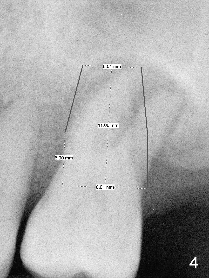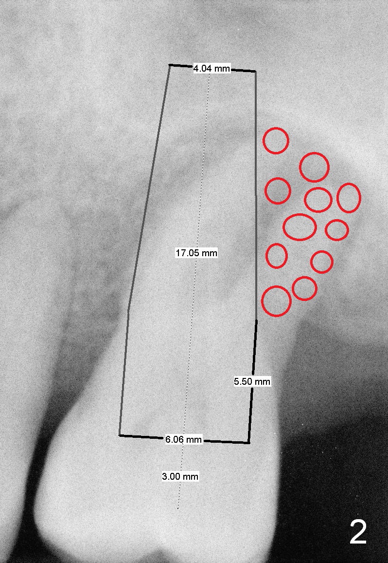 A large implant is place so that the mesiodistal dimension of the socket is obliterated by the implant (Fig.6 green circle). The buccal (Fib.5 B) and palatal gaps are filled with bone graft. It appears that either tapered (Fig4) or cylindrical (Fig.7) implant should be able to occupy the socket and obtain primary stability without perforating the sinus floor.