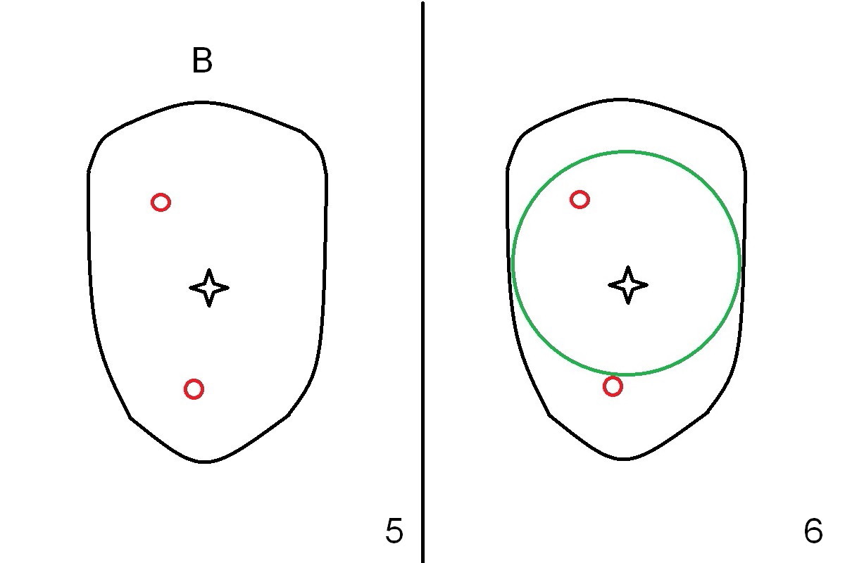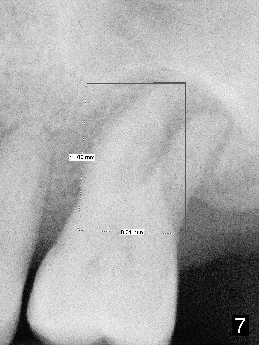 When the tooth is extracted, there is abundant granulation tissue in the socket. There is a perforation in the middle of the socket (Fig.5 (occlusal view of the socket) black star). A 2 mm osteotome is used to create an osteotomy palatally or buccally (Fig.5 red circles). The bone is less than 1 mm. As expected, the palatal wall is low. It appears that socket preservation is the treatment option. After placement of Osteotape in the bottom and palatal wall of the socket, allograft mixed with Osteogen is placed. The graft is covered by a 6-month collagen membrane, which is sutured in place. Implant placement is scheduled in 4-6 months. Although this is an acceptable treatment modality, it is not the best.