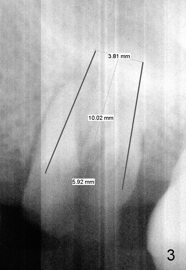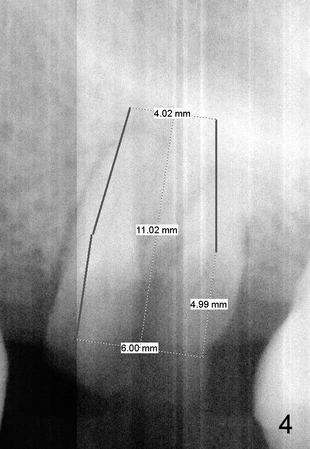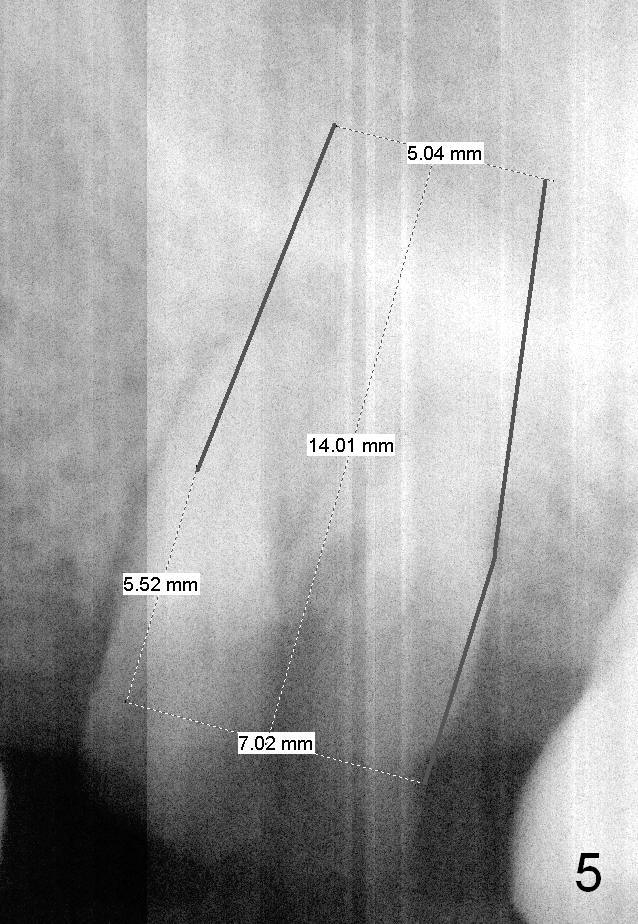 To place an implant in the center of the septum, the smallest pilot drill will be used for 6 mm. Insert a parallel pin with millimeter marks and take the 1st intraop PA. Change the trajectory if necessary. Combination of reamers and osteotomes will be used to enlarge the osteotomy, followed by taps and an implant.